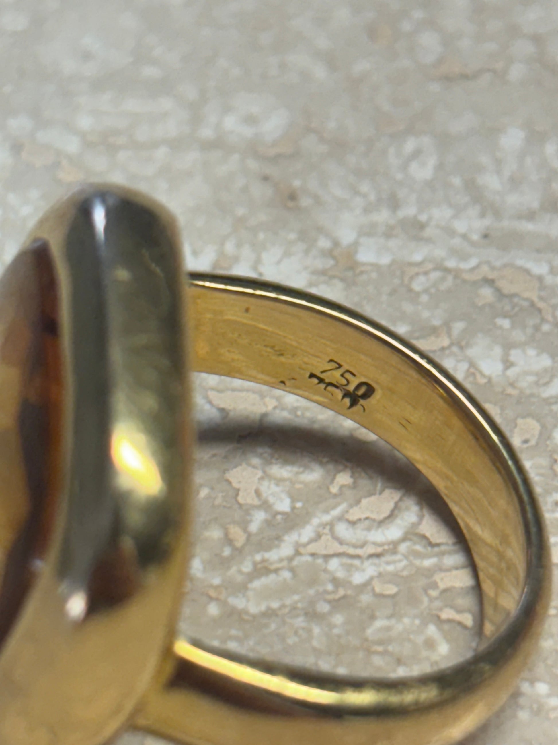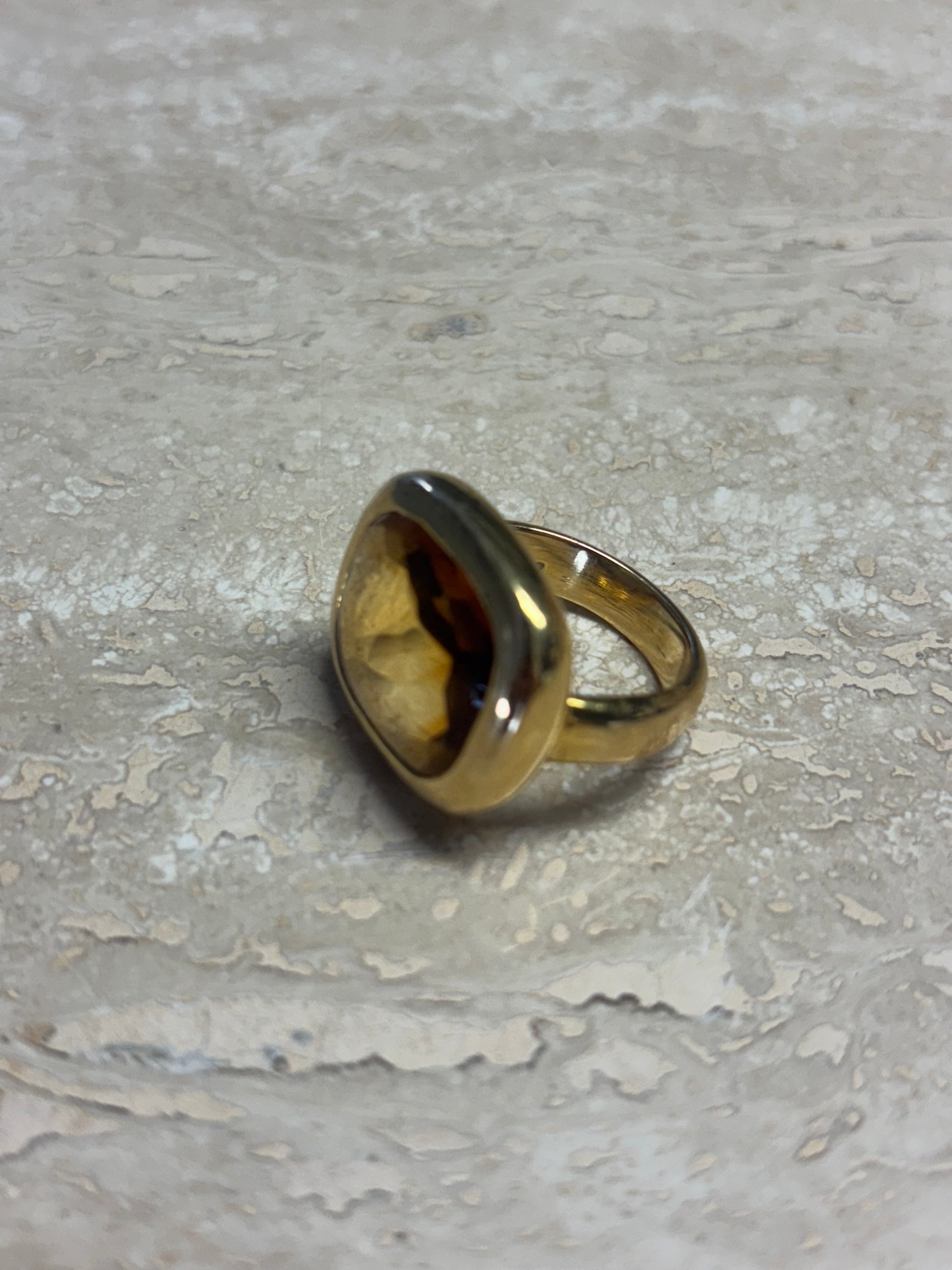 Cette élégante bague est ornée d'une citrine dorée chaude, taille coussin, sertie dans une monture lisse en or jaune 18 carats. La teinte ambrée miel de la pierre capte magnifiquement la lumière, créant un éclat radieux qui met en valeur le design épuré et moderne de l'anneau.