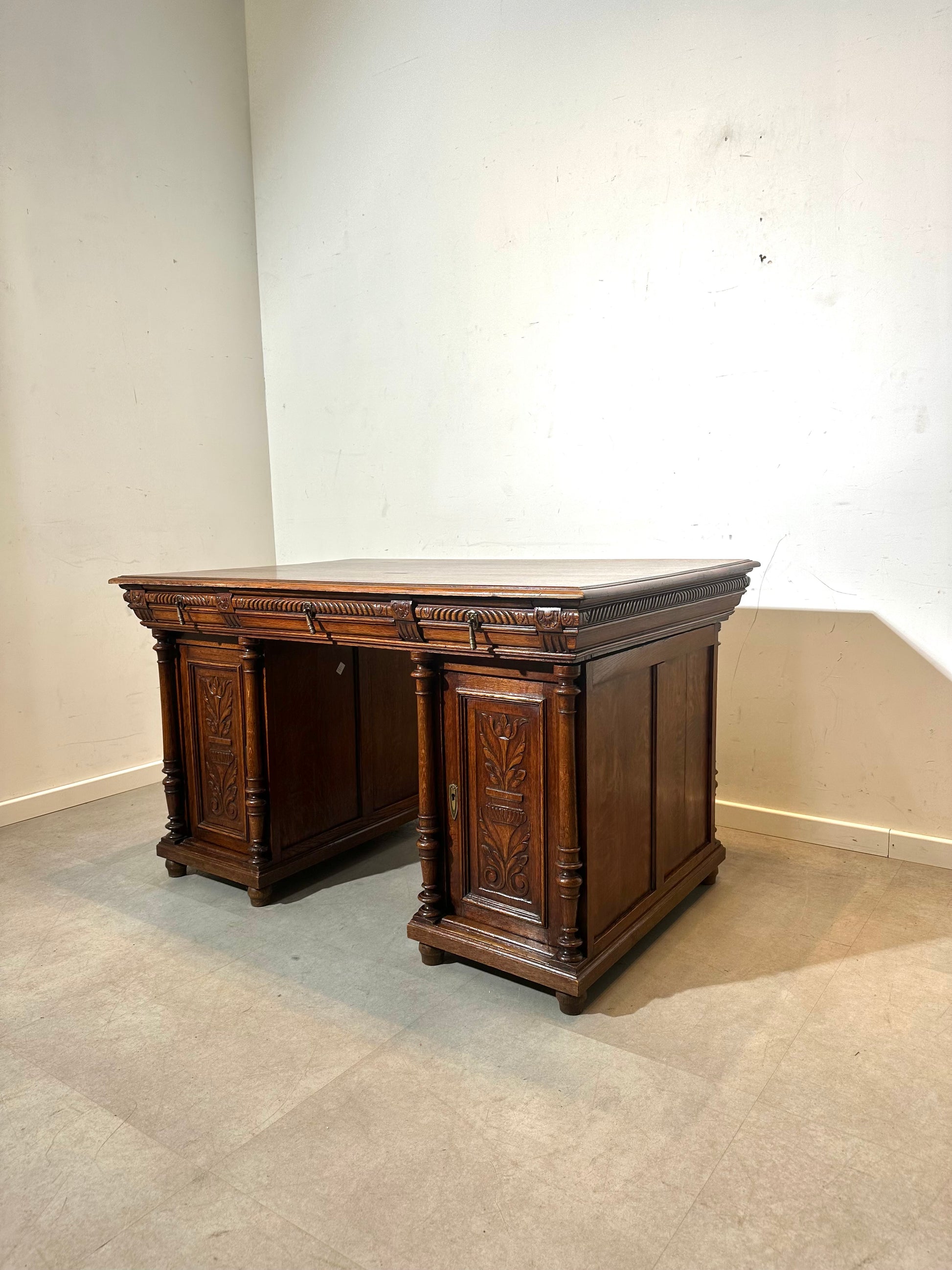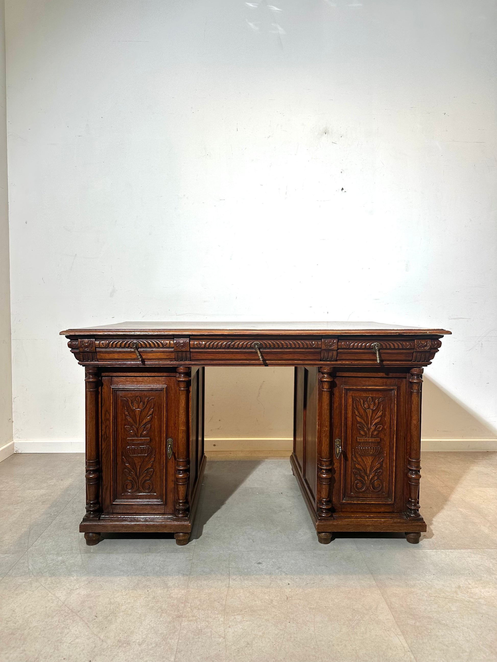 Magnifique bureau à piédestal du début du XXe siècle en chêne massif à la patine riche et chaleureuse. La frise présente des sculptures profondes réalisées à la main et des écussons en laiton d'origine, accompagnés de leurs clés. Chaque piédestal arbore des panneaux latéraux, des colonnes balustres tournées et des sculptures florales et d'urnes, conférant à la pièce une allure architecturale affirmée. Un plateau généreux offre un espace de travail confortable, tandis que l'espace pour les jambes assure un confort optimal au quotidien. Un bureau d'exception qui trouvera parfaitement sa place dans un bureau à domicile, une bibliothèque ou une boutique.