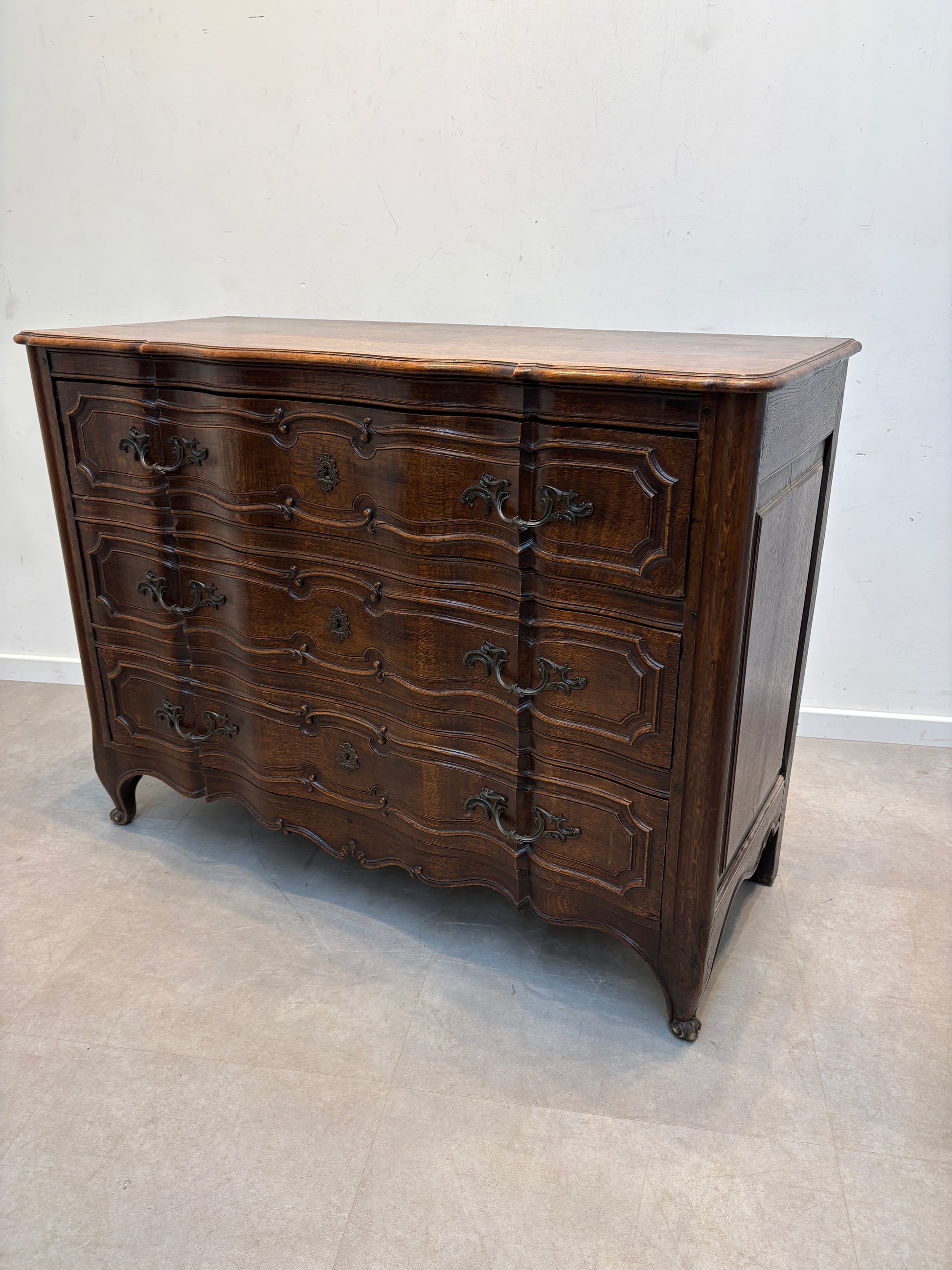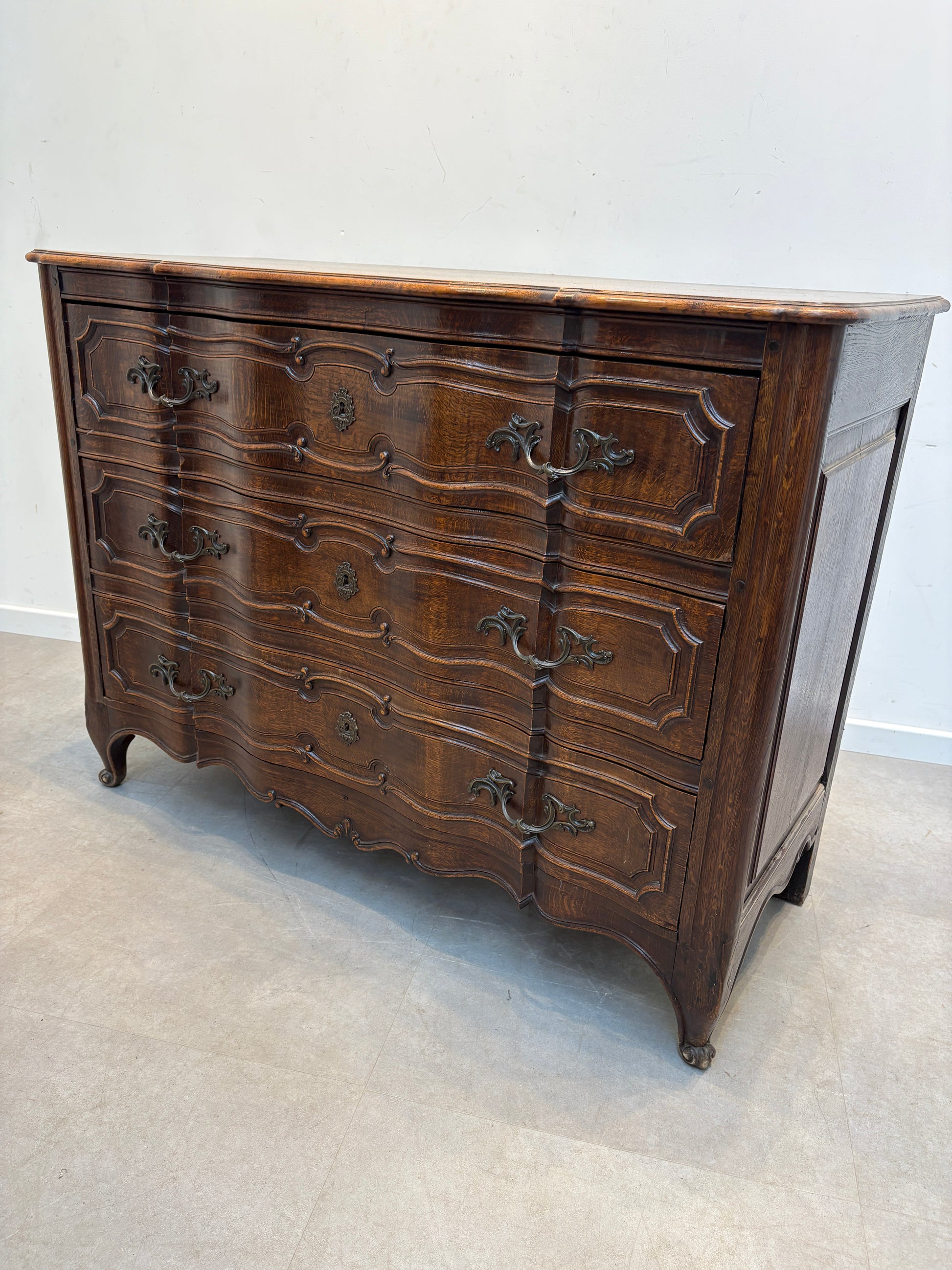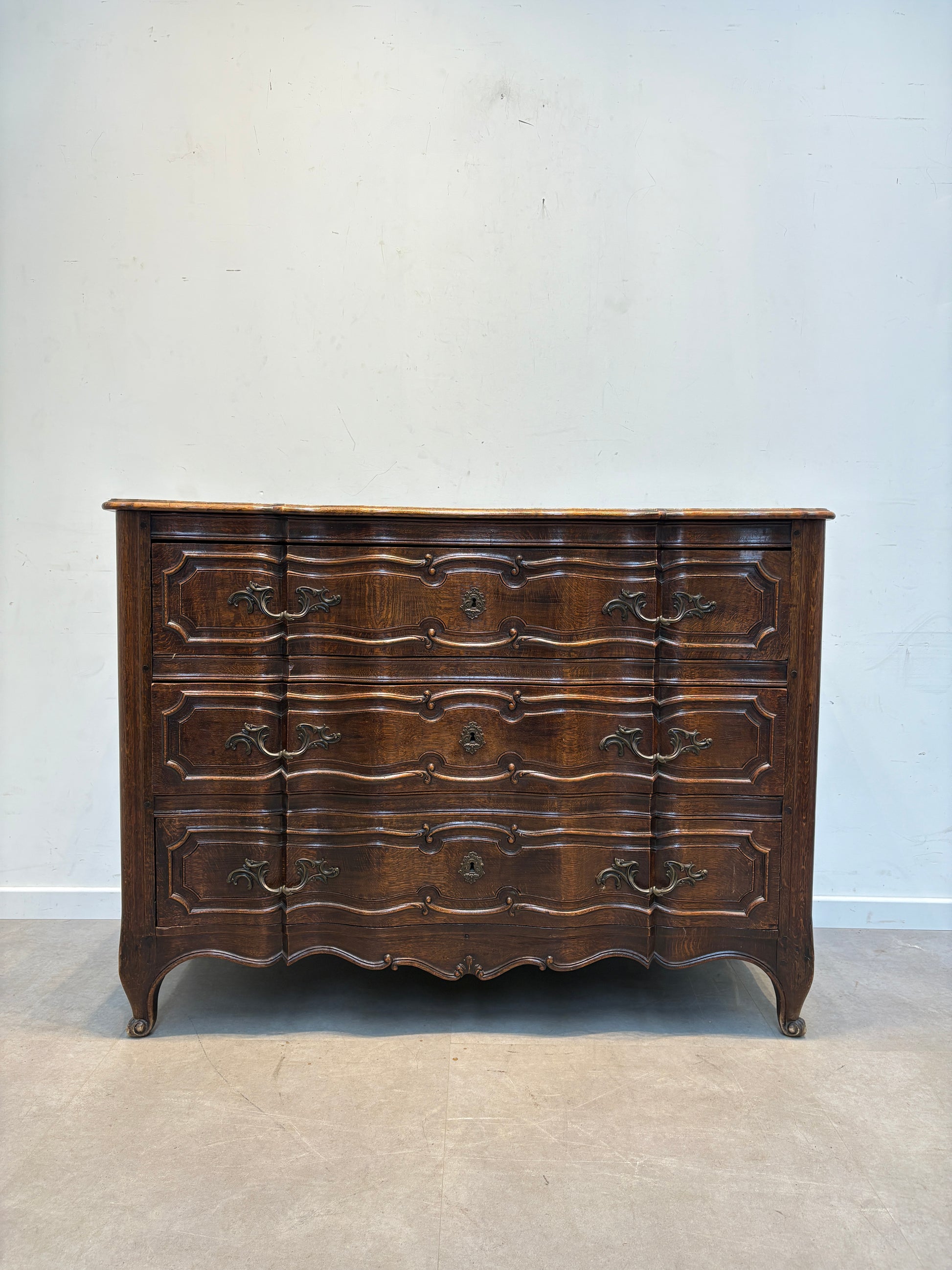 Cette exquise commode ancienne française illustre à merveille l'élégance de l'époque Louis XV. Réalisée en chêne massif, elle présente une façade bombée aux courbes gracieuses. La commode est ornée de montures en bronze doré (ormolu) finement travaillées.