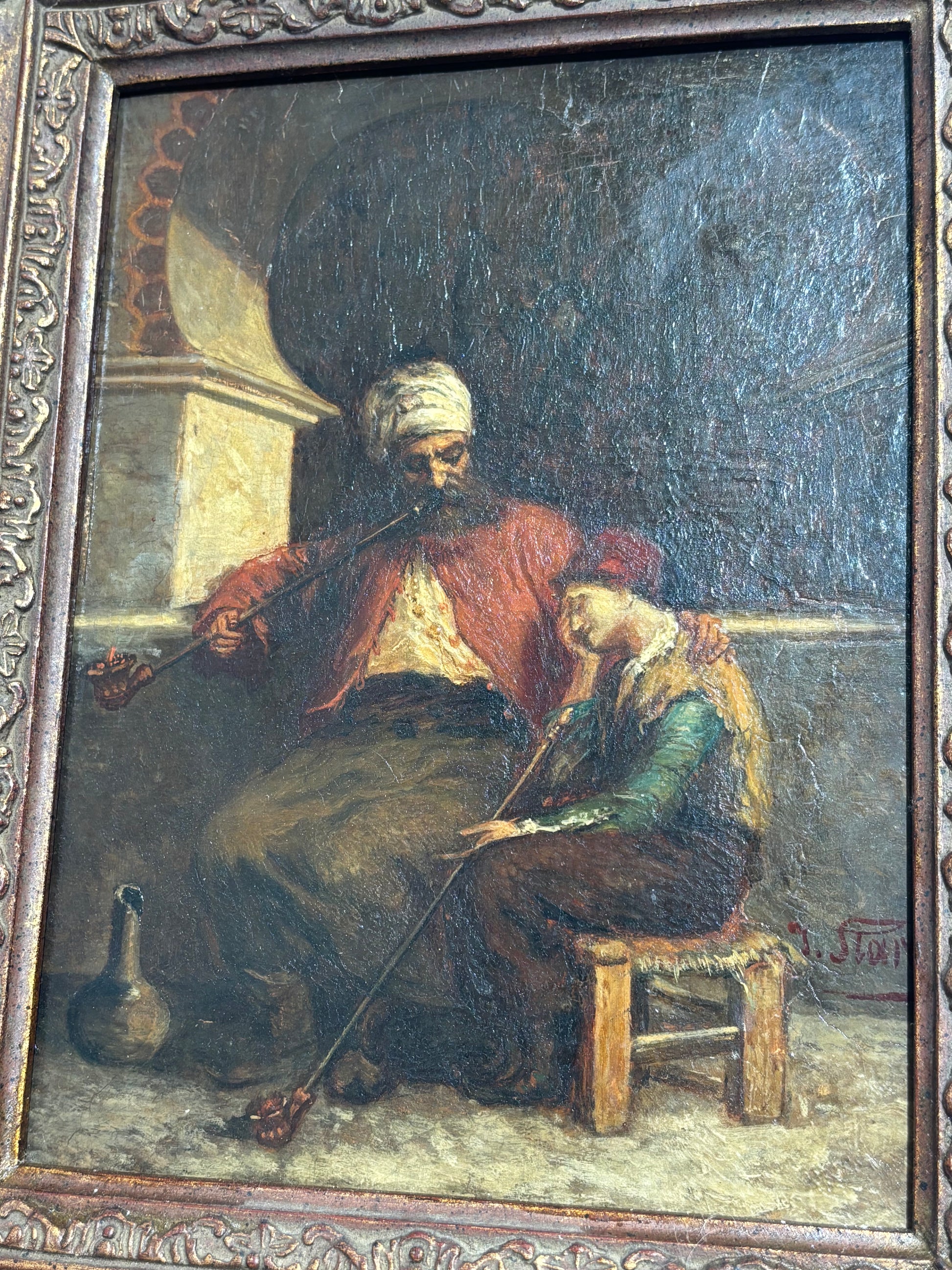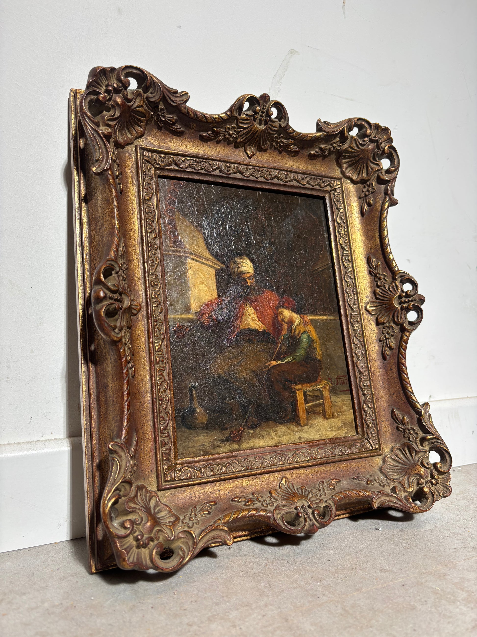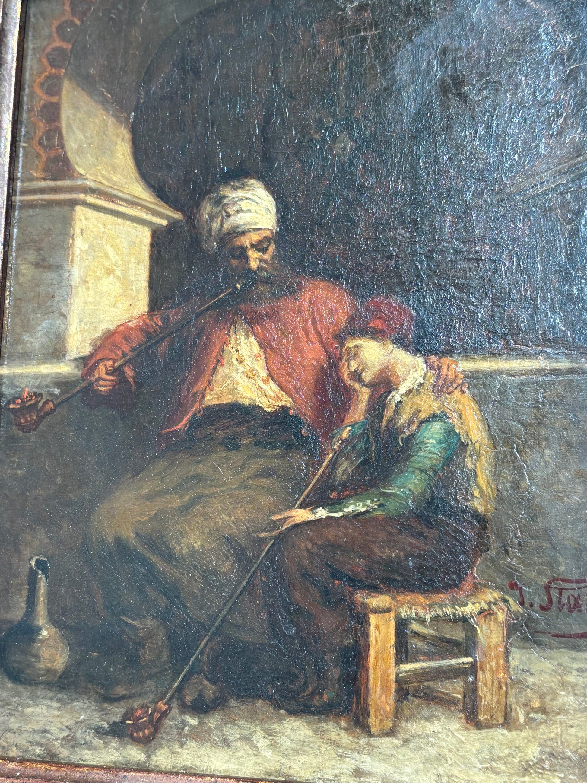 Cette exquise huile sur panneau du XIXe siècle est attribuée à Julius Joseph Gaspar Starck (1814-1884), peintre autrichien renommé pour ses scènes de genre et ses portraits orientalistes. D'une grande finesse et d'une riche profondeur tonale, la composition saisit un moment d'intimité dans un intérieur orientaliste, représentant peut-être un vieil homme fumant la pipe et un jeune garçon, assis près d'une cheminée ou d'une arche. La palette chaude et la texture du pinceau témoignent de la maîtrise de Starck en matière d'atmosphère et de caractérisation.