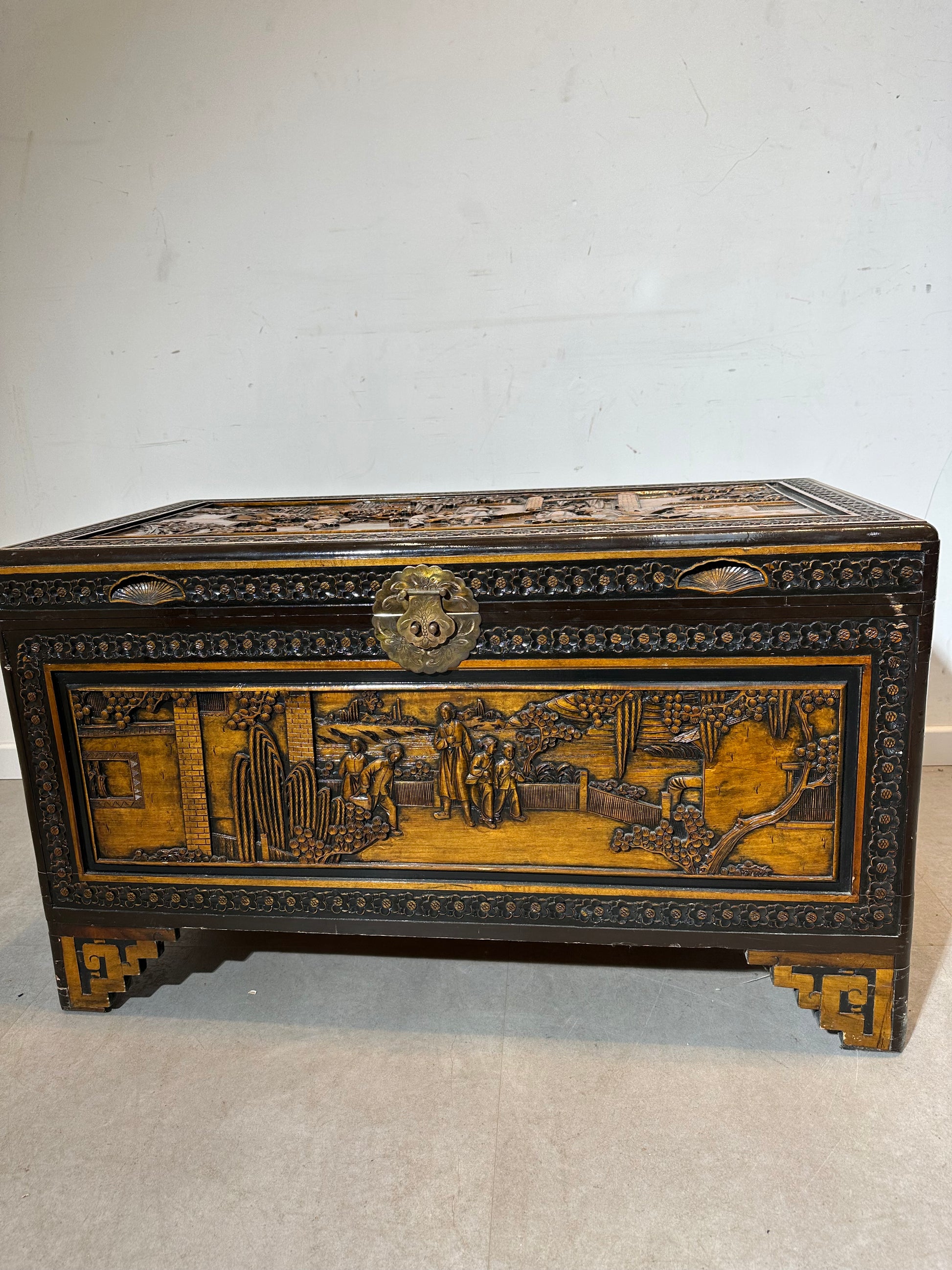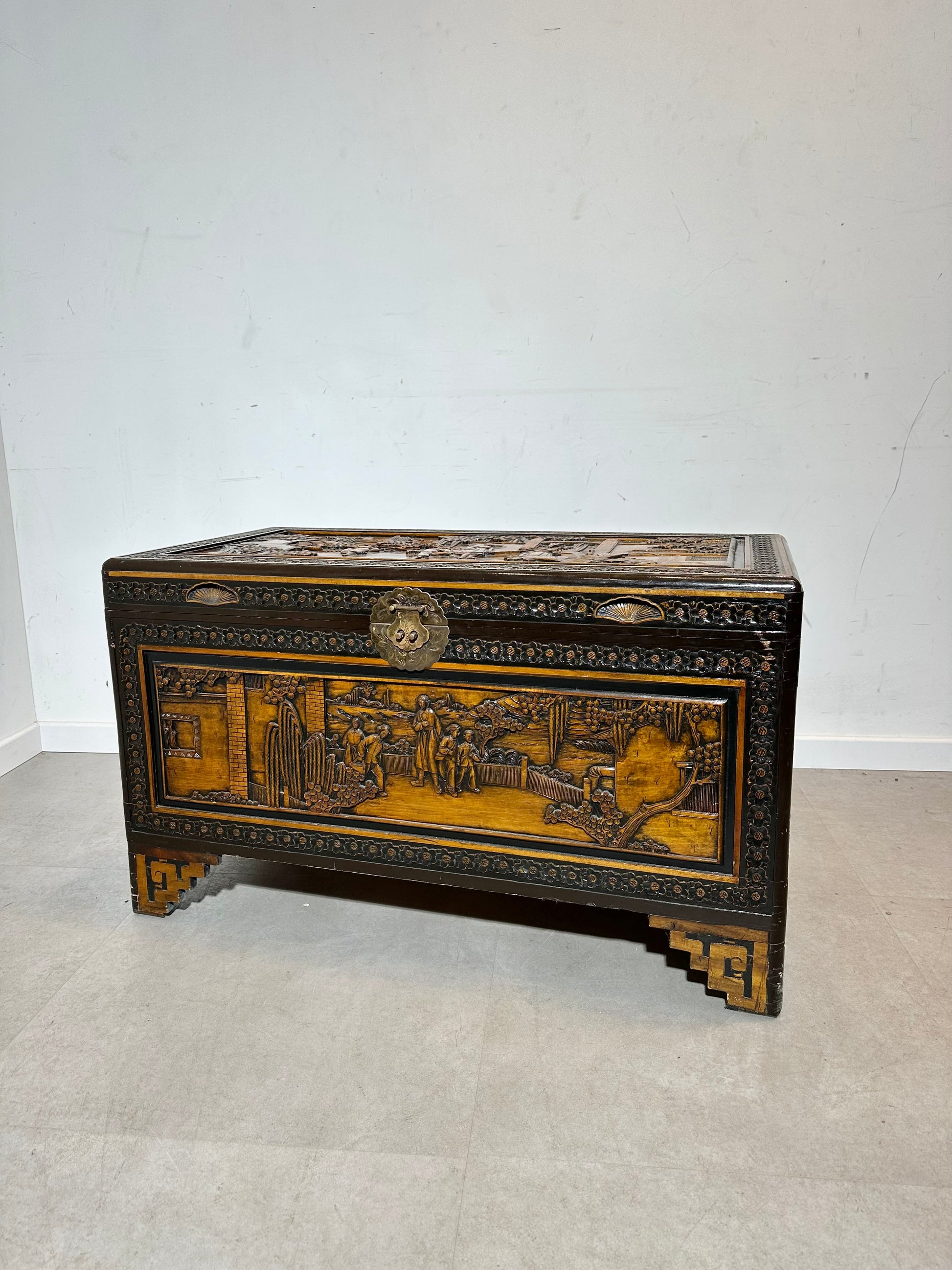 Ce magnifique coffre aux détails raffinés présente des panneaux finement sculptés à la main, représentant des scènes orientales traditionnelles avec des personnages, des paysages et des motifs floraux. Véritable pièce maîtresse alliant art et fonctionnalité, il est idéal comme meuble de rangement, table basse ou élément décoratif.