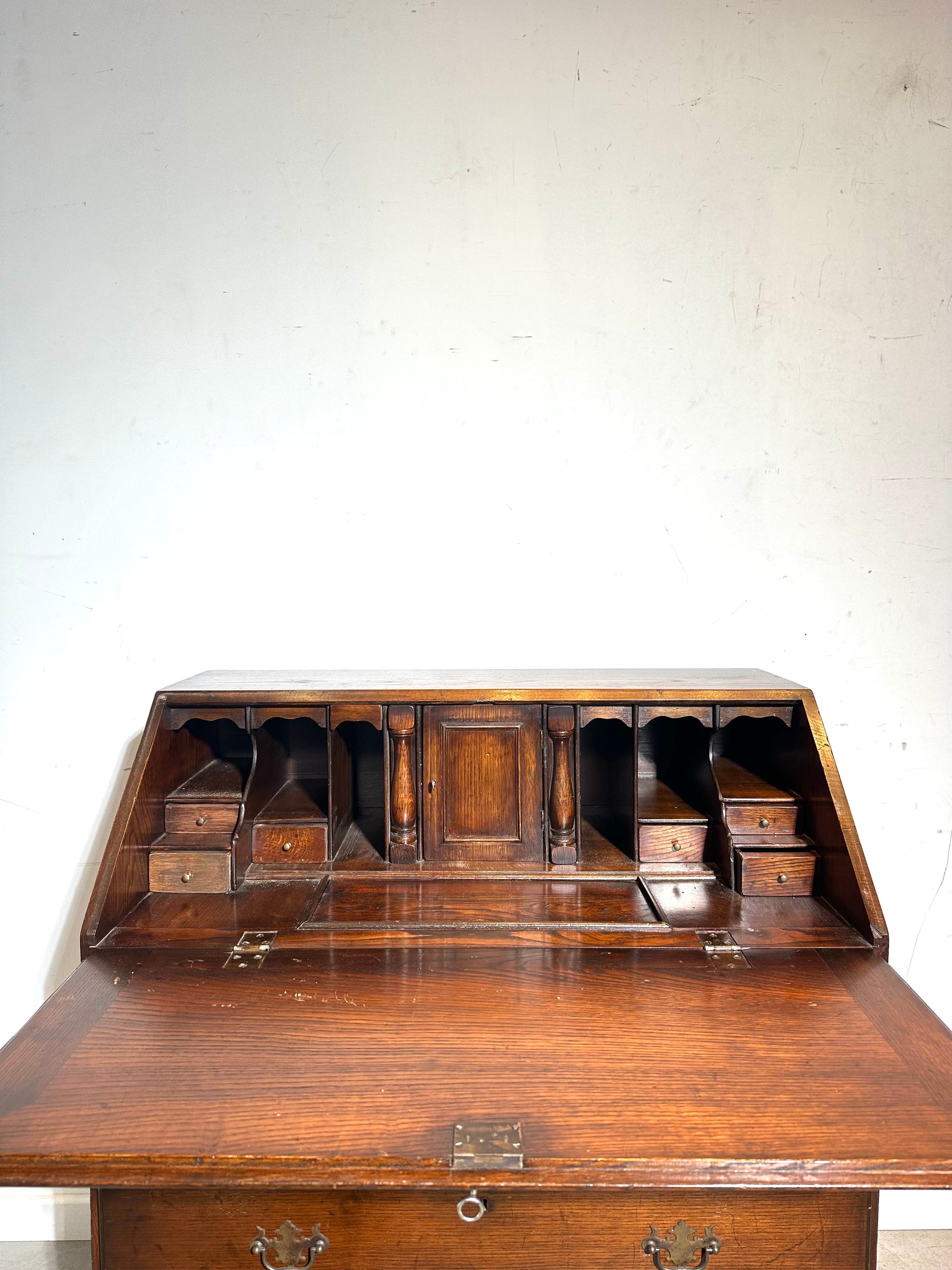 Sous le rabat d'écriture, le meuble offre quatre tiroirs spacieux avec poignées en laiton d'origine, offrant un espace de rangement généreux.