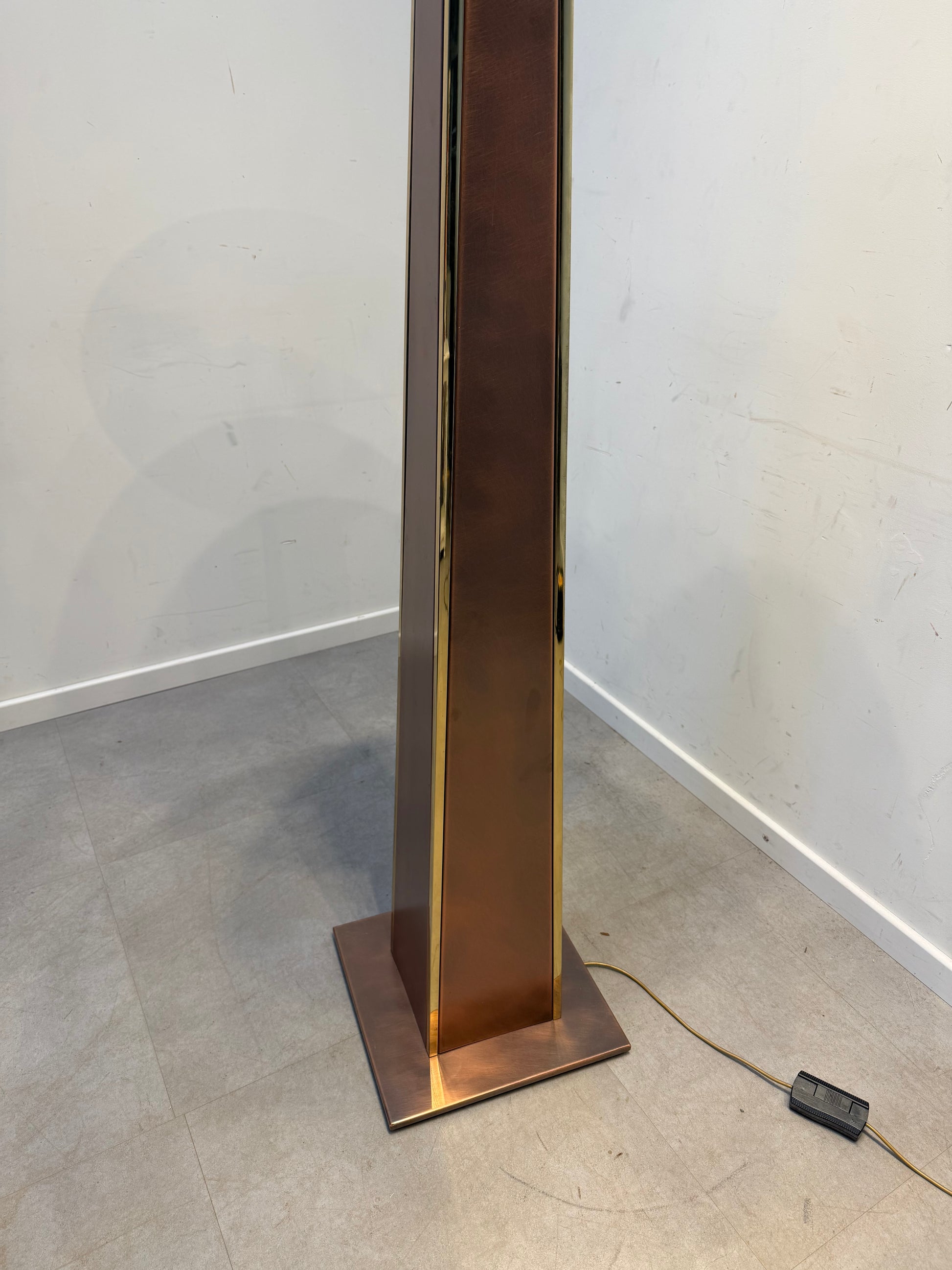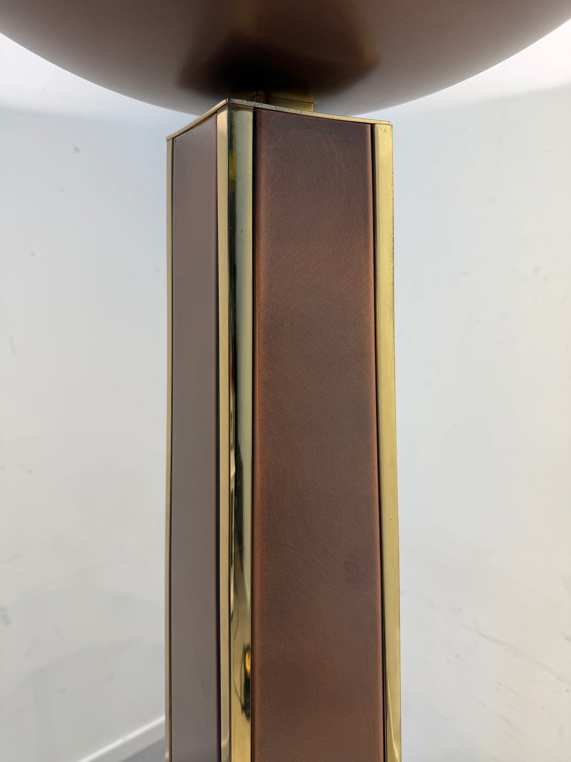 Cette pièce architecturale élancée présente une base pyramidale en bronze laqué ornée de garnitures en laiton poli, surmontée d'un diffuseur en forme de bol orienté vers le haut qui projette une douce lumière d'ambiance.