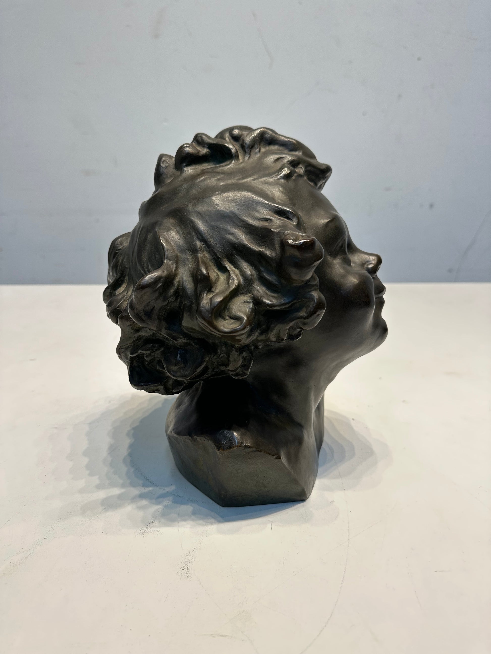Un buste en bronze finement ciselé représentant la tête d'un jeune enfant aux boucles délicates et au regard serein tourné vers le ciel. Cette sculpture expressive capture avec brio l'innocence et la vitalité, grâce à une remarquable attention portée aux détails des cheveux et des traits du visage.
