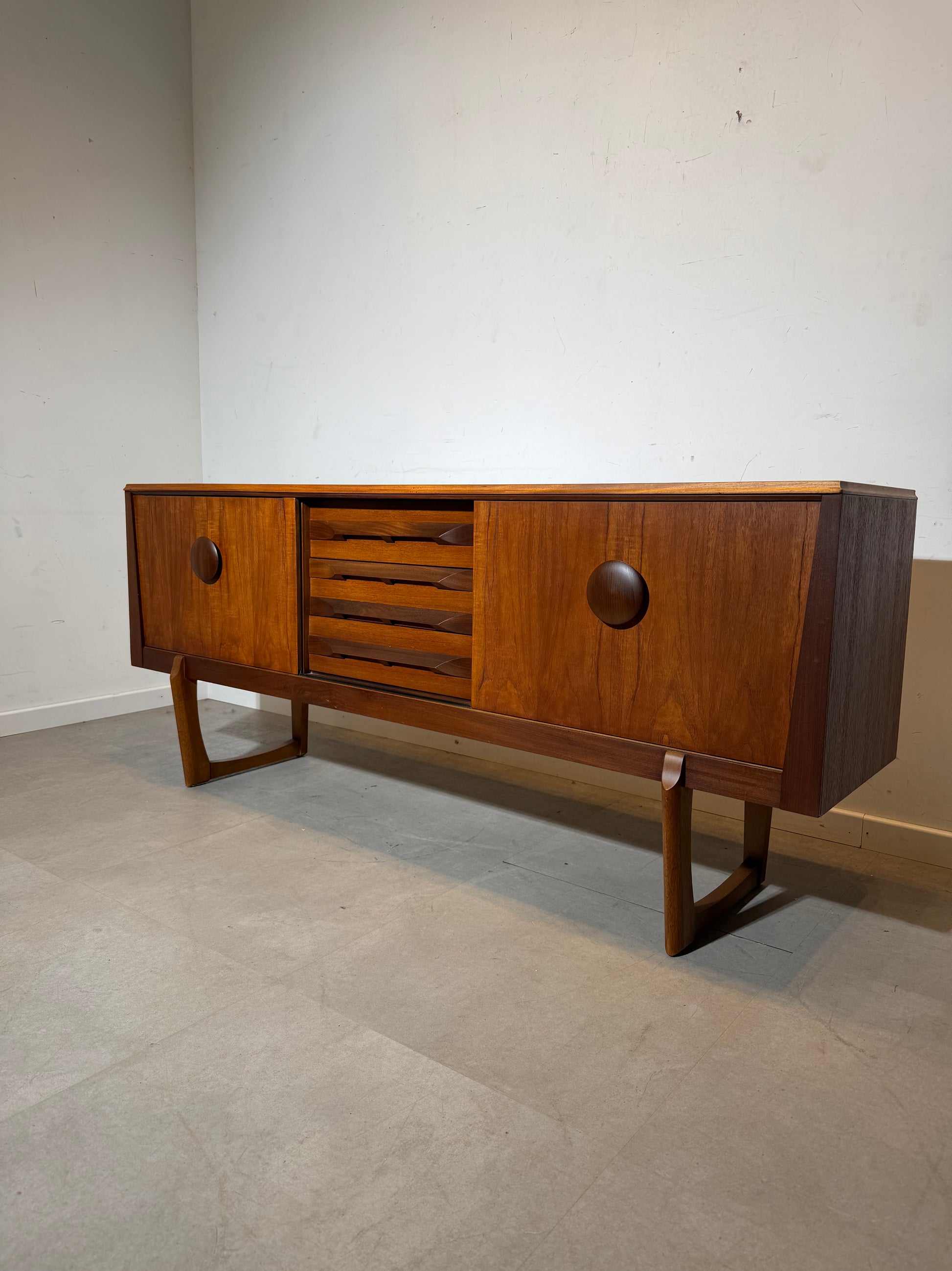 Un buffet en teck Elliotts of Newbury remarquable et très recherché, illustrant les lignes sculpturales et le savoir-faire novateur qui ont fait la renommée de la marque britannique dans les années 1960. Ce modèle se distingue par ses pieds architecturaux, ses poignées circulaires audacieuses et son élégant tiroir à persiennes.