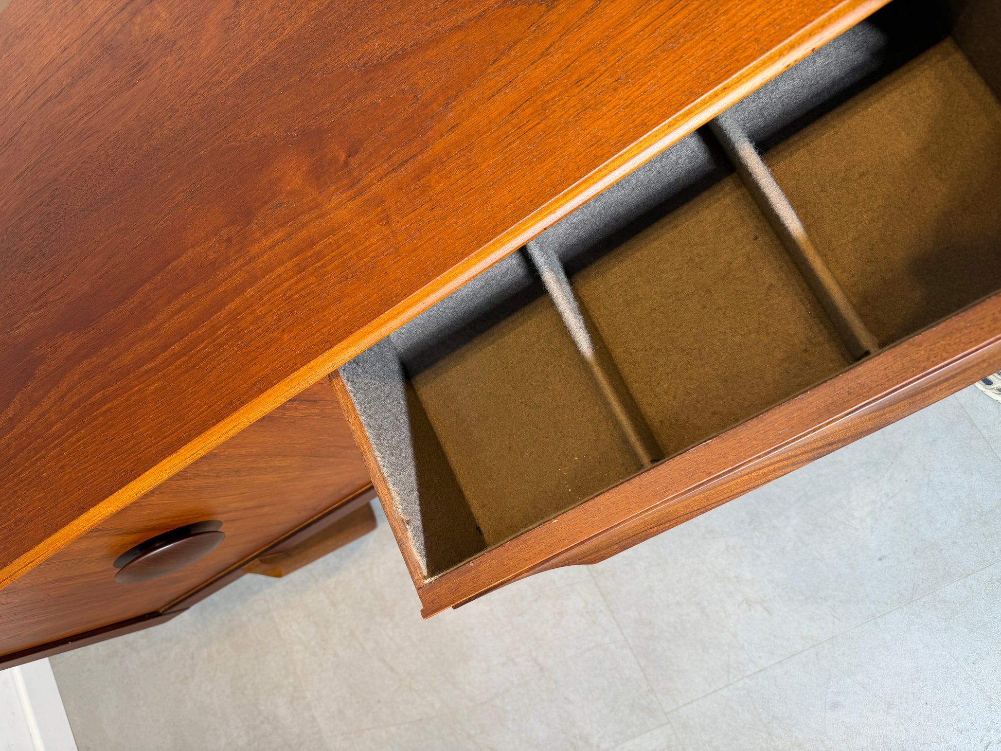 - Deux grands compartiments d'armoires avec poignées rondes emblématiques en teck massif