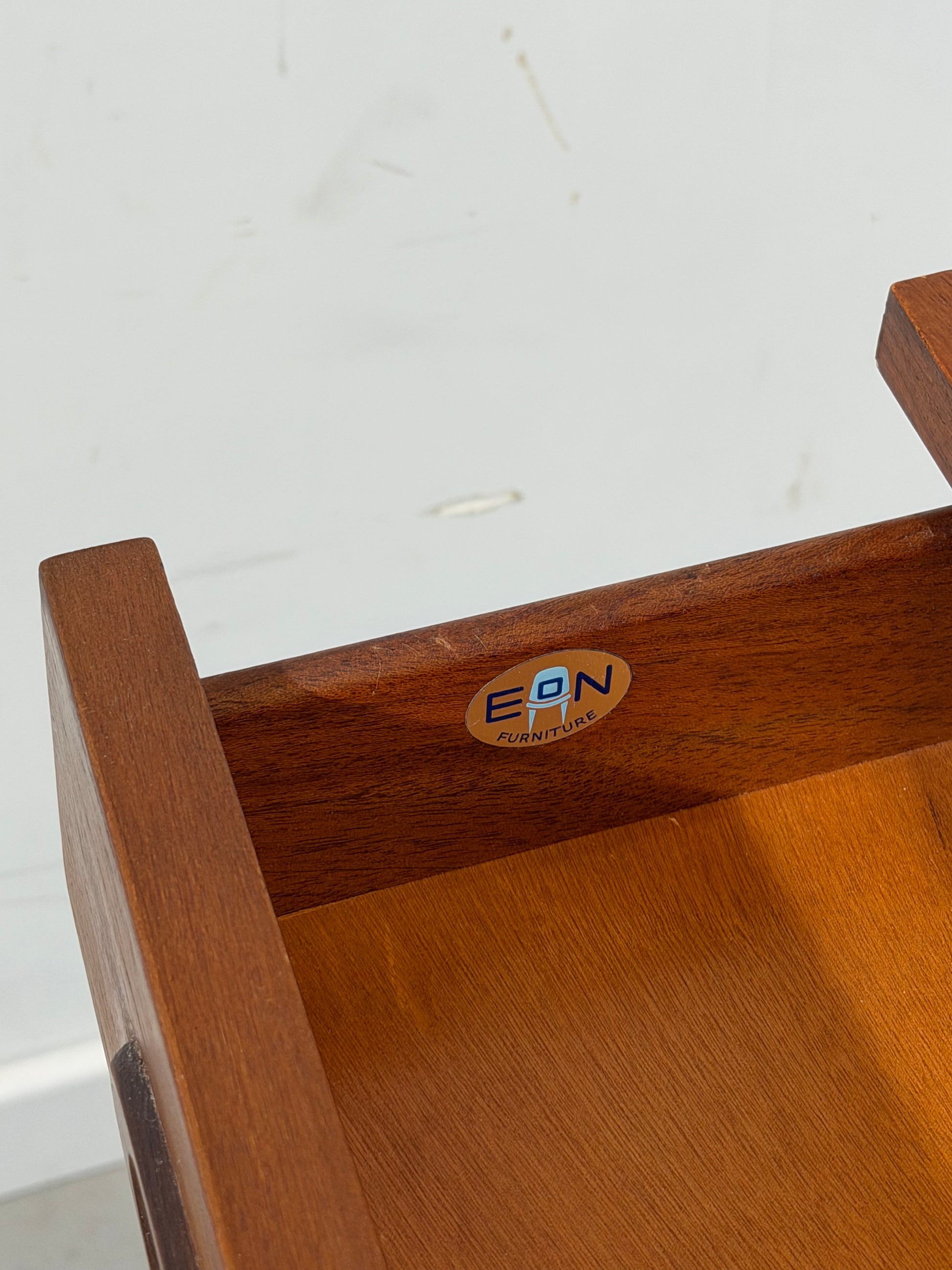 Un magnifique buffet Elliotts of Newbury du milieu du XXe siècle, orné des détails sculptés emblématiques de la marque, d'un riche placage en teck et de proportions élégantes. Ce modèle se distingue par ses poignées de tiroir aux courbes harmonieuses et son bord avant doux et arrondi, signature du savoir-faire raffiné d'EoN.