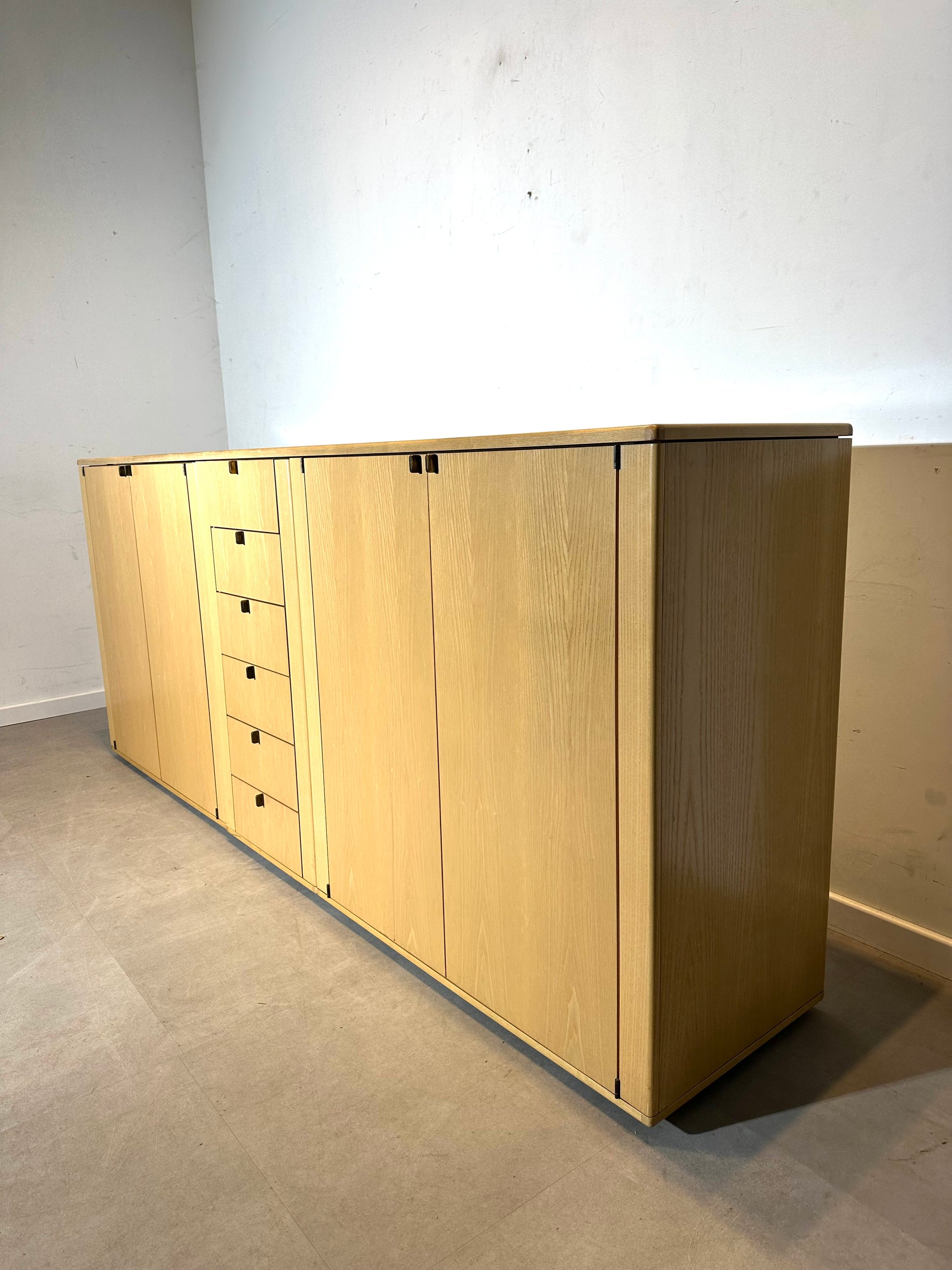 Ce buffet impressionnant arbore une silhouette minimaliste et épurée, sublimée par une finition chêne clair, alliant élégance et robustesse. D'une longueur de 240 cm, il offre un espace de rangement généreux grâce à ses multiples compartiments et sa colonne centrale de six tiroirs.