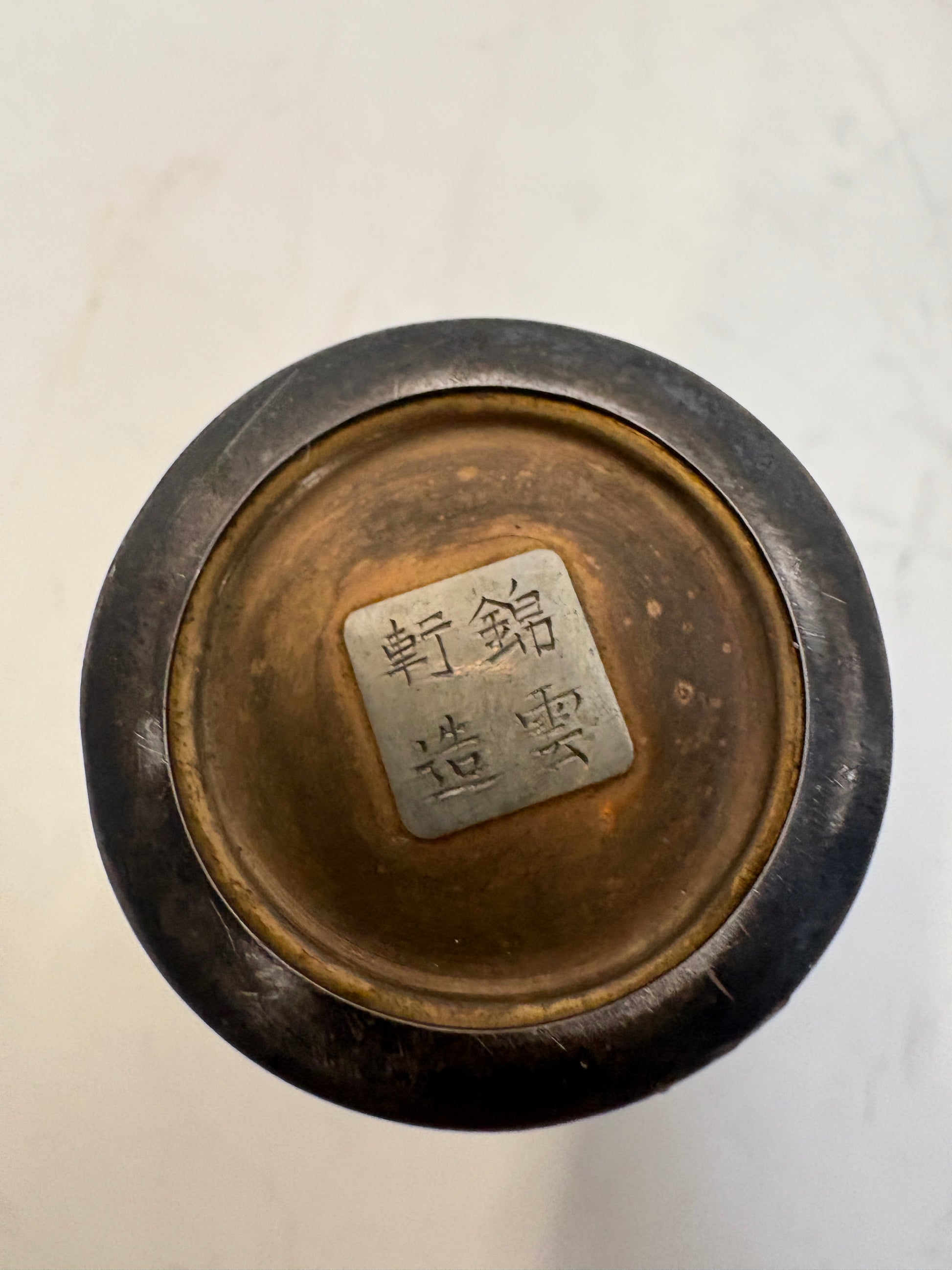 Ce vase présente un fond sombre raffiné, orné d'incrustations d'émail coloré et d'un travail de cloisonné d'une grande finesse qui souligne le motif avec précision. Une véritable pièce de collection, empreinte d'authenticité et de savoir-faire.