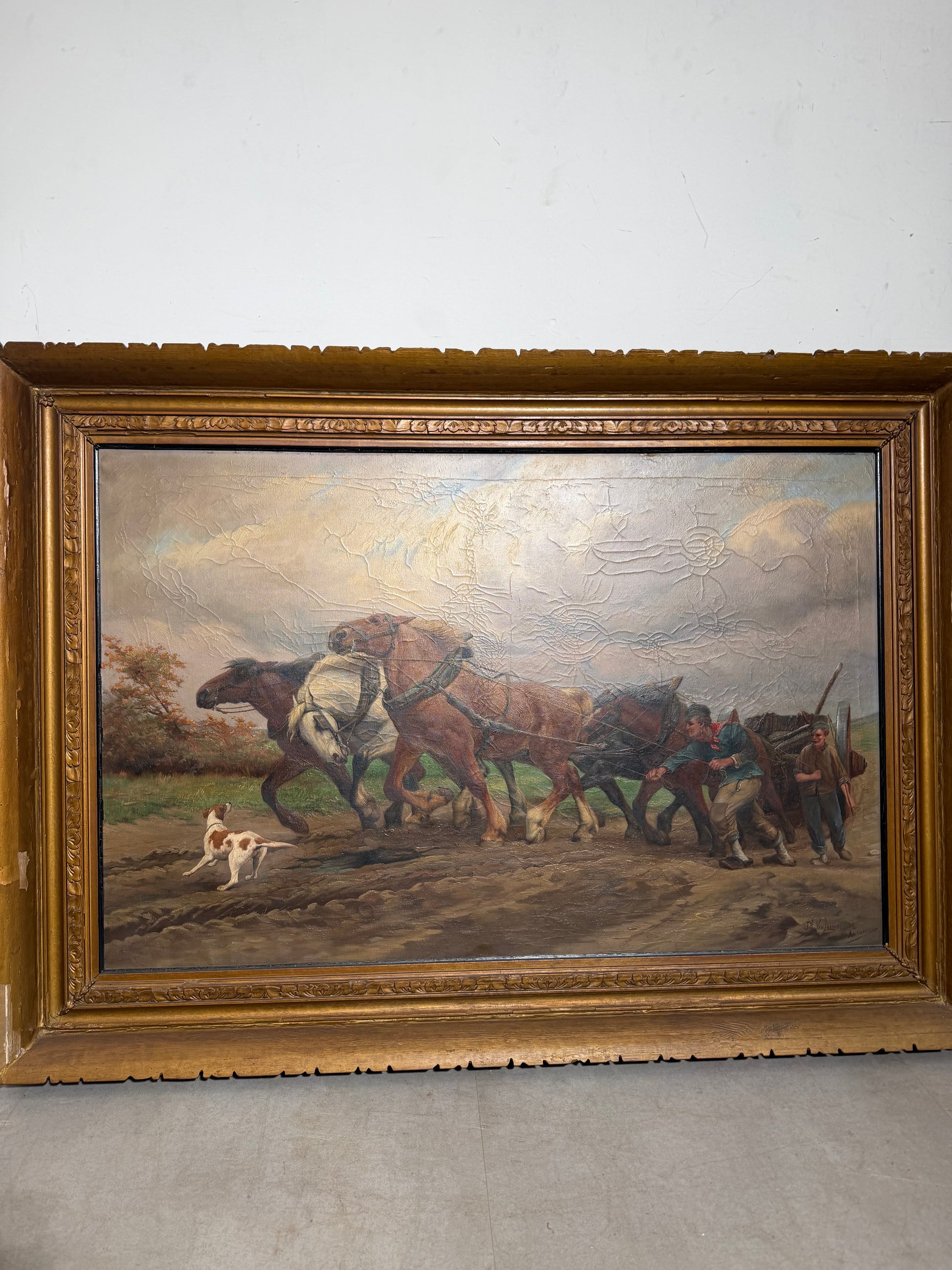 Jef Van Leemputten (Anvers, 1865–1948) – Grande huile sur toile « Chevaux de ferme au travail »