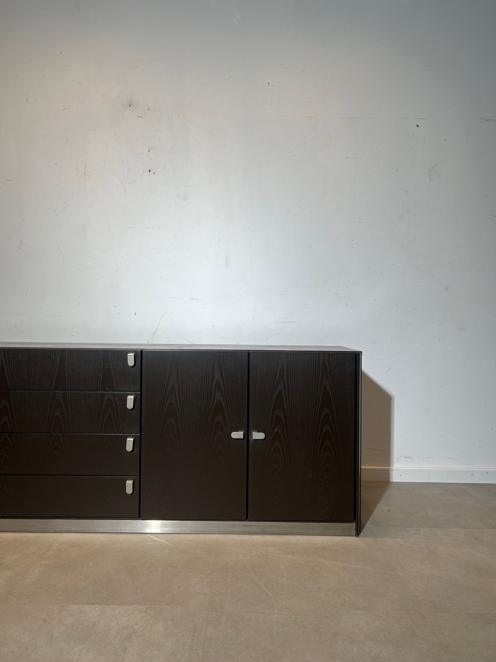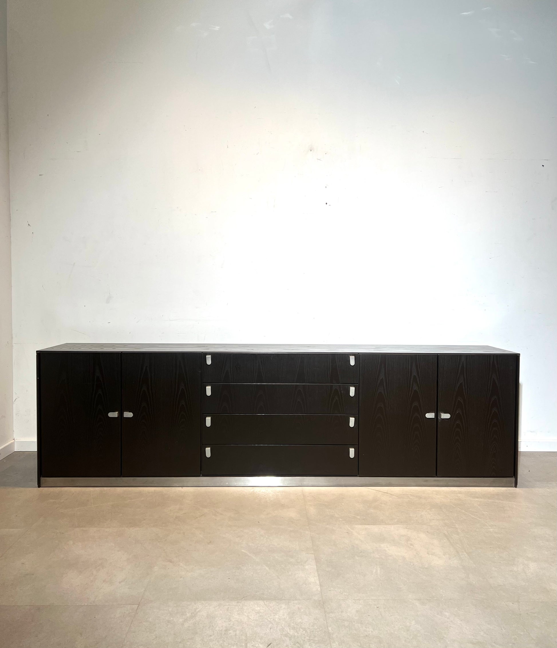 Impressive extra-long modernist sideboard executed in dark stained oak veneer with a beautiful pronounced grain pattern. The cabinet stands on a brushed steel plinth which gives it a very architectural and almost brutalist appearance.