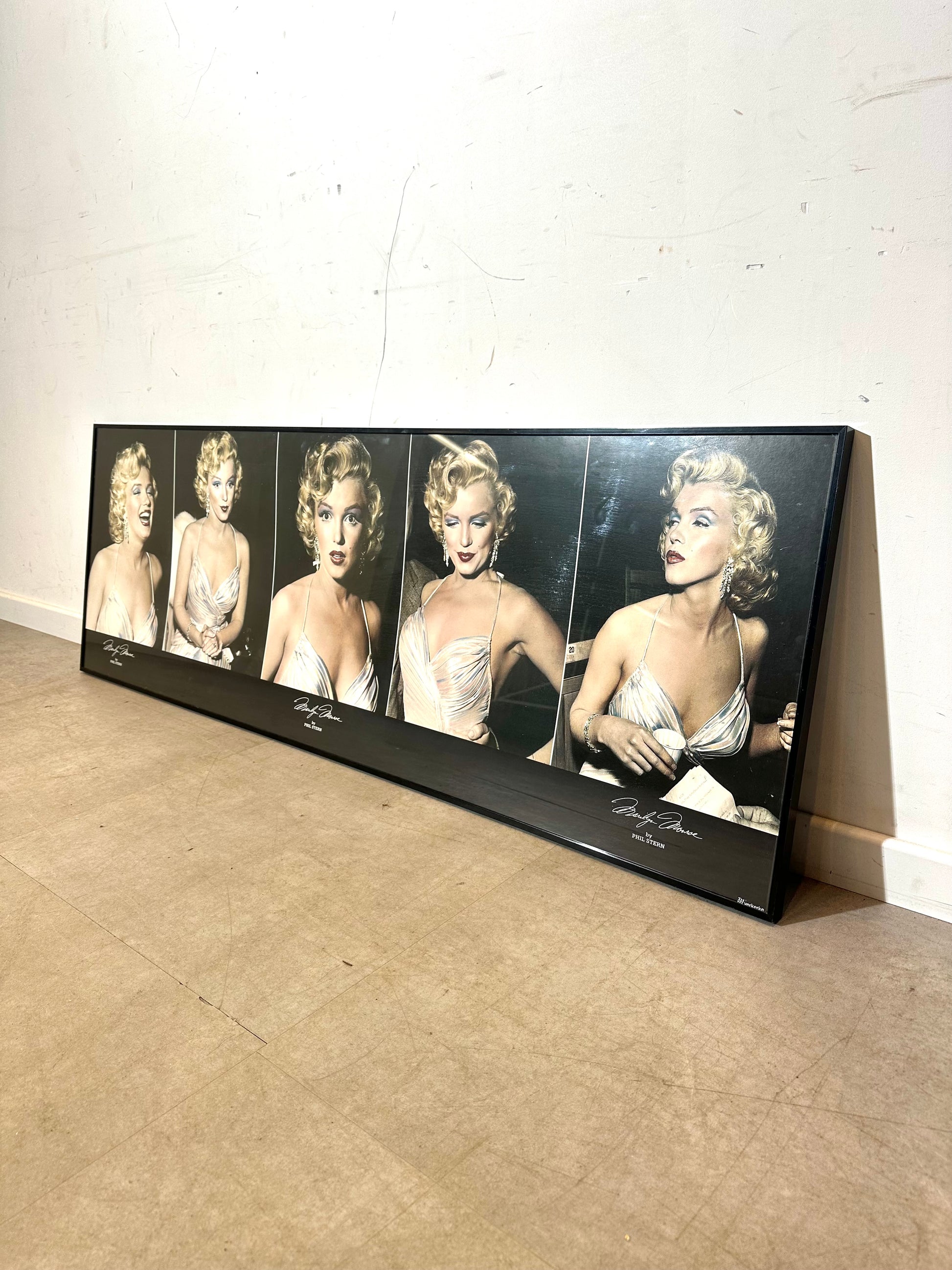 Grand collage photographique encadré de Marilyn Monroe, composé de cinq portraits iconiques réalisés par le célèbre photographe hollywoodien Phil Stern. Réputé pour ses clichés intimistes des coulisses de l'âge d'or d'Hollywood, Phil Stern a su immortaliser Marilyn avec une rare spontanéité. Cette œuvre est un magnifique hommage à son élégance et à son charisme intemporels.