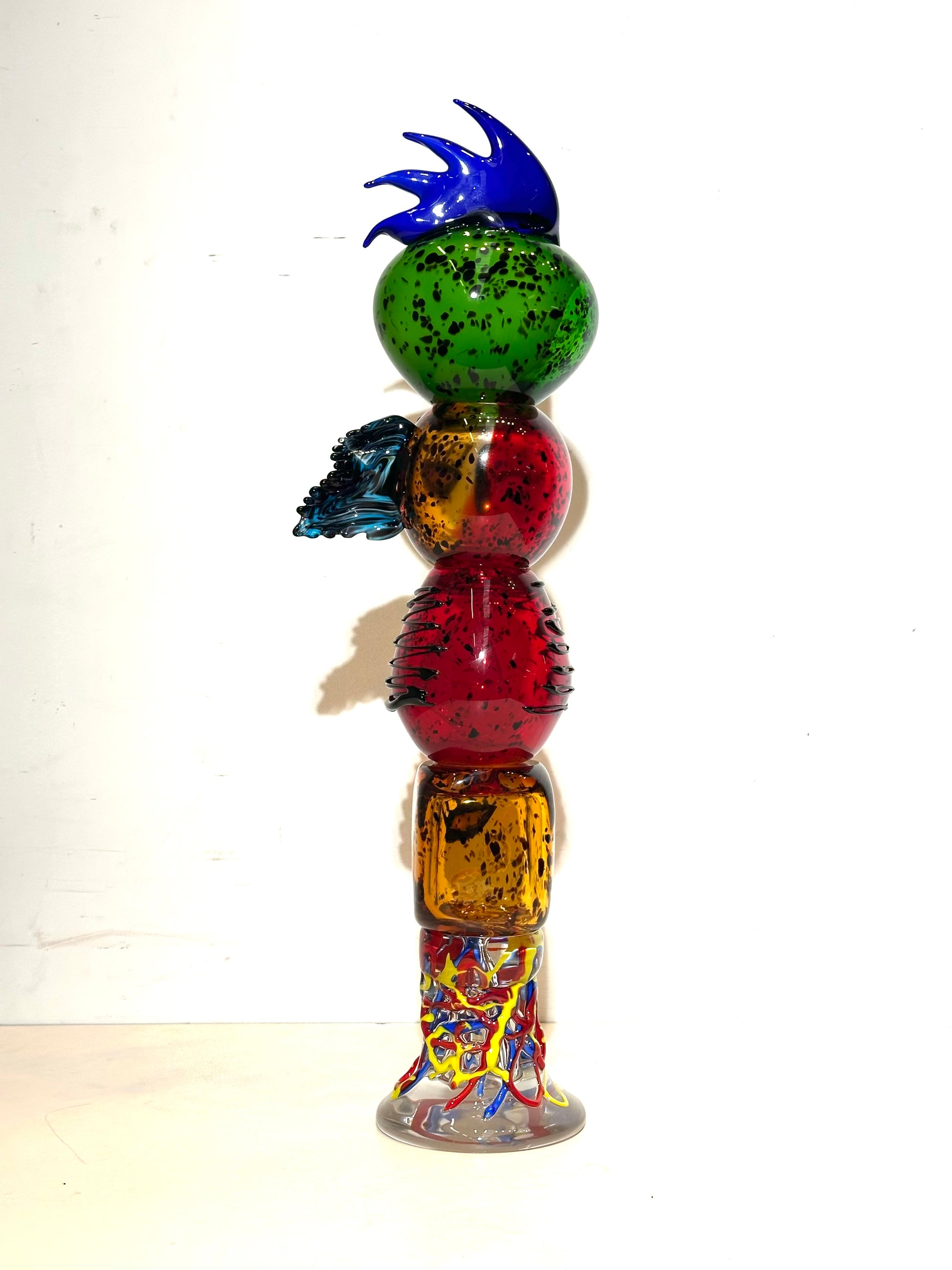 Une sculpture totem spectaculaire en verre de Murano, composée de formes géométriques et organiques superposées aux couleurs vibrantes. Chaque section est unique, alliant couches transparentes, pigmentation intense et détails de surface complexes : visages expressifs, protubérances dynamiques et motifs abstraits.