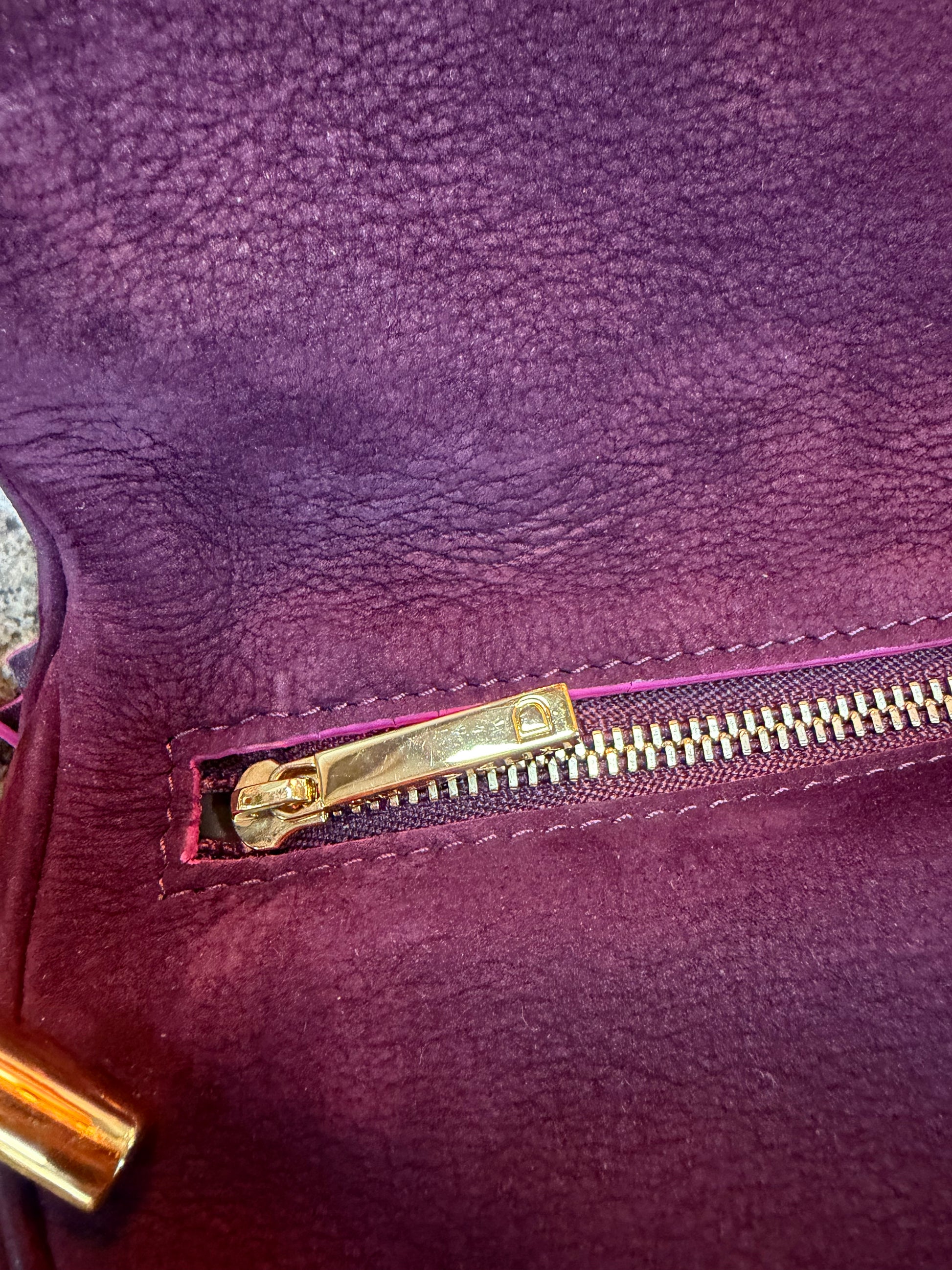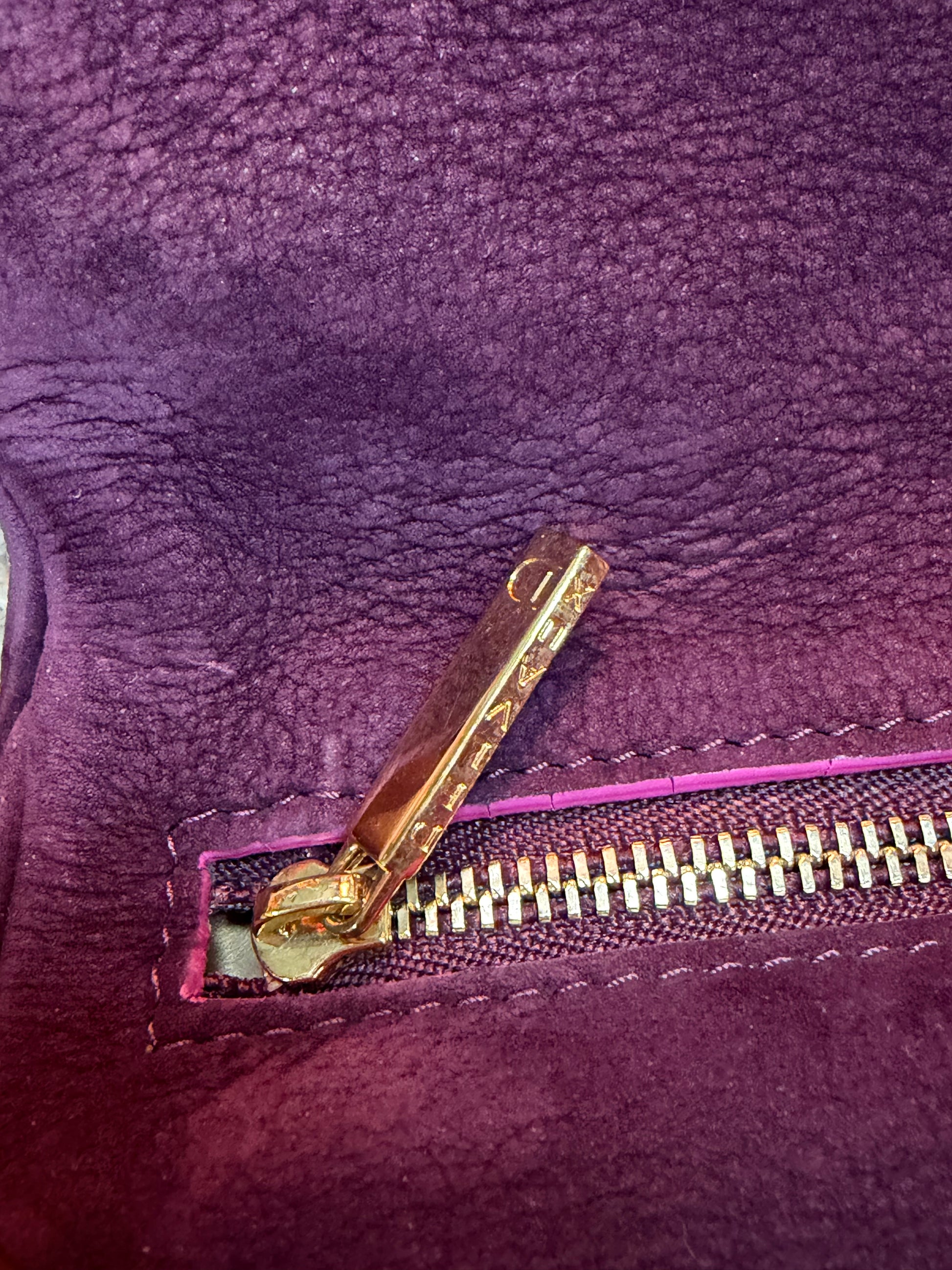 Sac Delvaux Givry en nubuck violet avec détails roses – Fermoir doré – 30 x 24 cm