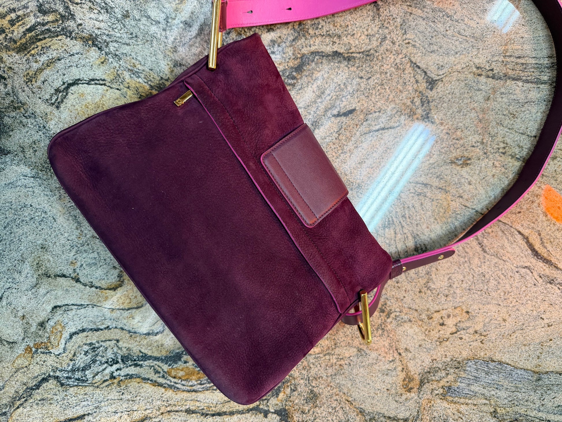 Confectionné en luxueux cuir nubuck violet, ce sac est magnifiquement rehaussé de détails rose vif et d'éléments métalliques dorés, alliant élégance et touche ludique.