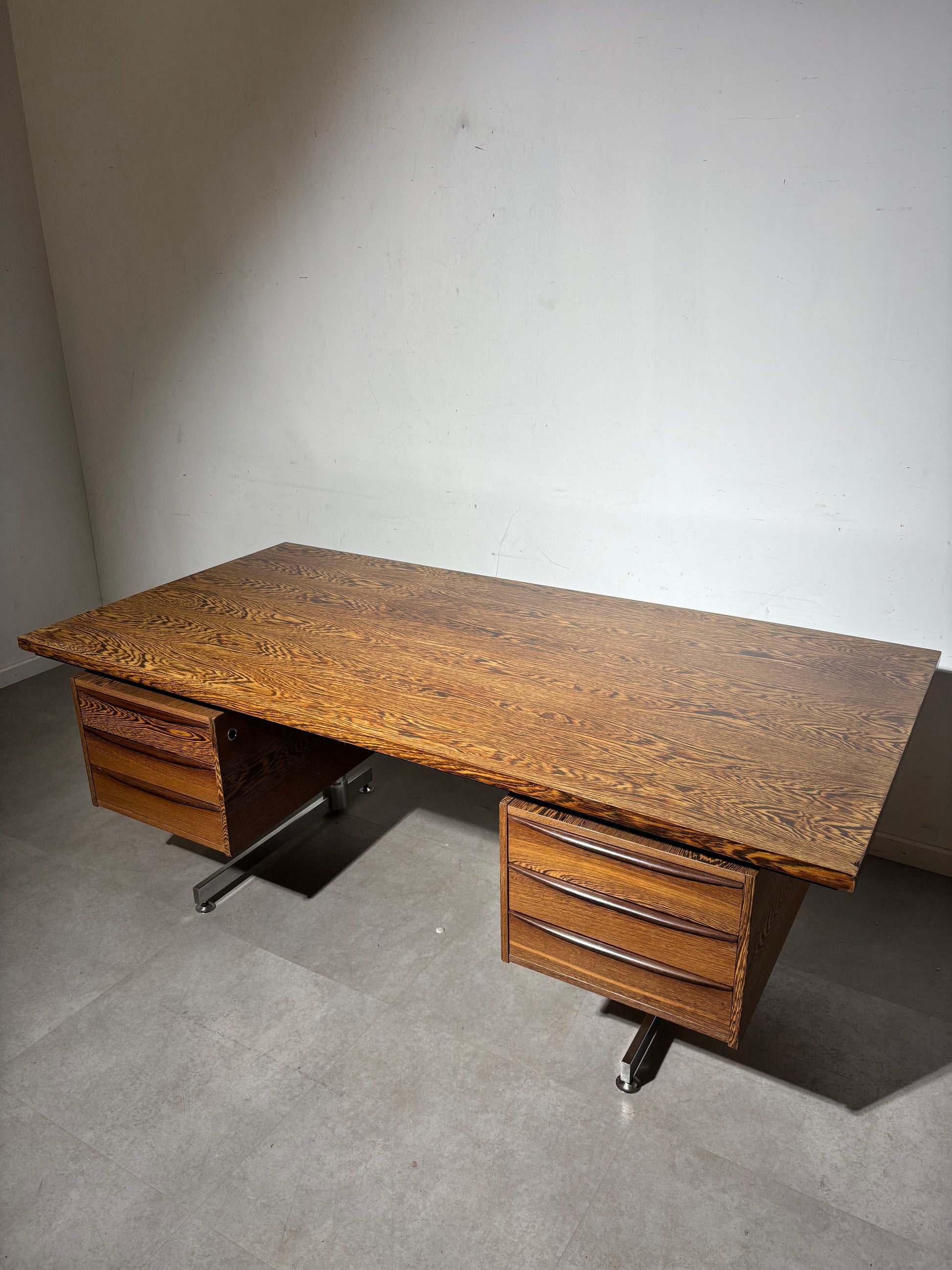 Magnifique bureau de direction vintage en palissandre de Rio aux riches veinures, datant des années 1970. Ce meuble spacieux présente un plateau flottant soutenu par deux caissons à tiroirs, chacun offrant un grand espace de rangement grâce à ses trois tiroirs profonds. Les tiroirs sont dotés de poignées sculptées en bois massif et reposent sur d'élégants pieds traîneaux en métal, créant un contraste raffiné avec le veinage prononcé du bois.
