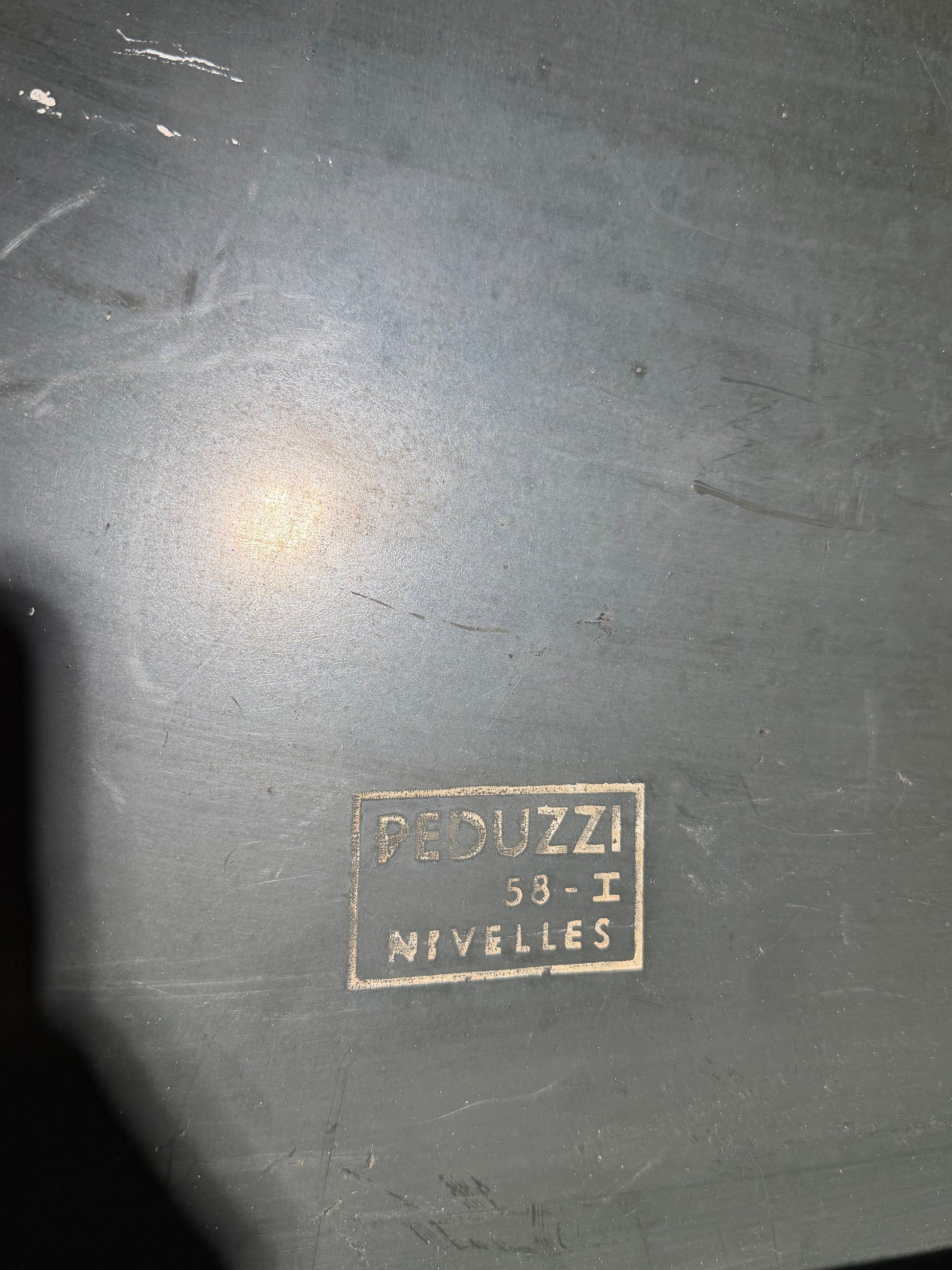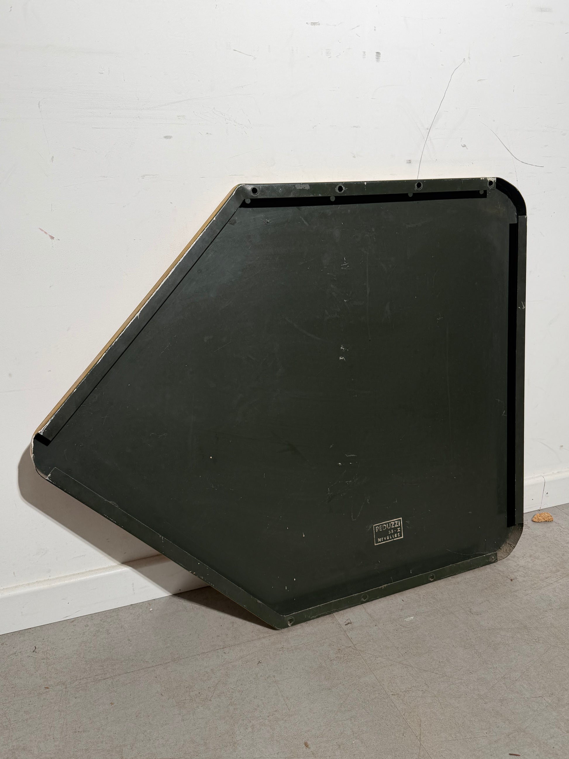 Fabriquée en métal durable et conservée avec sa peinture et sa patine d'origine, cette pièce rare de l'histoire du design belge capture l'esthétique du graphisme moderne et de la signalétique industrielle du milieu du XXe siècle.