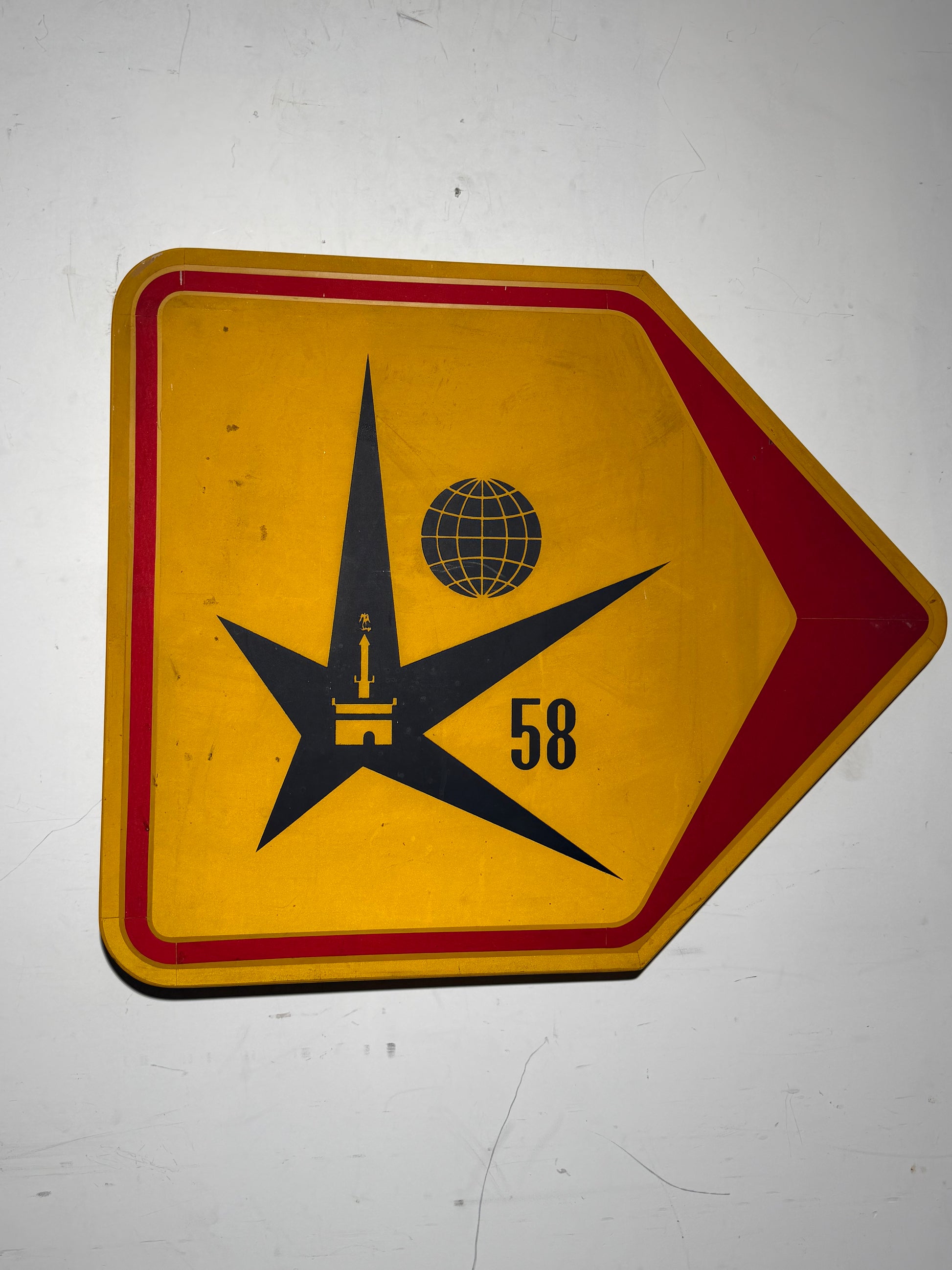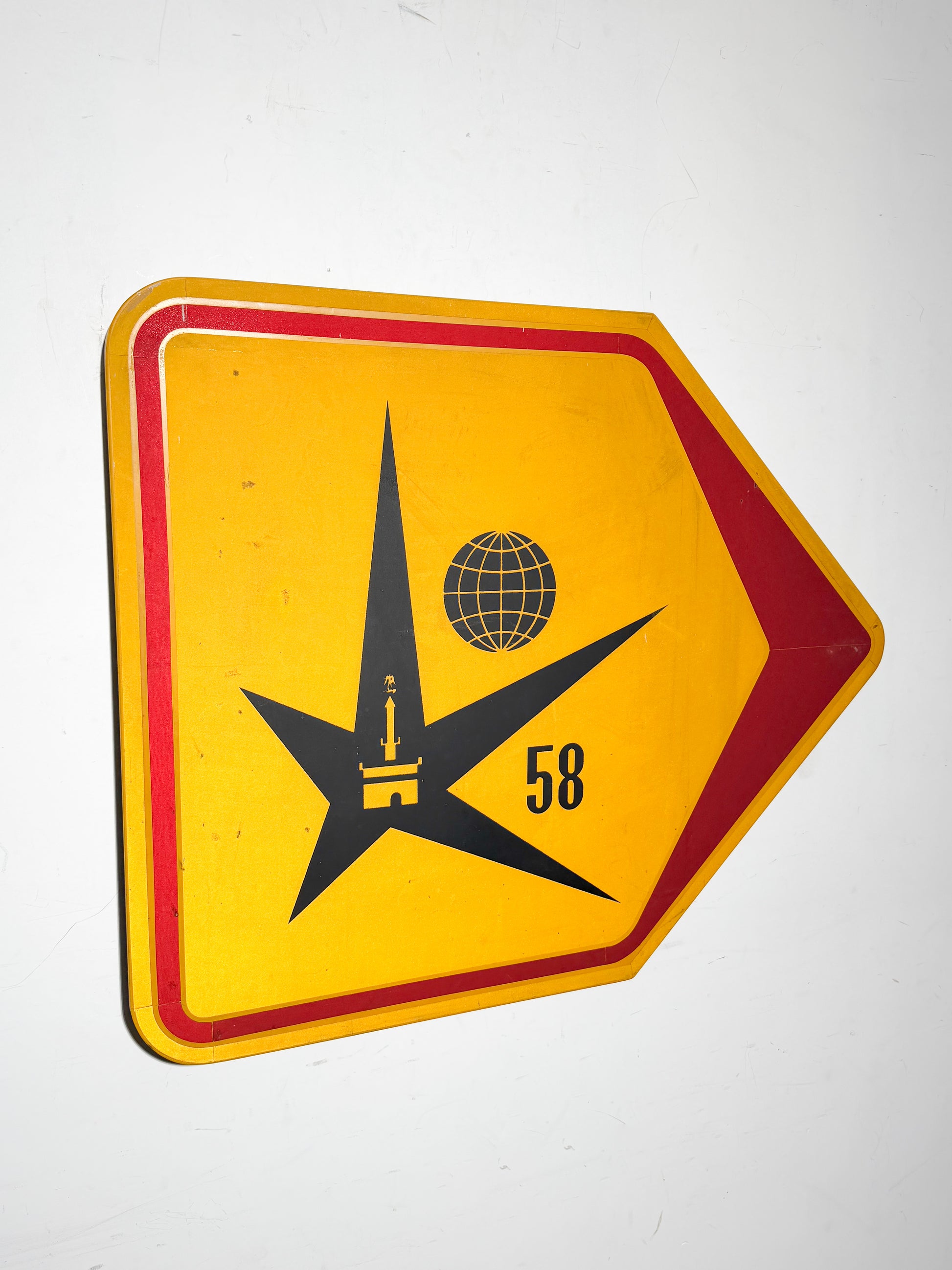 Le panneau arbore l'emblème iconique de l'étoile d'Expo 58, avec le globe de l'Atomium et la silhouette de la tour de Bruxelles, imprimés sur un fond jaune vif bordé d'une flèche rouge — immédiatement reconnaissable comme faisant partie du système d'orientation original de l'exposition.