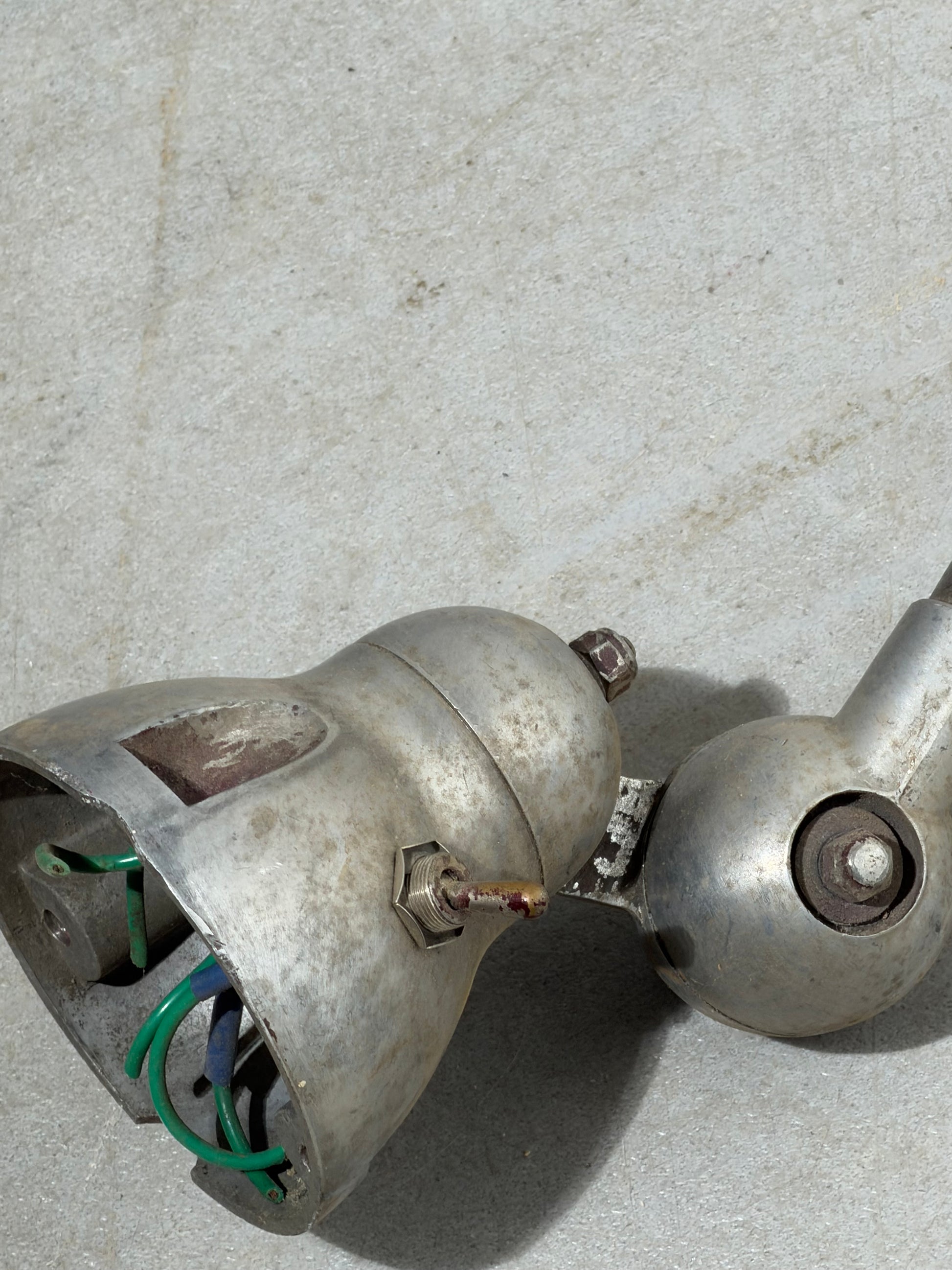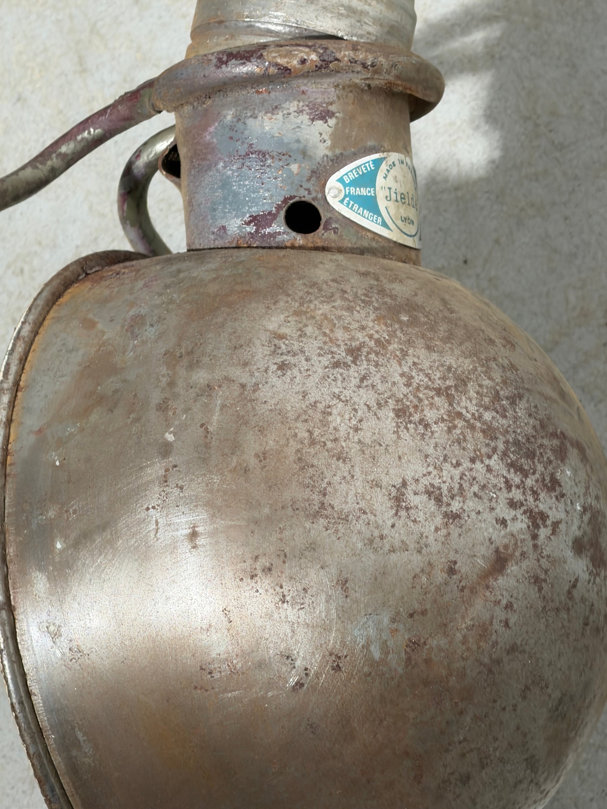 En excellent état vintage industriel. La lampe présente une patine marquée, des traces d'usure et une oxydation superficielle, caractéristiques d'une utilisation prolongée en milieu industriel. Cette finition patinée est très recherchée par les collectionneurs et les décorateurs d'intérieur pour son aspect brut et authentique.