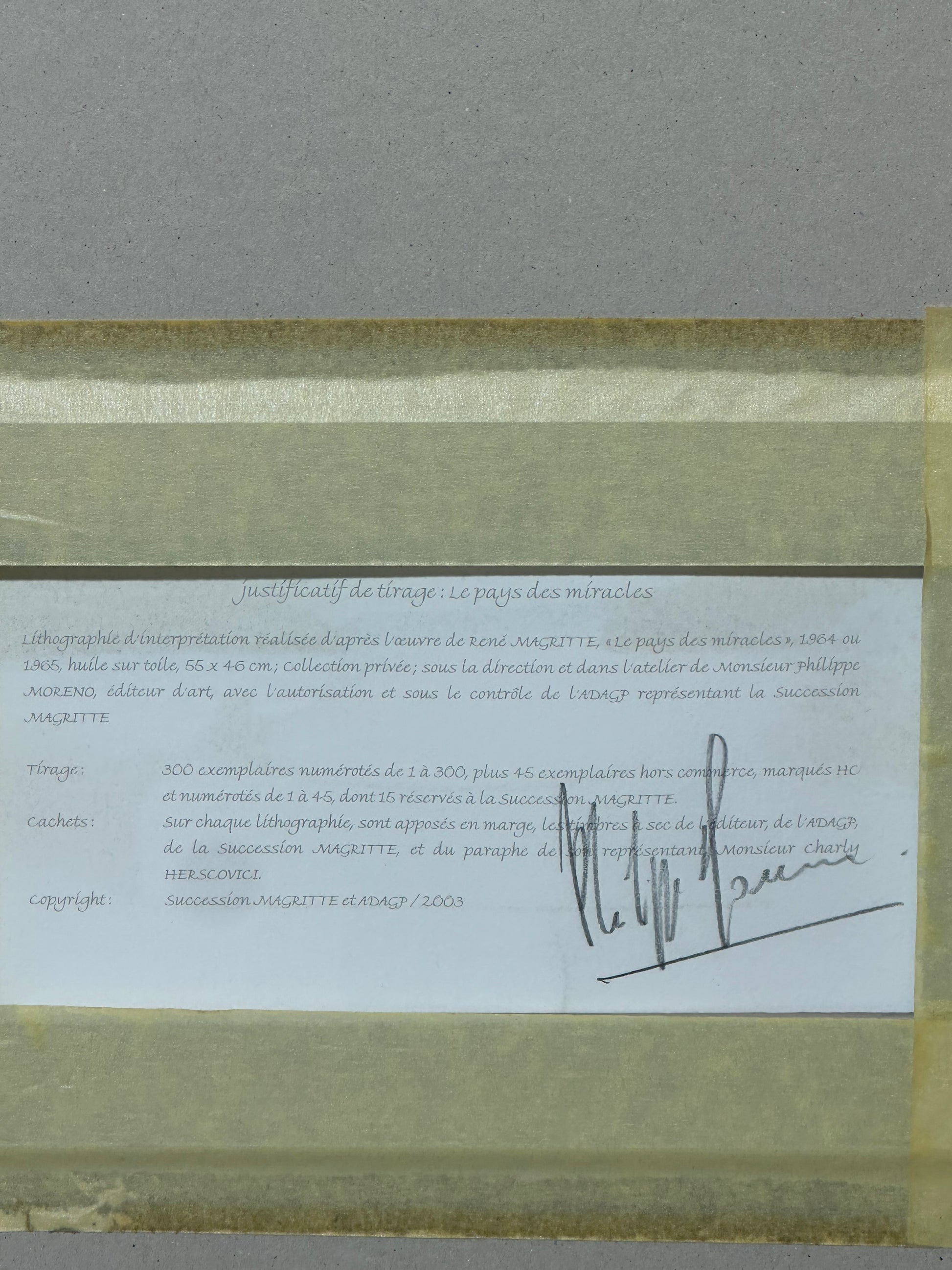 Une magnifique lithographie autorisée en édition limitée d'après Le Pays des Miracles (1964) de René Magritte. Cette œuvre, numérotée 243 sur 300, est accompagnée du cachet sec officiel et de la justification de tirage de la Succession Magritte / ADAGP (2003).