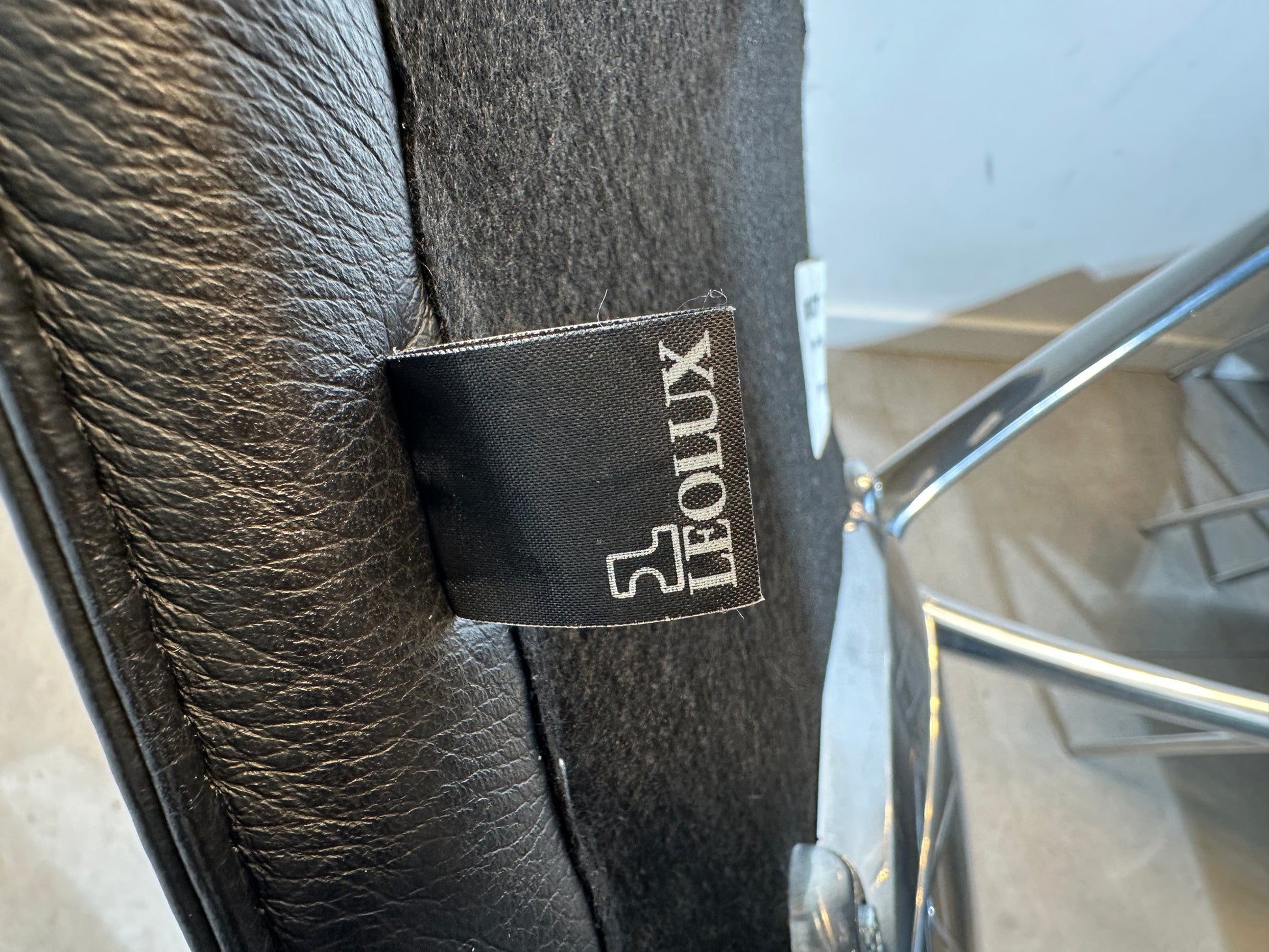 Chaque chaise présente une élégante structure en métal chromé et une assise et un dossier recouverts de cuir noir, offrant à la fois confort et sophistication.