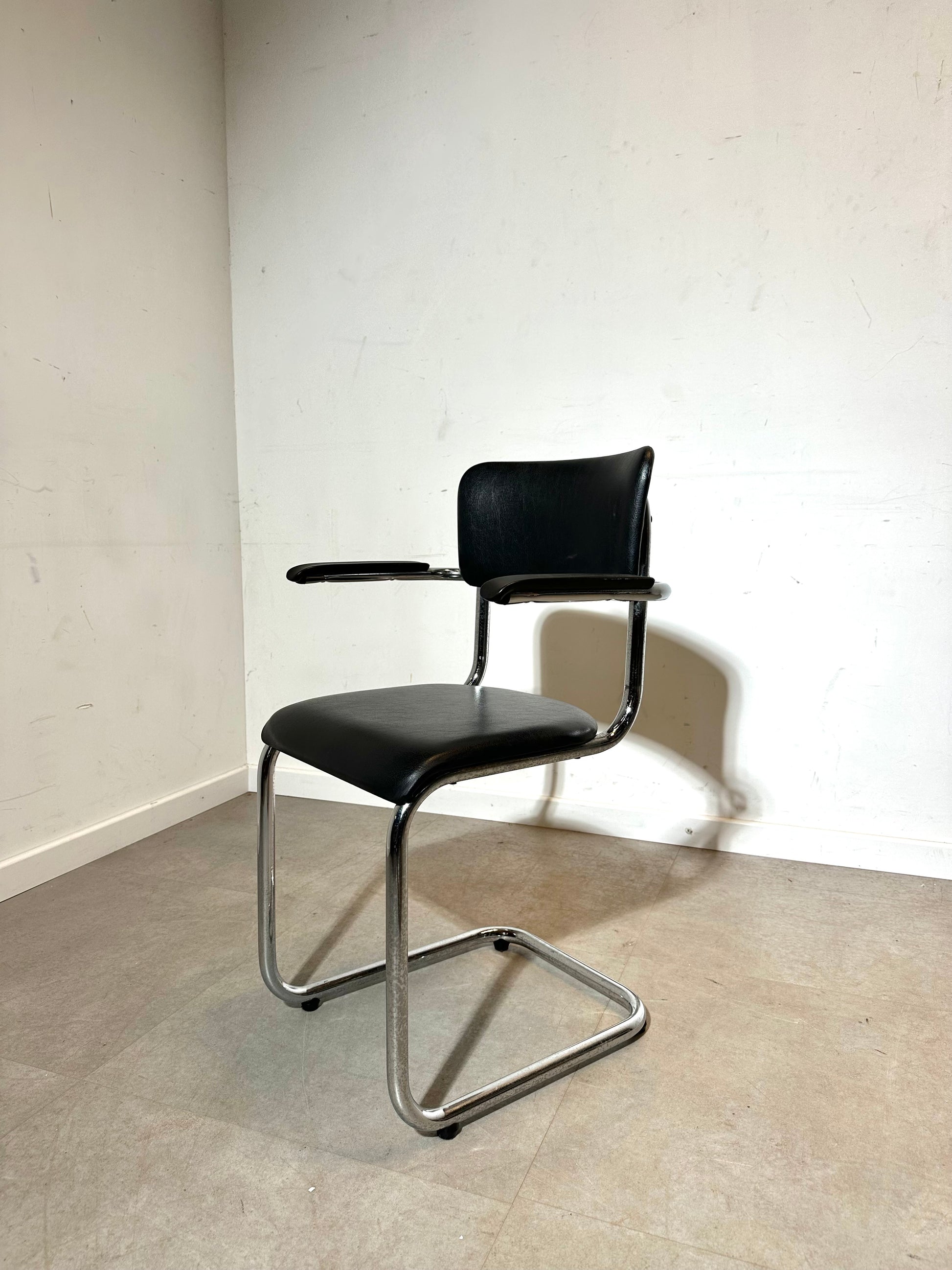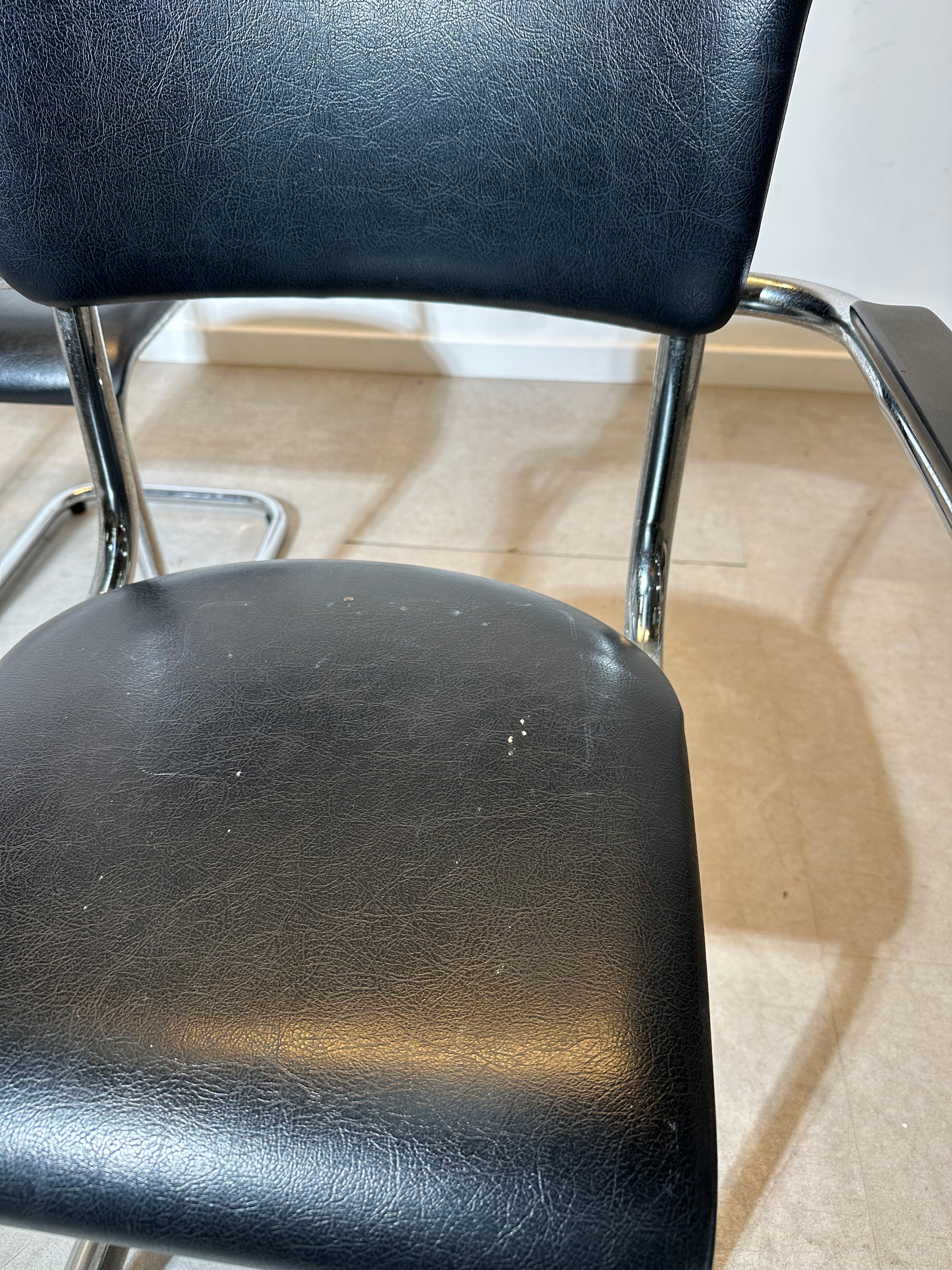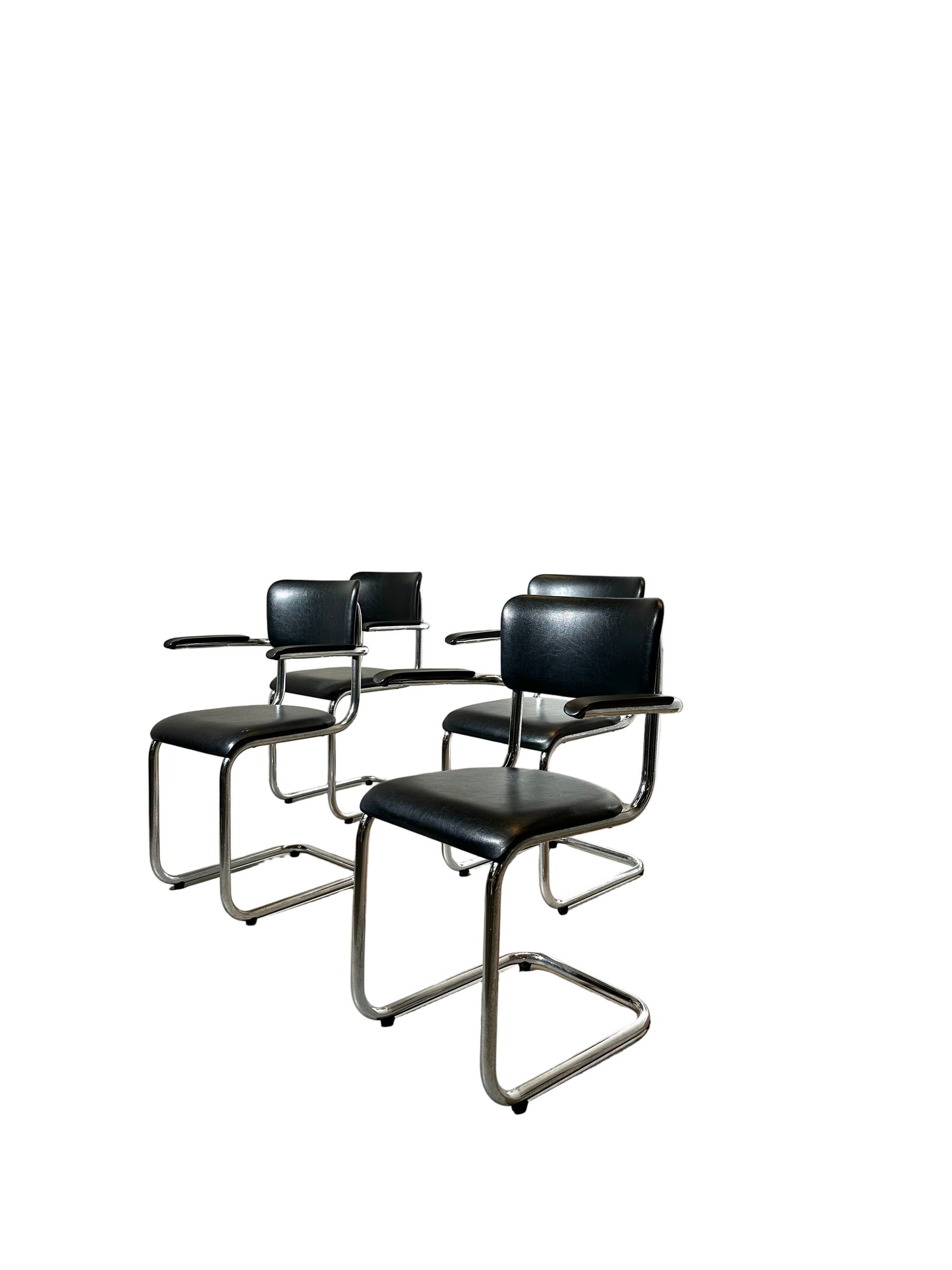 Ces chaises présentent une élégante structure tubulaire en acier chromé, un revêtement et des accoudoirs en skaï noir (simili cuir). Leur silhouette raffinée et leur forme ergonomique rappellent l'influence du Bauhaus, perceptible dans les créations de Mart Stam et Marcel Breuer, tout en bénéficiant du savoir-faire belge distinctif de Tubax.