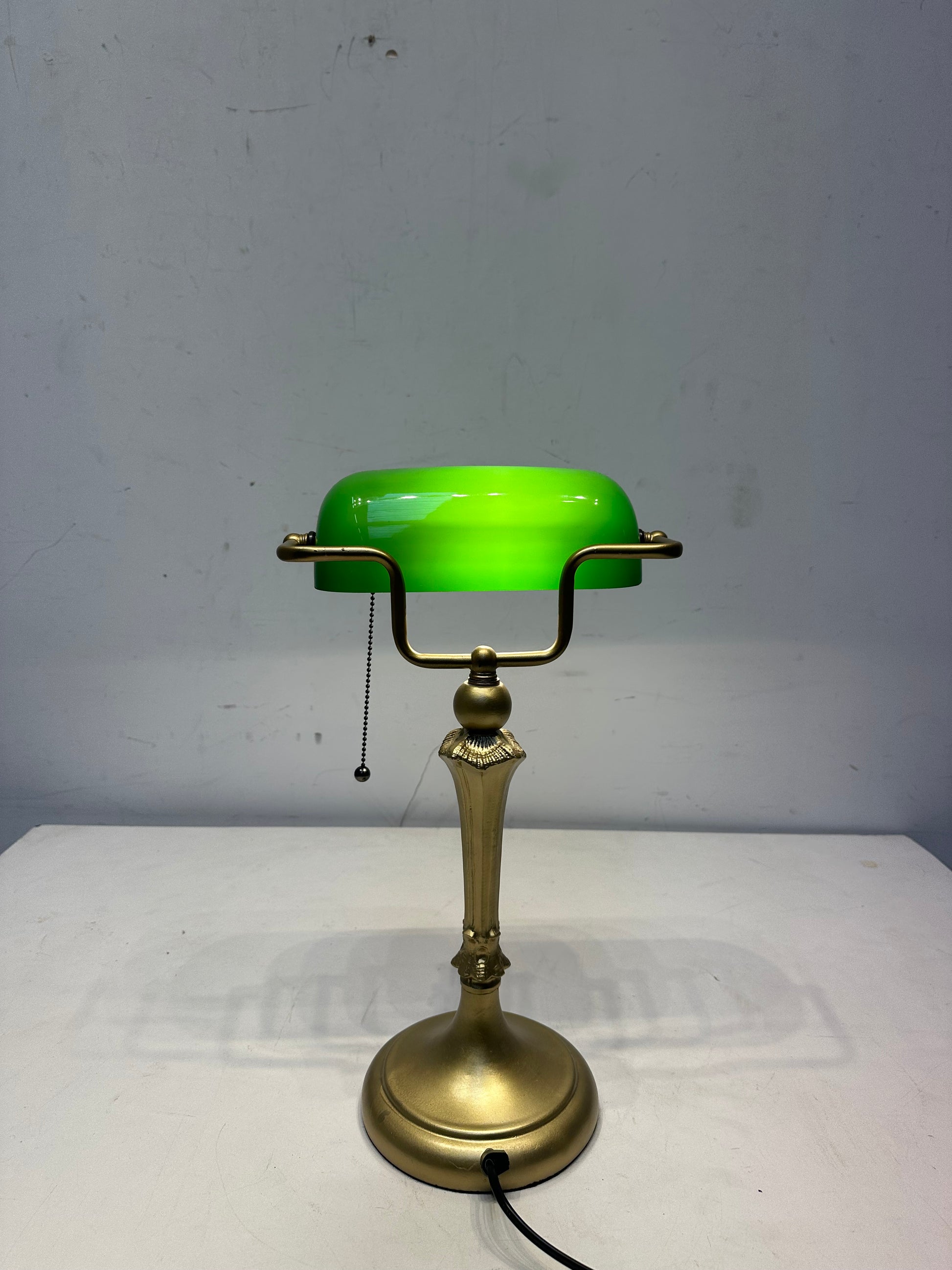 Lampe de banquier vintage élégante, dotée d'un abat-jour classique en verre vert et d'un pied en laiton aux détails raffinés.