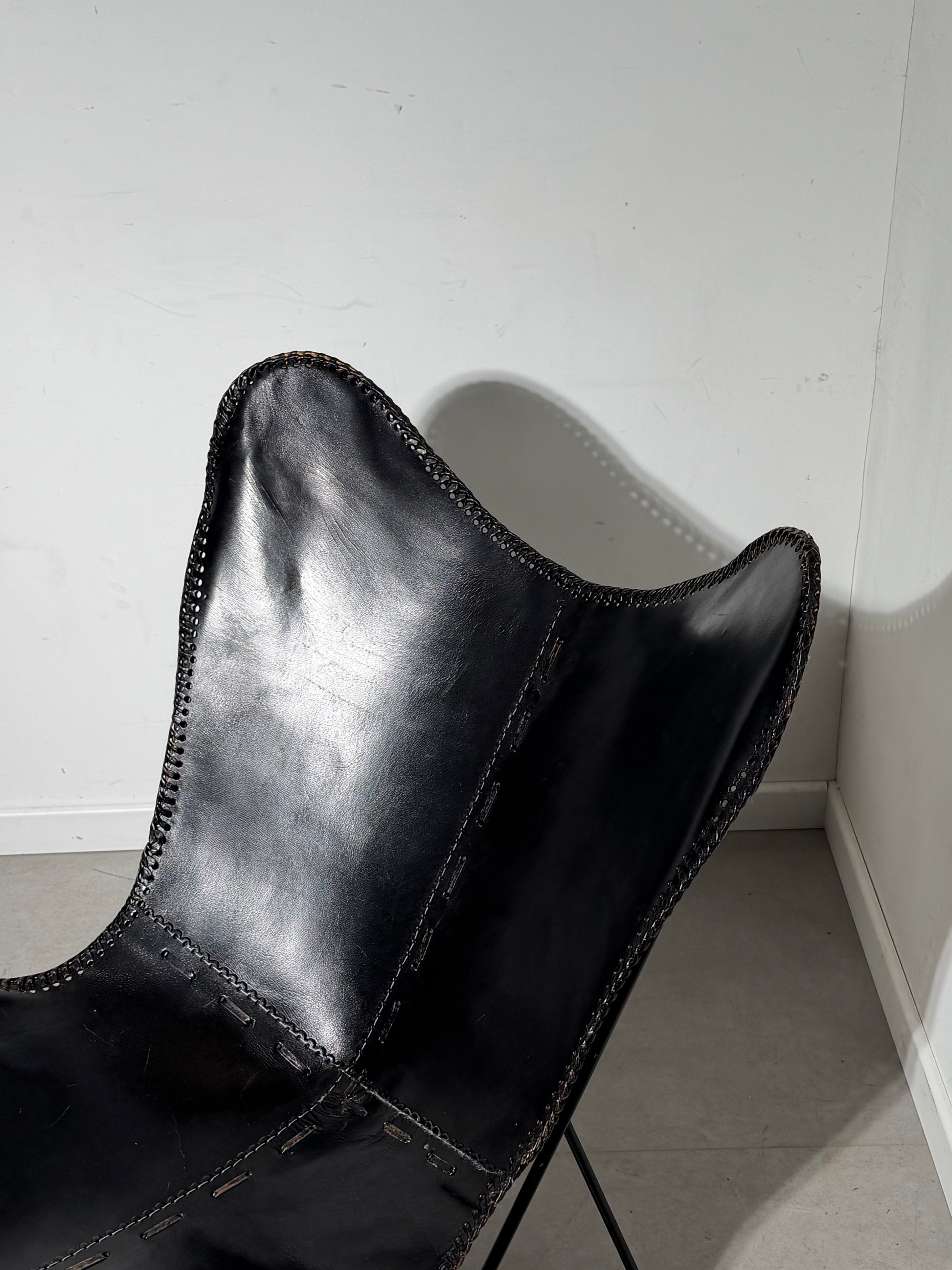 A striking vintage butterfly chair in deep black leather, embodying the essence of mid-century modern design. This iconic sling chair features a thick, full-grain leather seat with a smooth, slightly glossy finish, beautifully shaped to provide both comfort and support.
