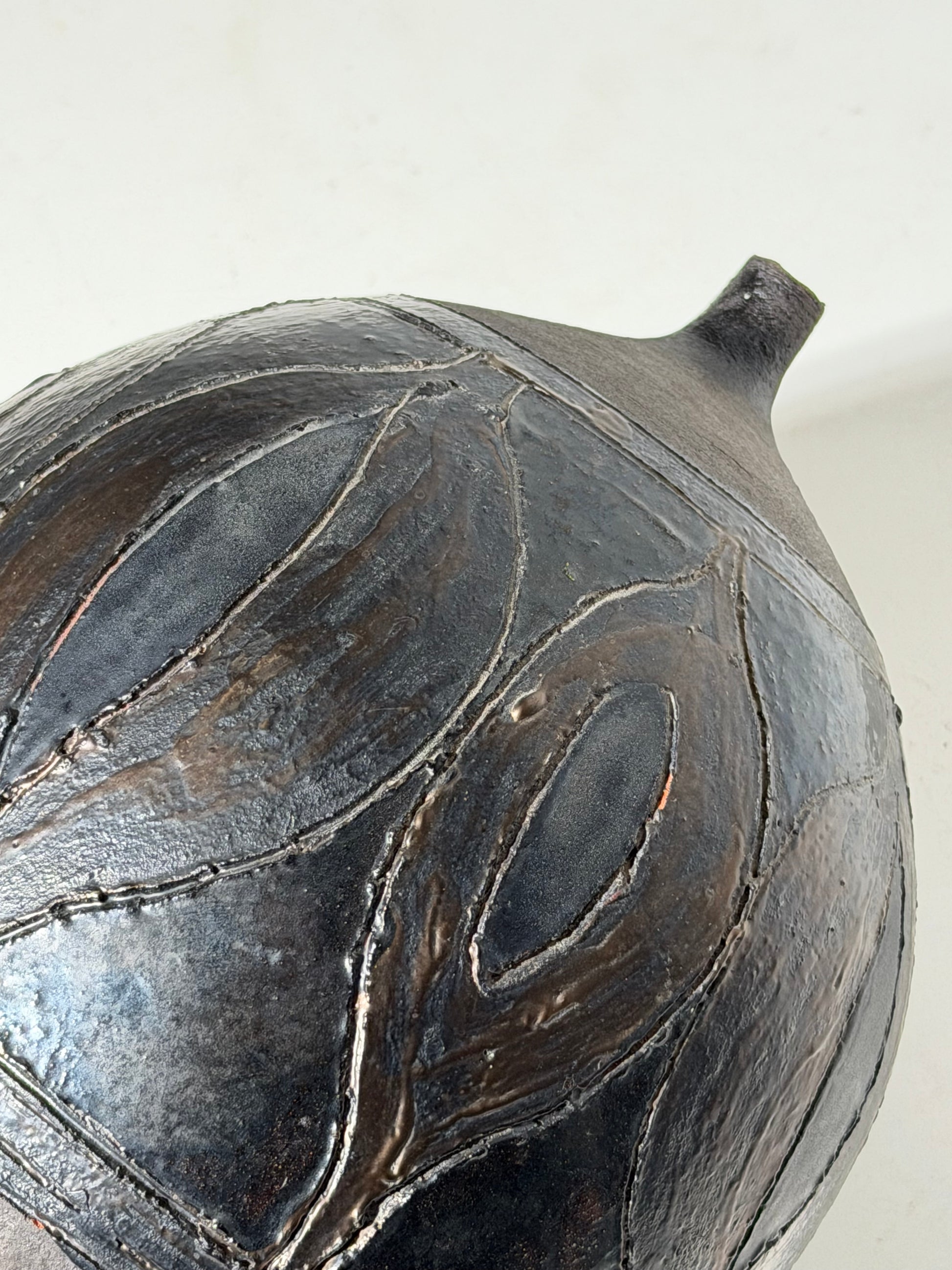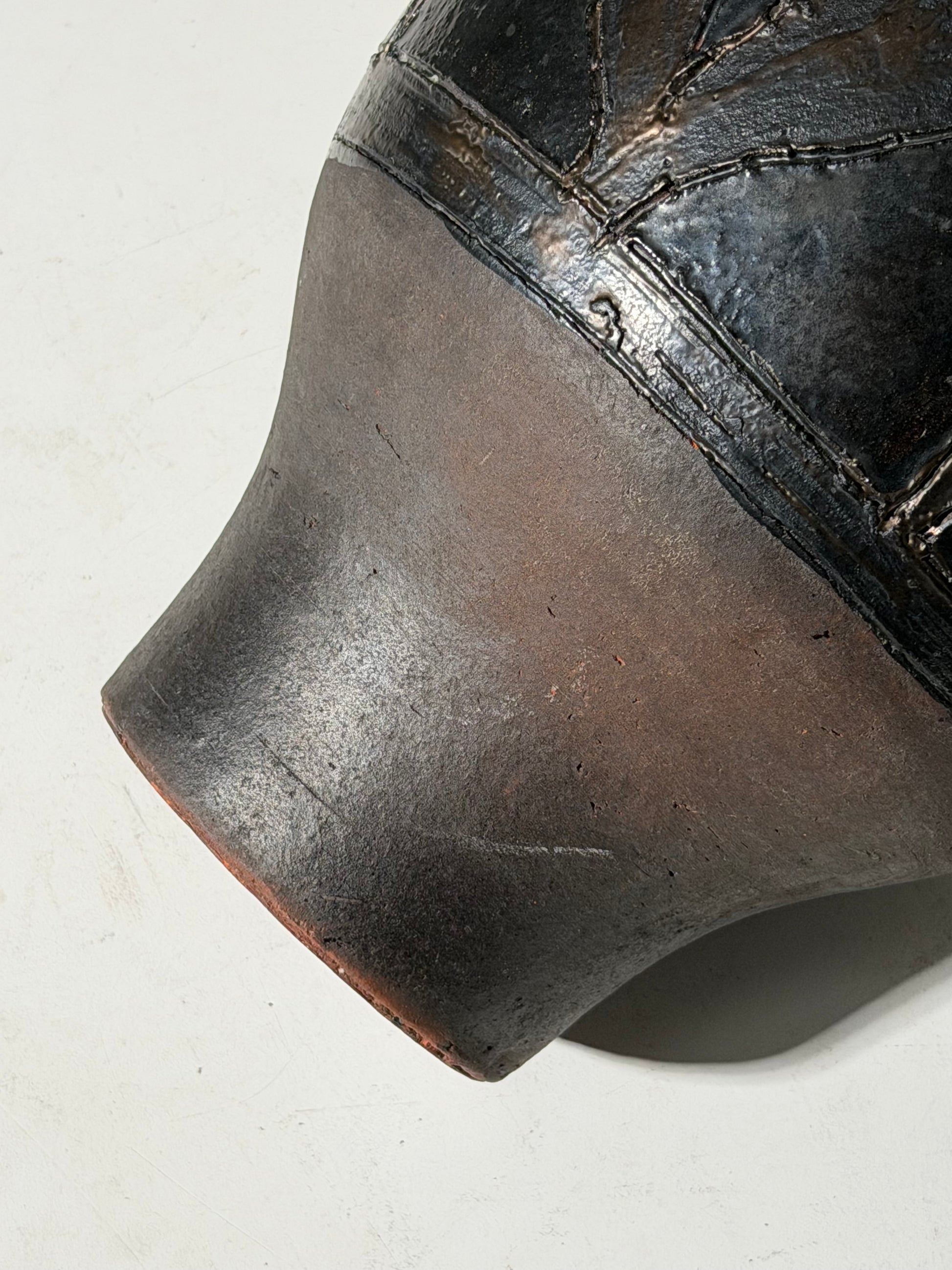 Ce vase présente une glaçure d'un brun foncé tirant sur le noir, ornée de motifs de feuilles organiques sculptés, qui souligne le subtil jeu entre les textures mates et brillantes. Sa forme sculpturale, presque architecturale, incarne l'esthétique intemporelle qui a fait des céramiques de Pérignem des pièces très recherchées par les collectionneurs de faïencerie européenne.
