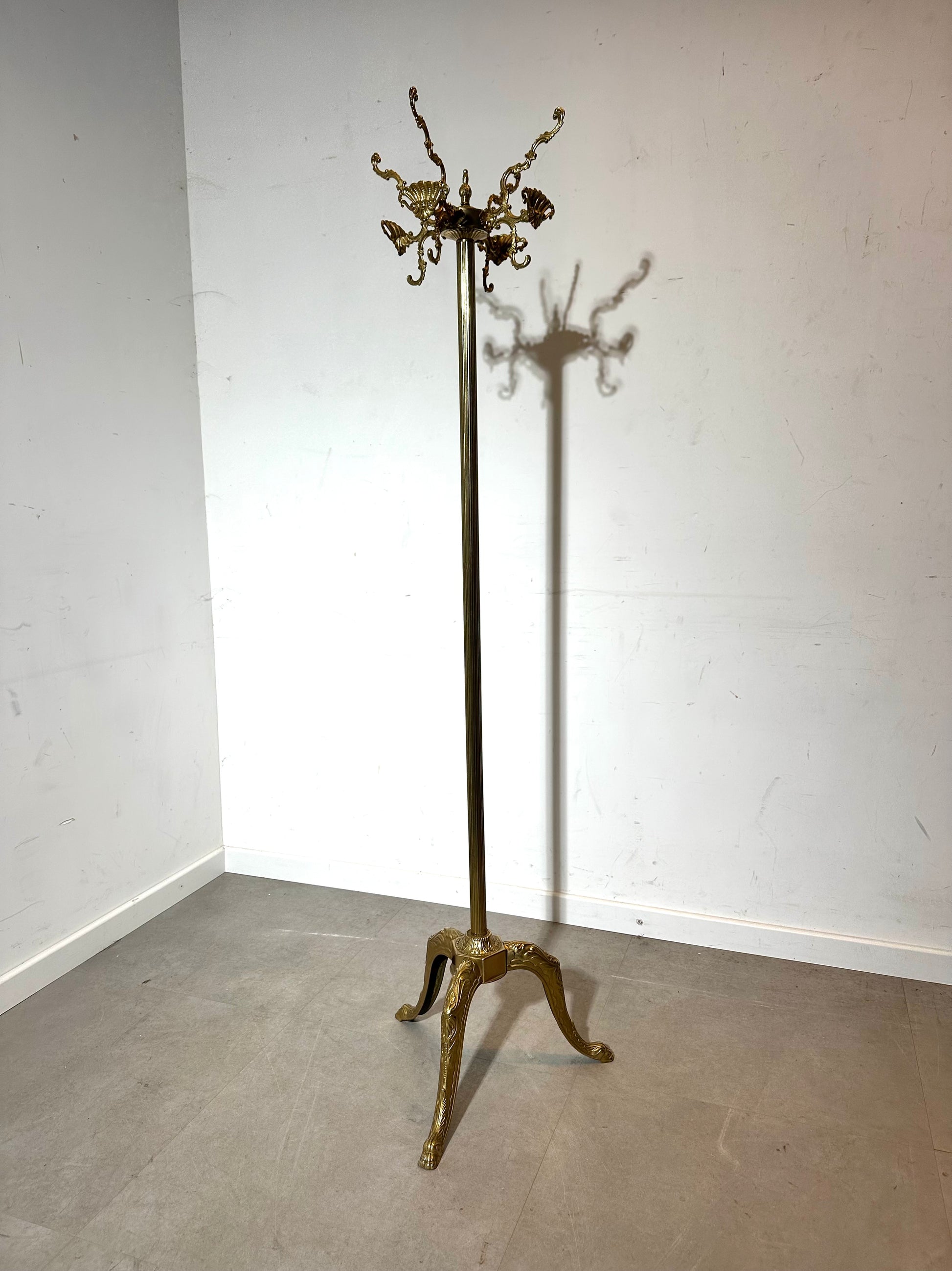 Un magnifique porte-manteau vintage en cuivre finement ouvragé, au design élégant et décoratif. Ses crochets en spirale, ses ornements en forme de coquillage et son piètement tripode travaillé lui confèrent un charme antique luxueux. Sa teinte cuivrée chaleureuse en fait une pièce maîtresse dans une entrée, une boutique ou un intérieur éclectique.