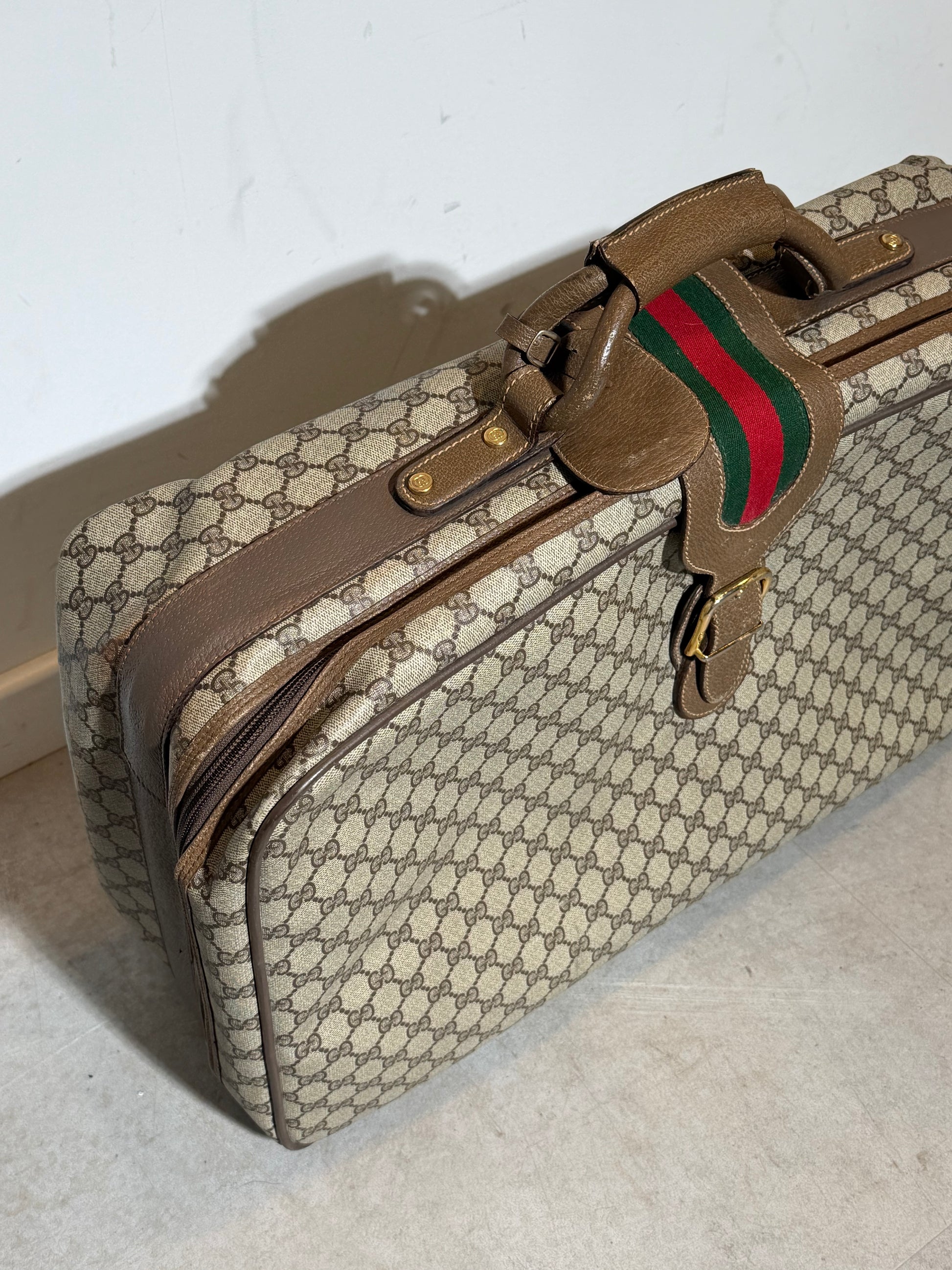 Élégante malle de voyage vintage Gucci en toile monogrammée GG emblématique, ornée de finitions en cuir marron et de la bande Web iconique verte-rouge-verte.