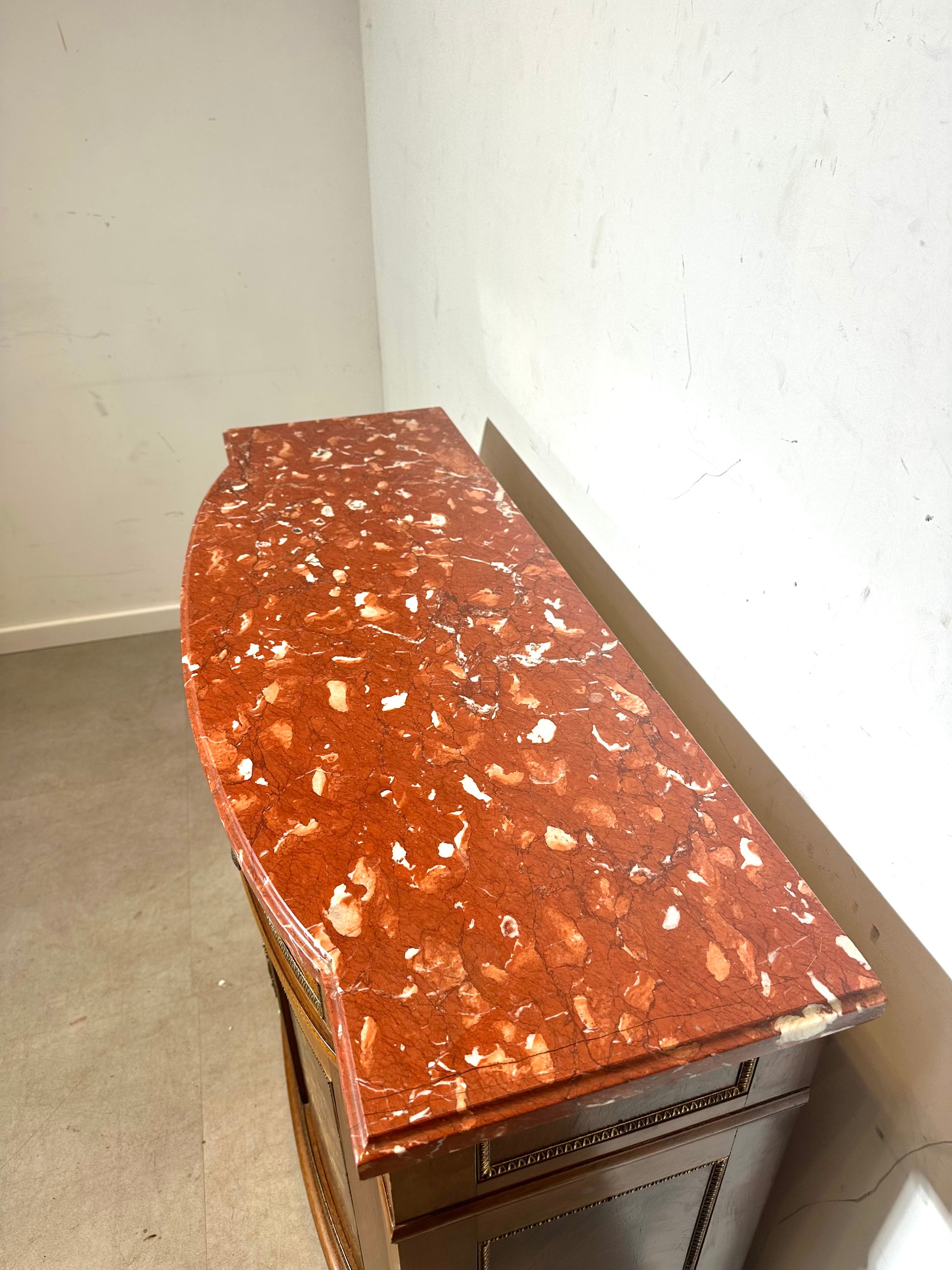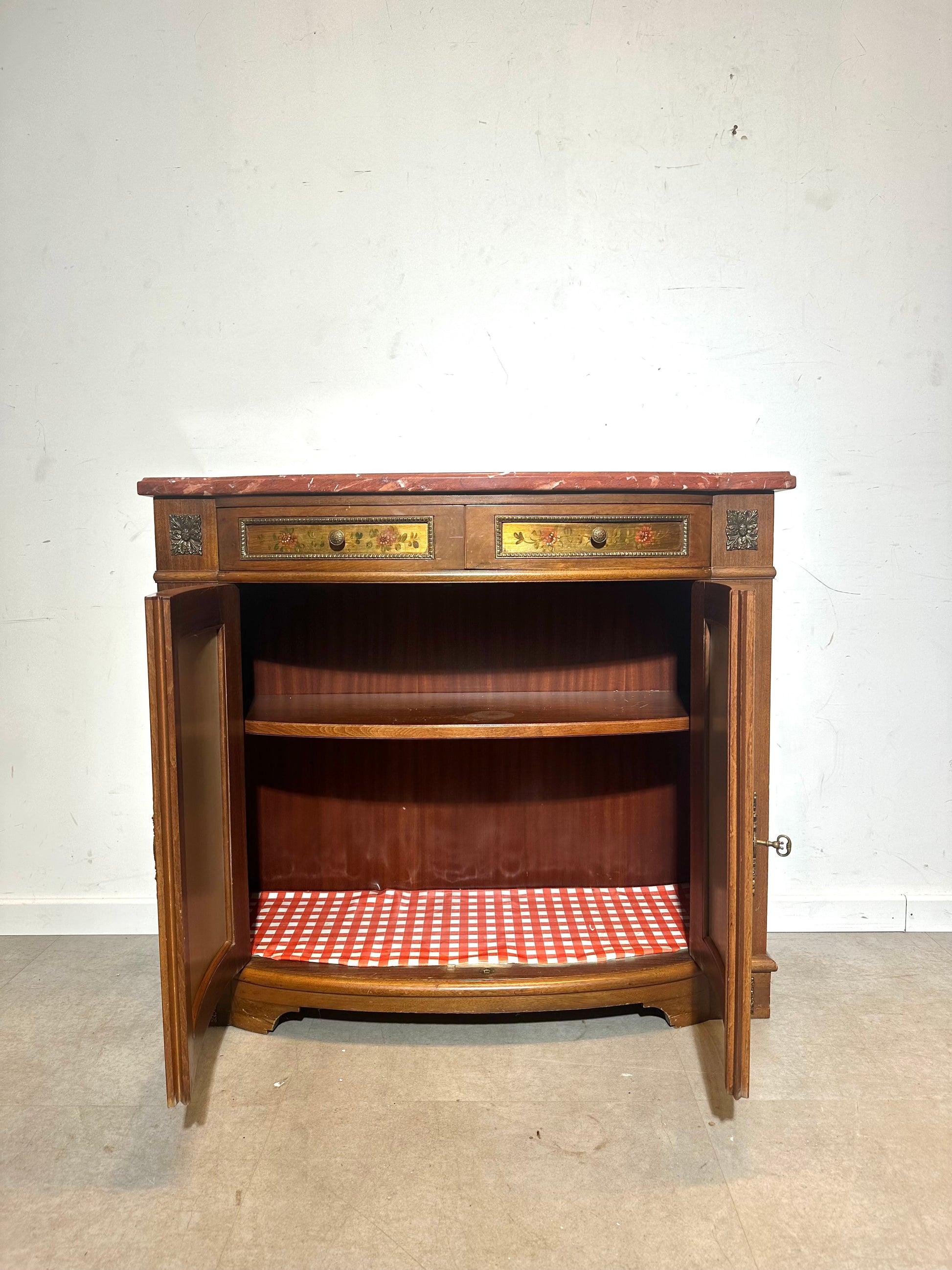 Charmant buffet ancien peint à la main, orné de magnifiques panneaux à décor floral et d'un plateau en marbre rouge massif. Ce meuble élégant allie inspiration classique, savoir-faire artisanal et chaleureuses teintes de bois. Les bouquets de fleurs peints à la main sur les portes lui confèrent un caractère romantique et intemporel.