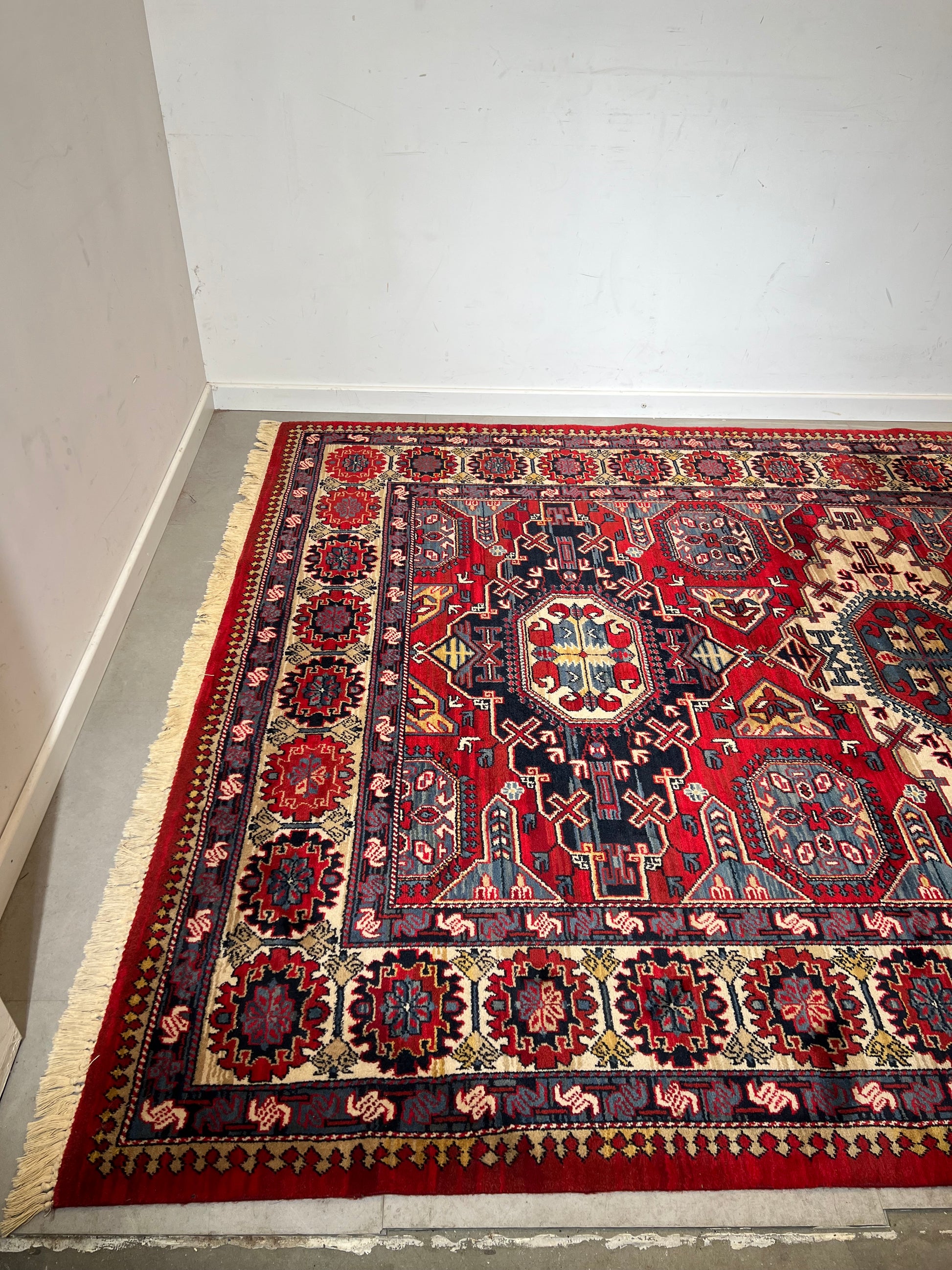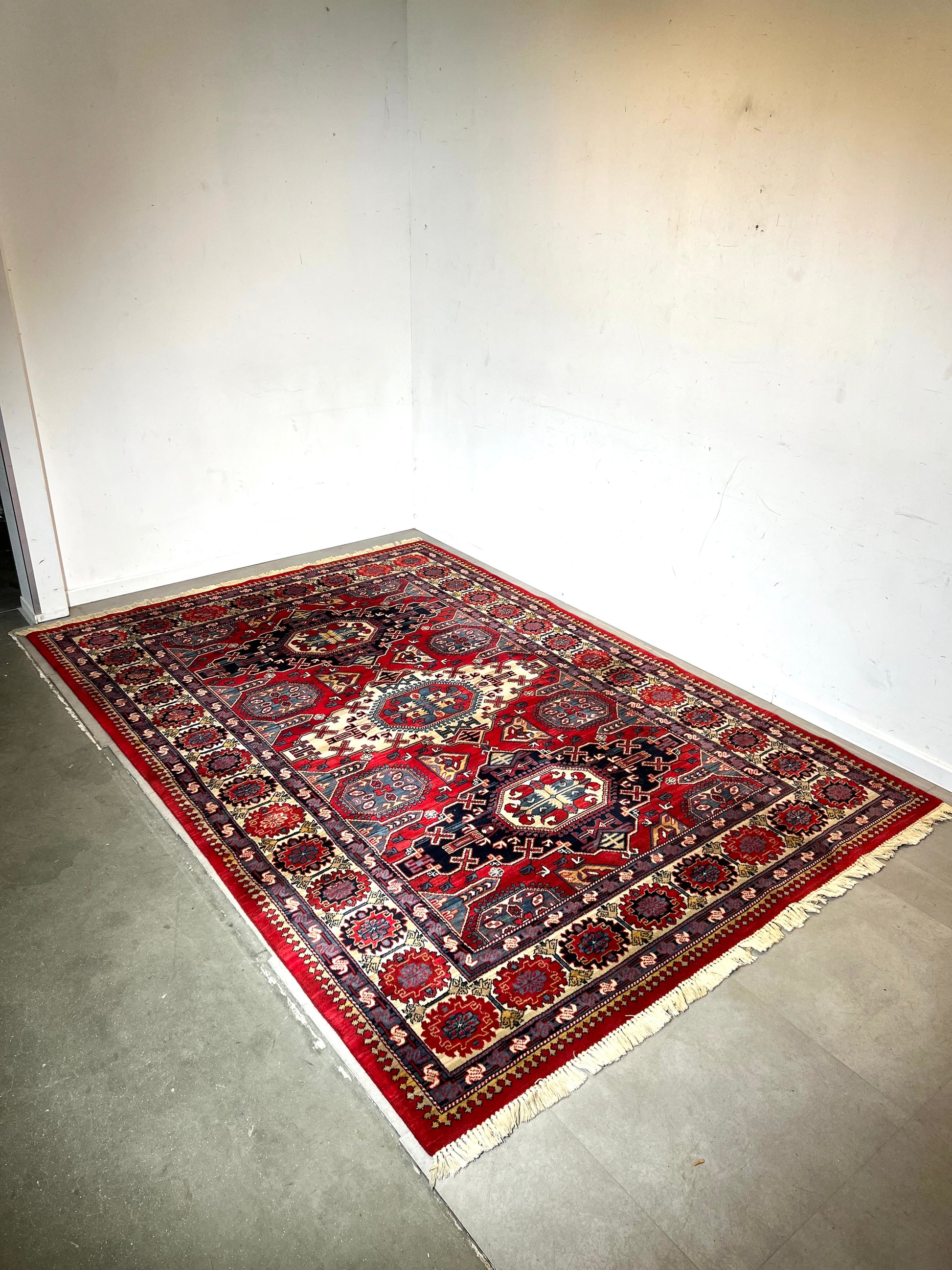 The geometric motifs and detailed borders give this rug a strong decorative presence, perfect for a living room, dining area or large bedroom. The colors are vibrant and the pattern remains crisp.