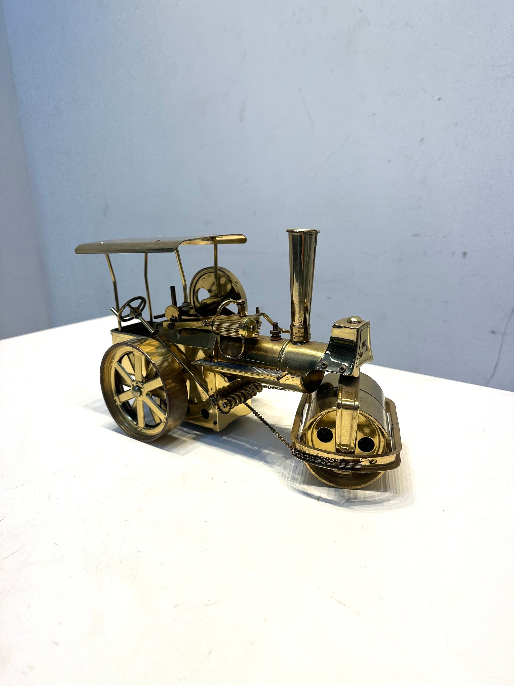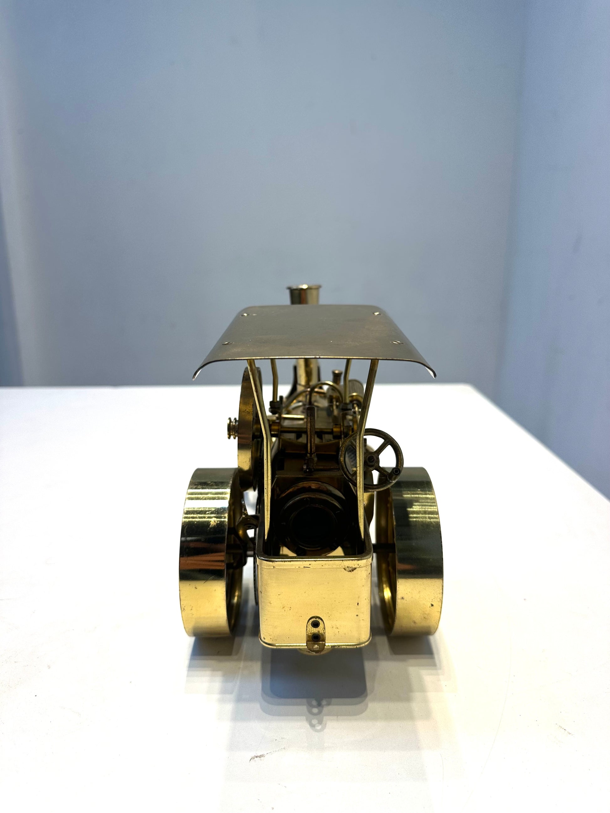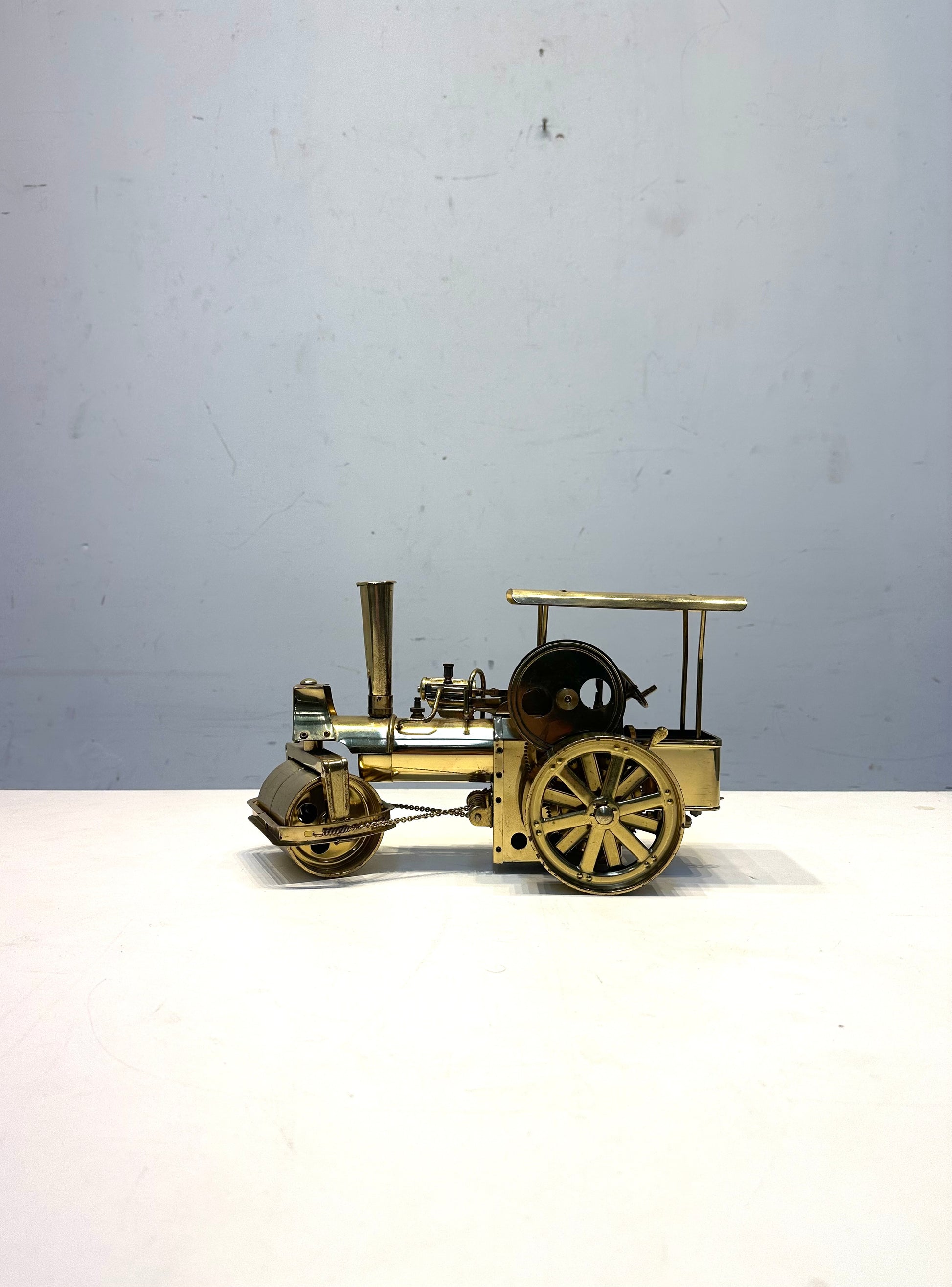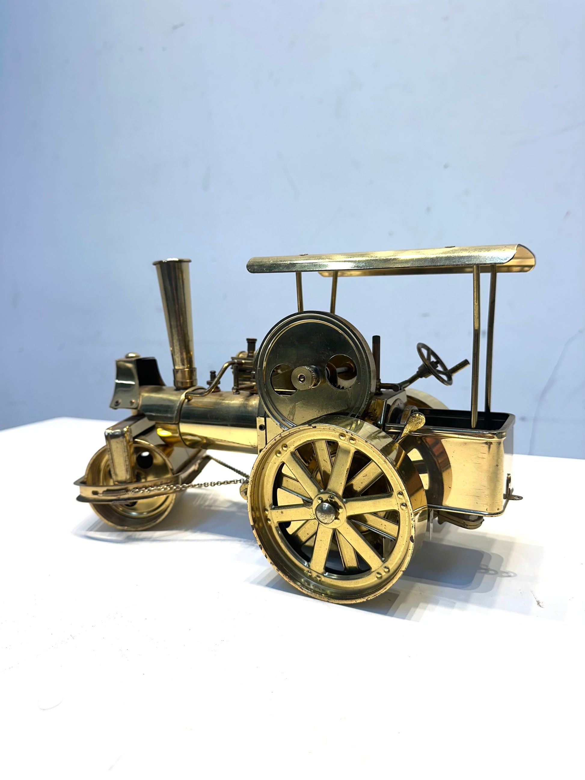 Fabriquée en cuivre poli, cette machine à vapeur miniature est une réplique fonctionnelle d'un rouleau compresseur classique. Elle présente des détails minutieux, un volant fonctionnel et une transmission par chaîne ; une pièce de collection idéale pour les amateurs de modèles anciens ou de machines à vapeur.