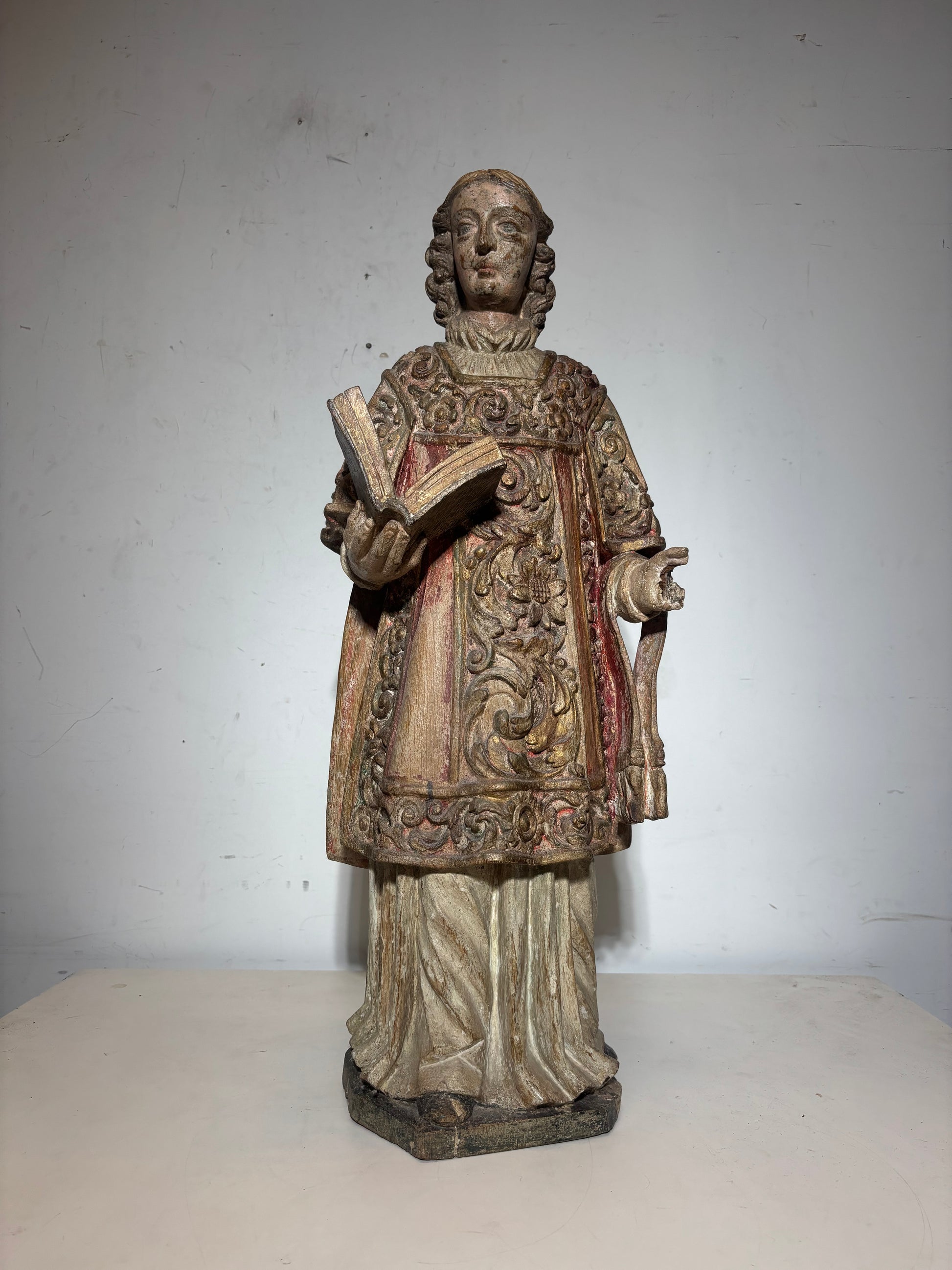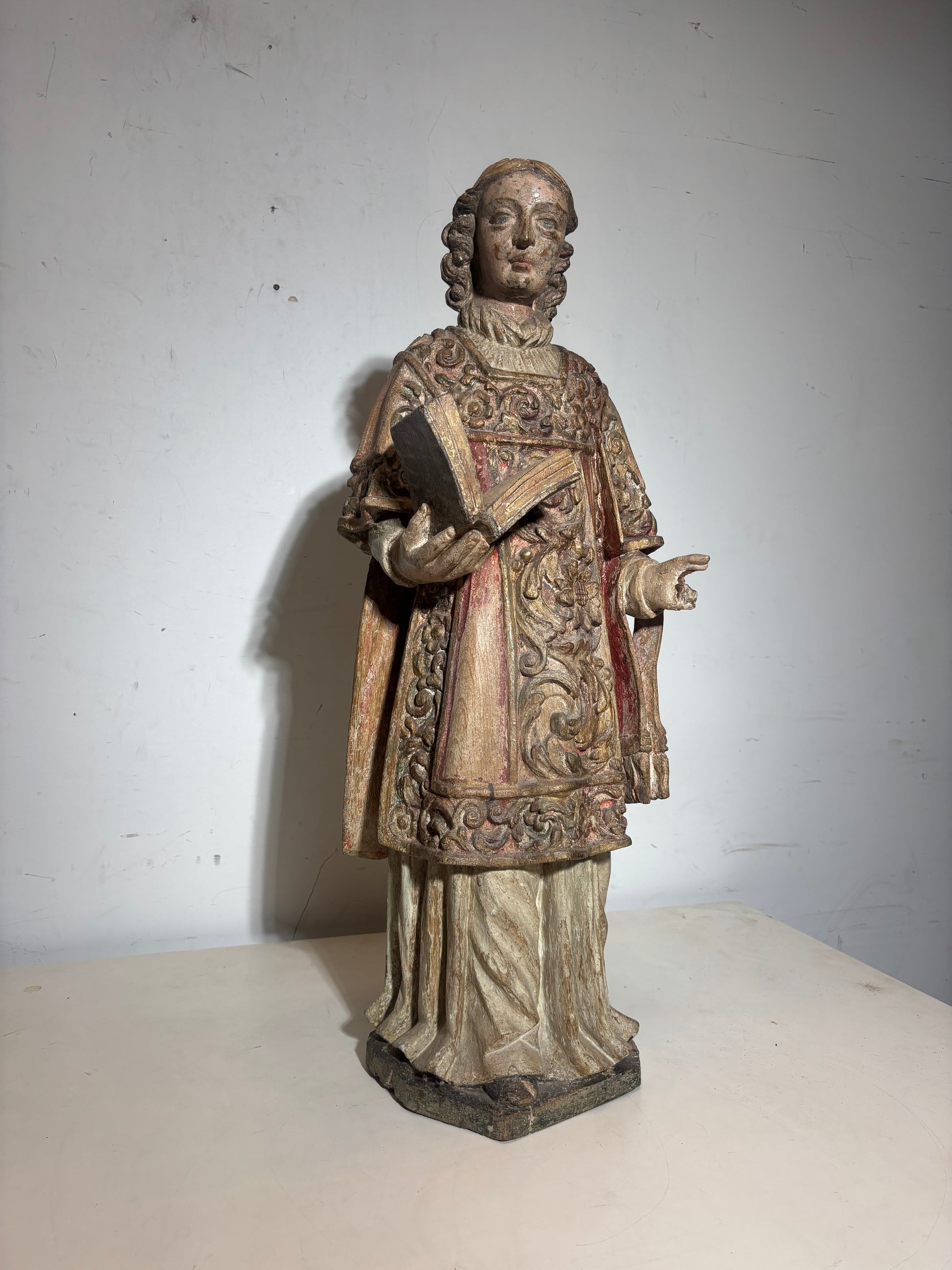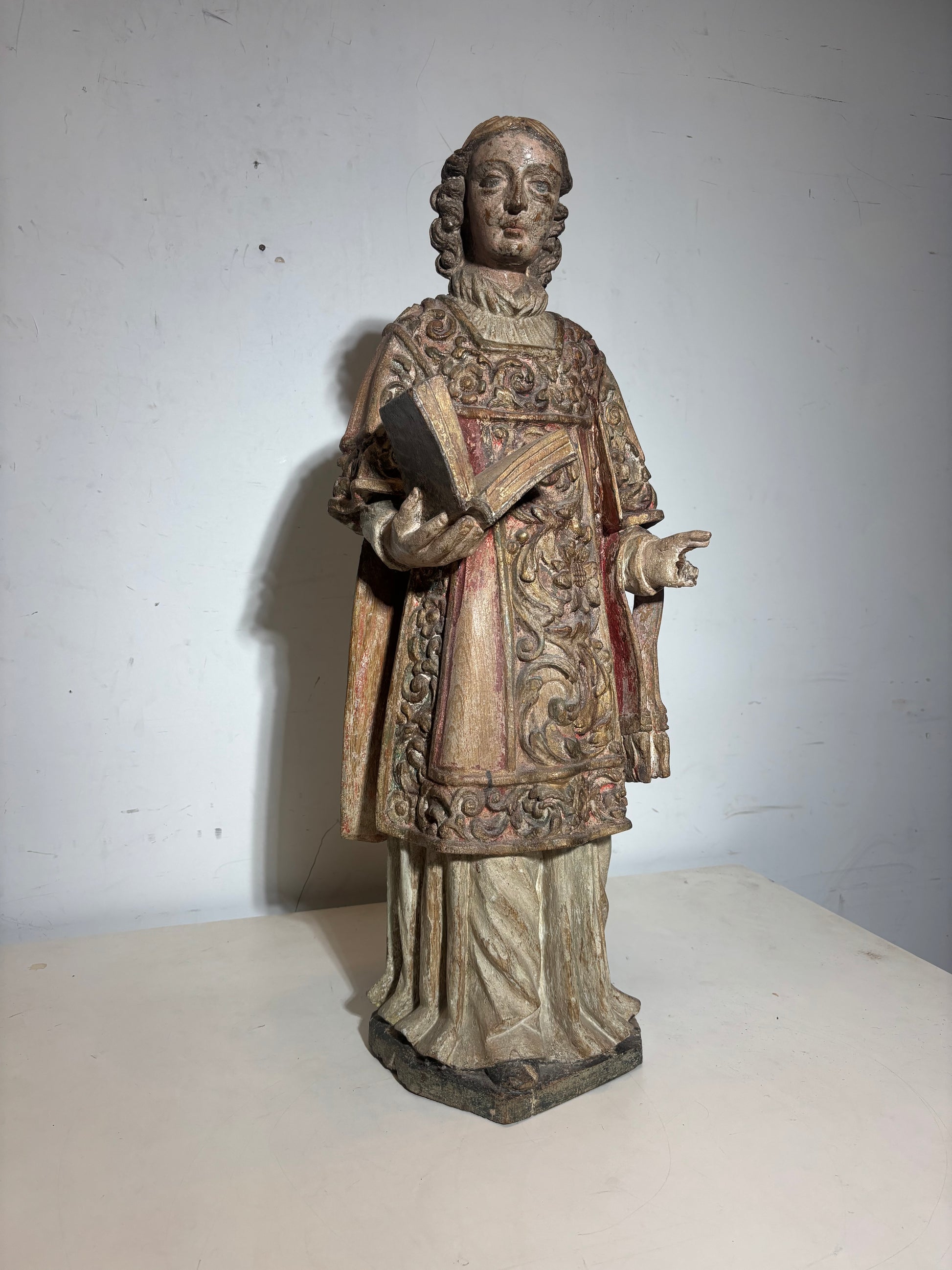 Een zeldzaam en fraai gesneden 17e-eeuws standbeeld van Sint Laurentius (Sint Laurentius), vervaardigd uit hout en grotendeels intact gebleven dankzij de oorspronkelijke polychrome en vergulde decoratie.