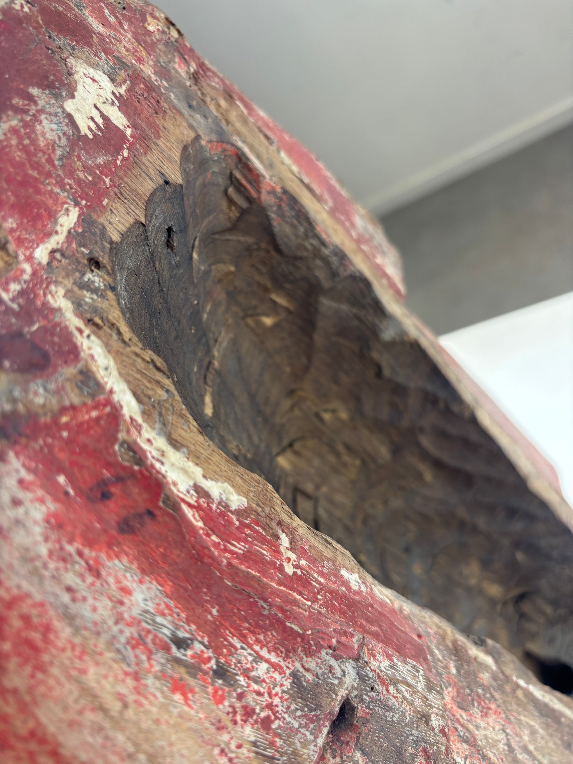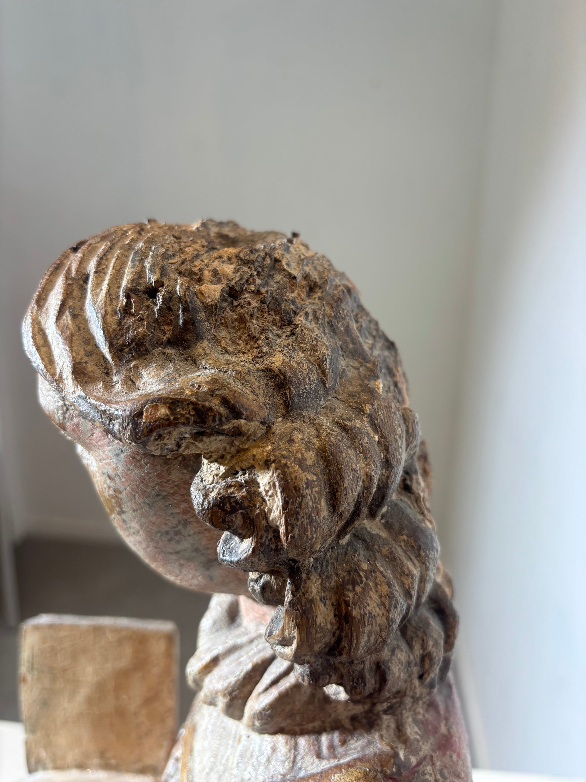 - Materiaal: Handgesneden hout met originele polychrome beschildering en verguldsel.