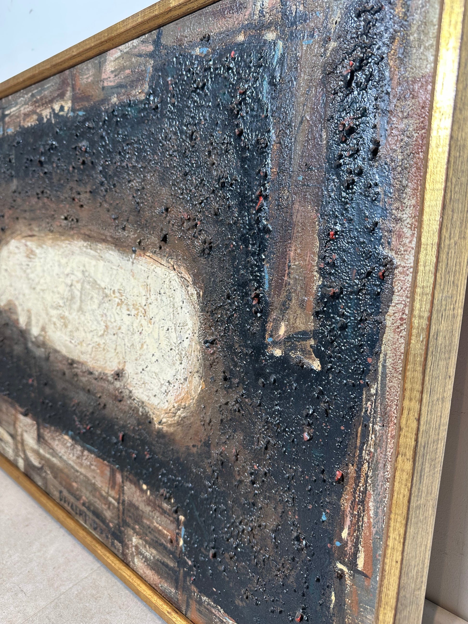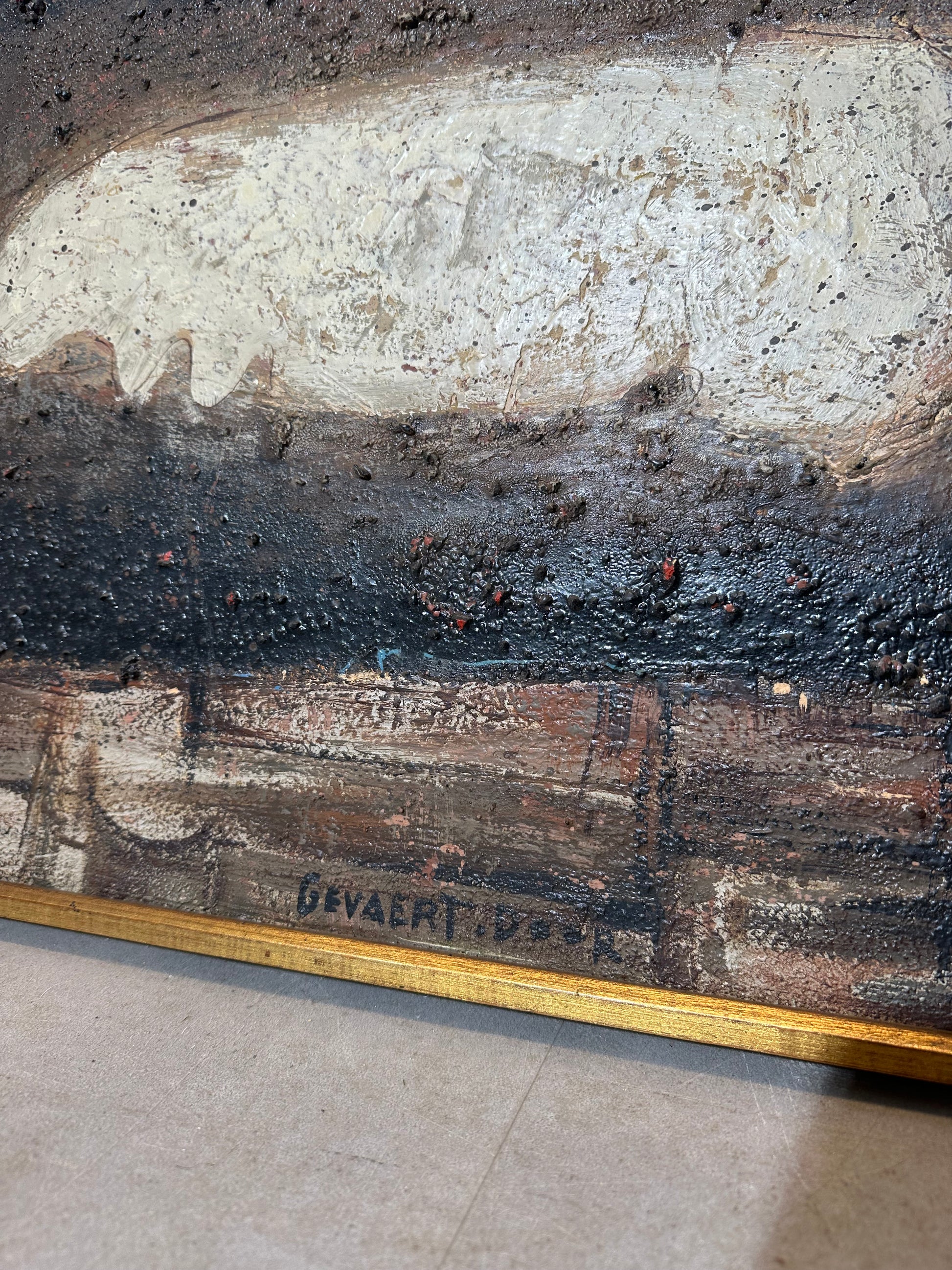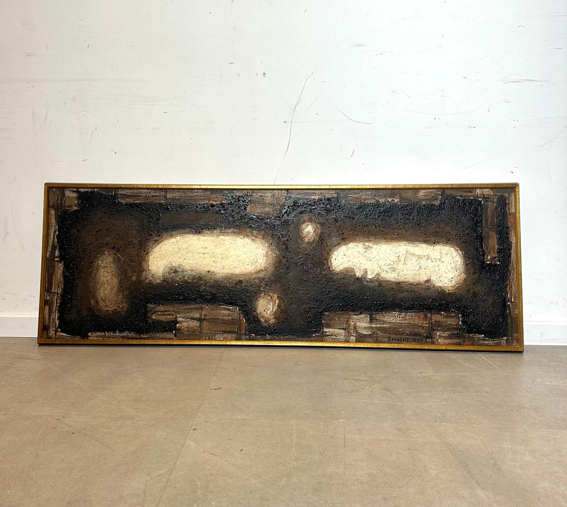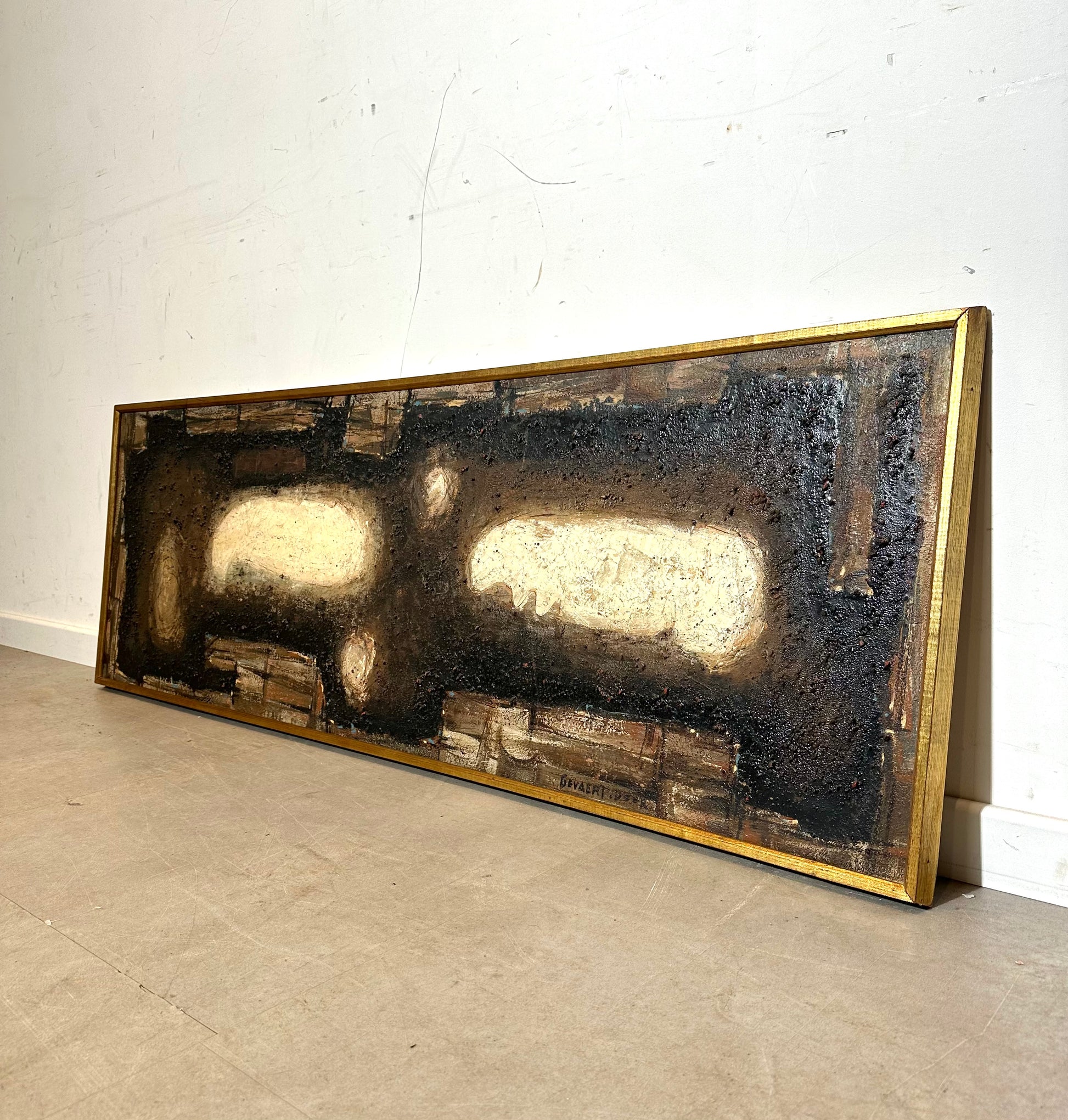 Een opvallende abstracte compositie uit het midden van de 20e eeuw van Gevaert, gedateerd 1959. Dit werk vangt de expressieve diepte en materialiteit die kenmerkend zijn voor de naoorlogse Europese abstractie: een gestructureerd oppervlak waar aardse tinten zwart, bruin en beige samenspelen met licht en schaduw. Het langwerpige horizontale formaat versterkt de ritmische, organische energie van het stuk, waardoor het een boeiend kunstwerk is dat zowel in moderne als vintage interieurs tot zijn recht komt.