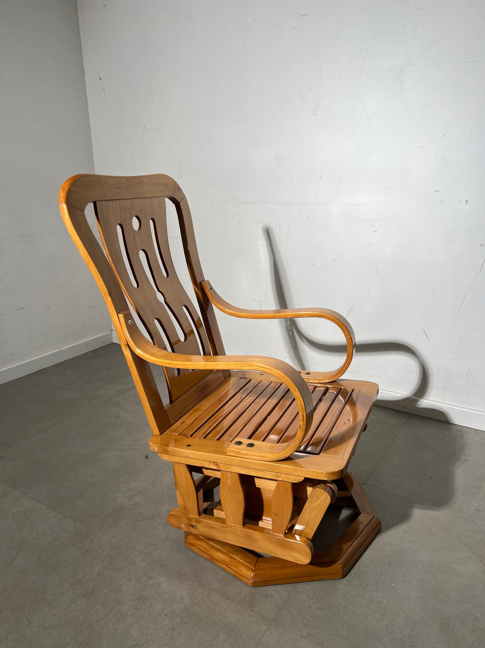 This model combines a classic rocking mechanism with a swivel base, making it both decorative and comfortable. The sculptural curved armrests and cut-out backrest give it a distinctive mid-century rustic look.