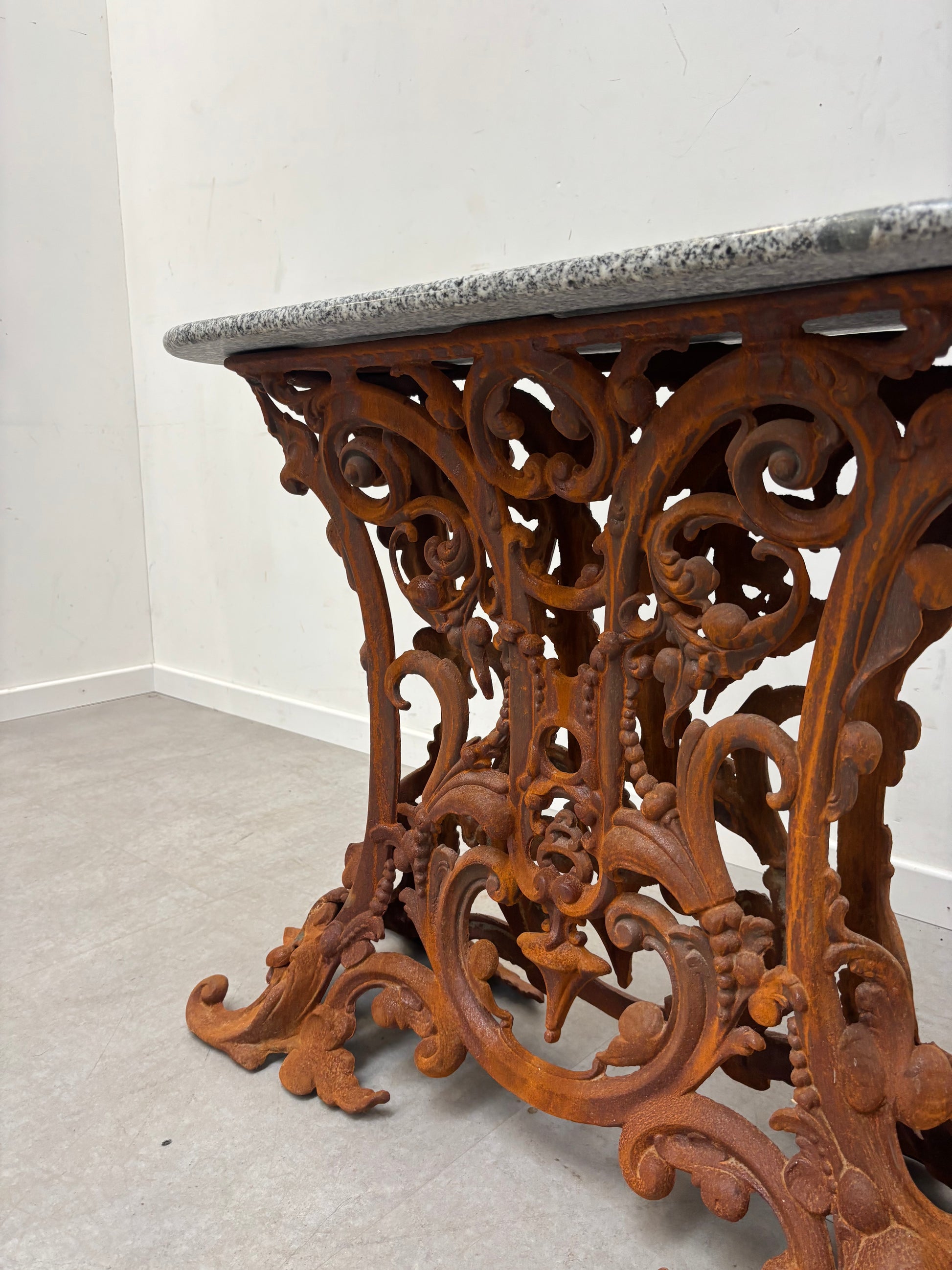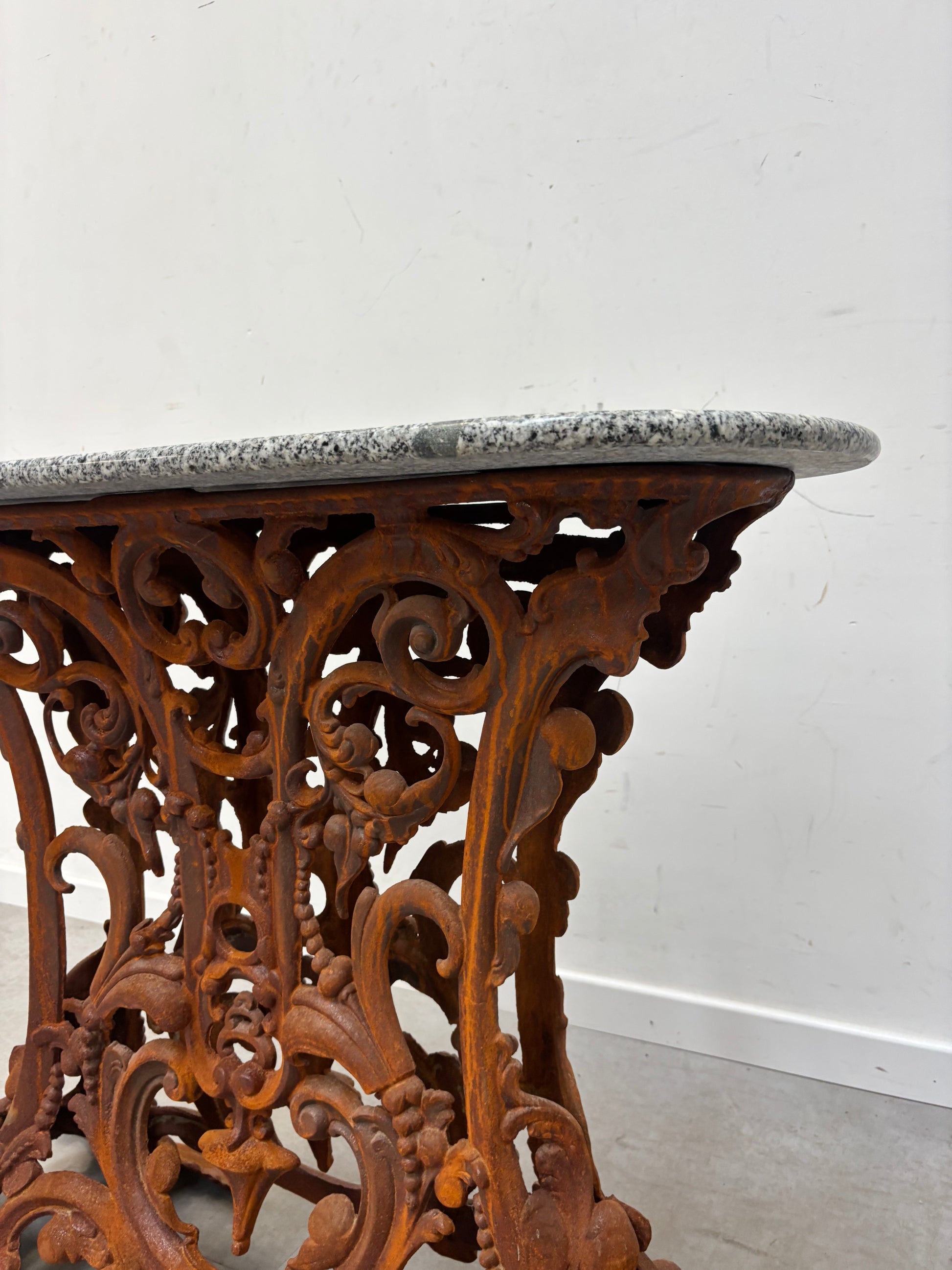 Een opvallende antieke consoletafel met een gedetailleerd gietijzeren onderstel en een gepolijst granieten blad. Het sierlijke ijzerwerk heeft een rijke patina met krullende blad- en bloemmotieven, kenmerkend voor het vakmanschap van eind 19e en begin 20e eeuw. Het zware granieten blad, in grijs-witte tinten, contrasteert prachtig met het roestkleurige onderstel en creëert een tijdloze uitstraling.