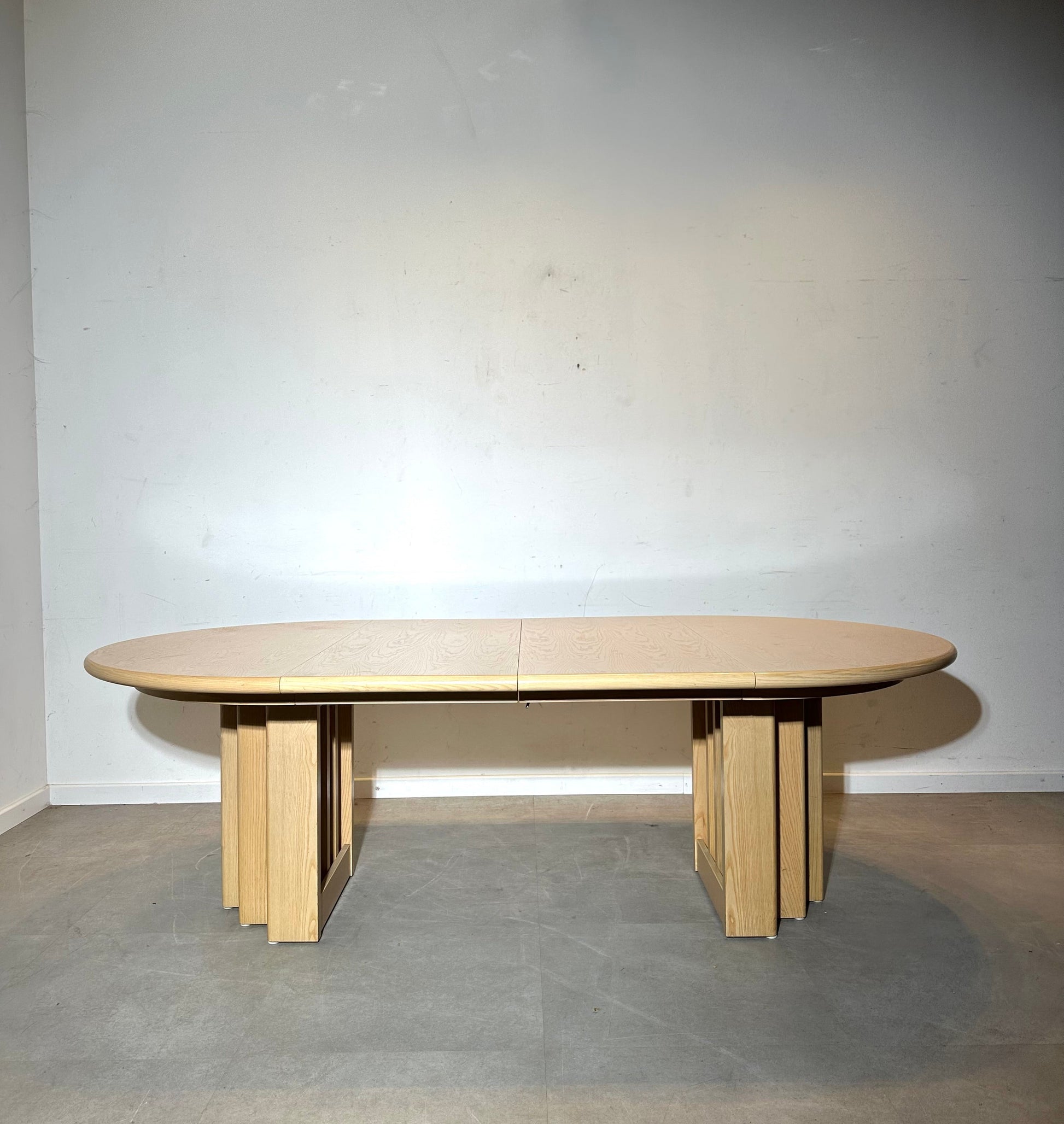 Deze indrukwekkende COR-eettafel heeft een prachtig afgerond ovaal blad van natuurlijk eikenhout, dat rust op een opvallende architectonische voet bestaande uit verticale eikenhouten lamellen. De sculpturale structuur geeft de tafel een sterke visuele identiteit, terwijl de minimalistische en tijdloze elegantie behouden blijft.