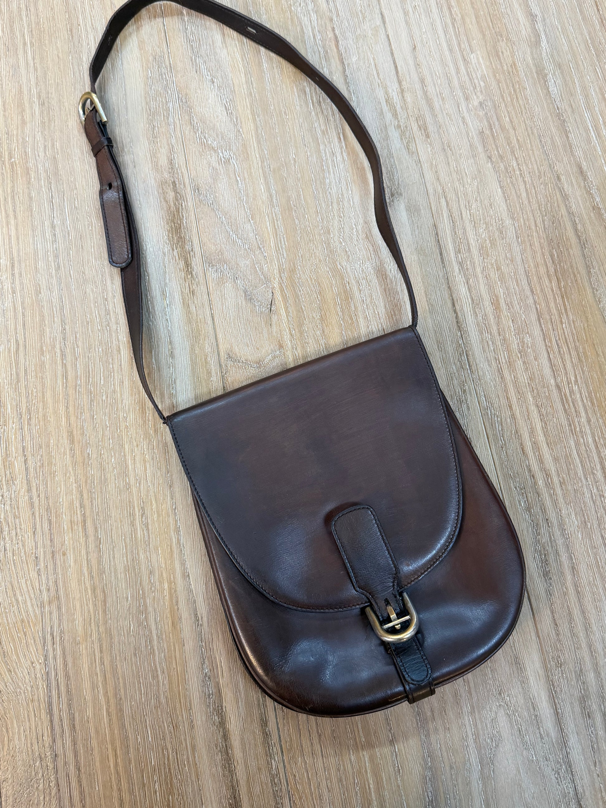 Elegant and timeless Delvaux crossbody bag in dark brown leather, featuring the classic rounded flap design with a refined buckle closure. A perfect everyday vintage piece with a clean, minimal silhouette and beautiful patina.