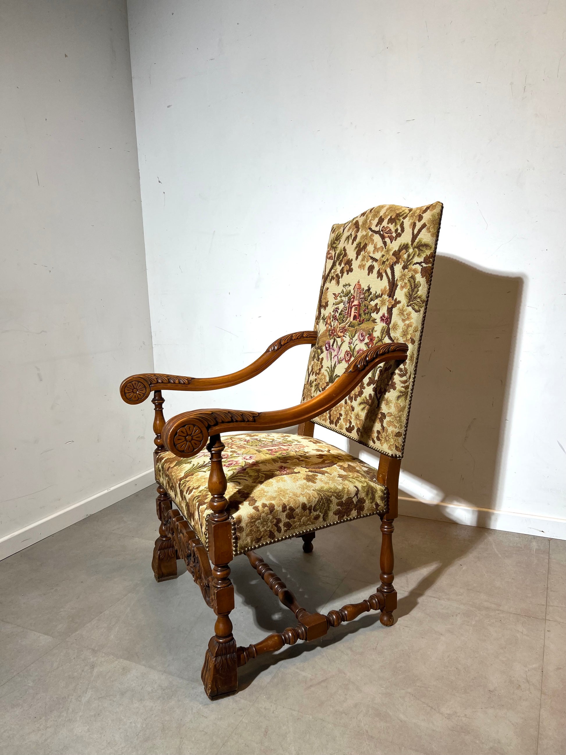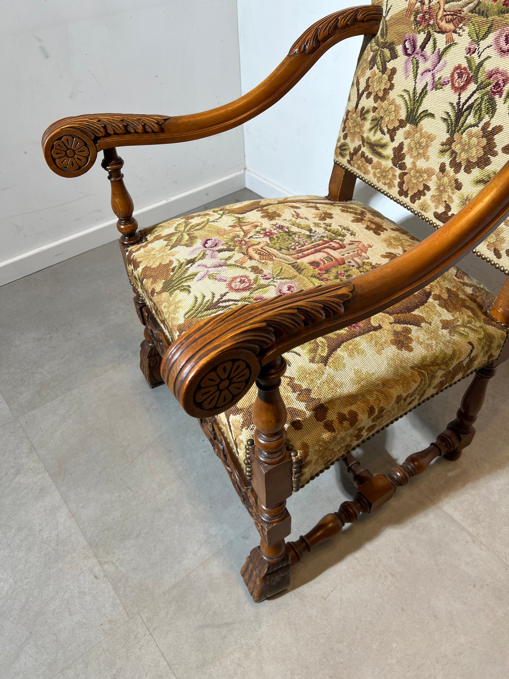 ge Carved Wooden Armchair with Tapestry Upholstery