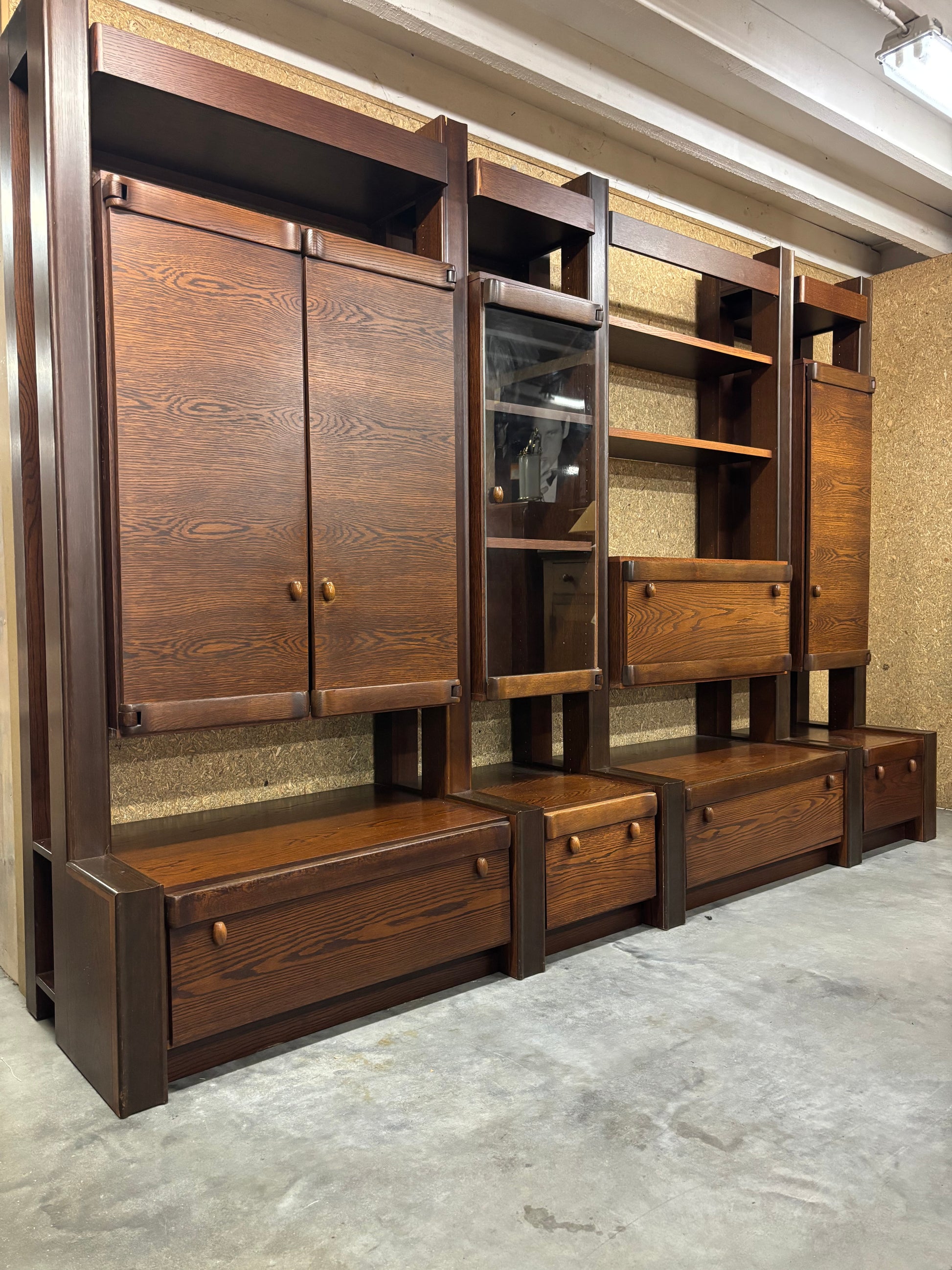 Deze opvallende, vintage modulaire wandkast bestaat uit vier afzonderlijke elementen die eenvoudig te demonteren en opnieuw te rangschikken zijn. Vervaardigd uit rijk wengéhout, biedt de kast een verfijnde combinatie van open planken, lades en gesloten kasten, en combineert zo functionele opbergruimte met een sculpturale uitstraling. Geïntegreerde verlichting benadrukt het vakmanschap en versterkt de warme, mid-century esthetiek.