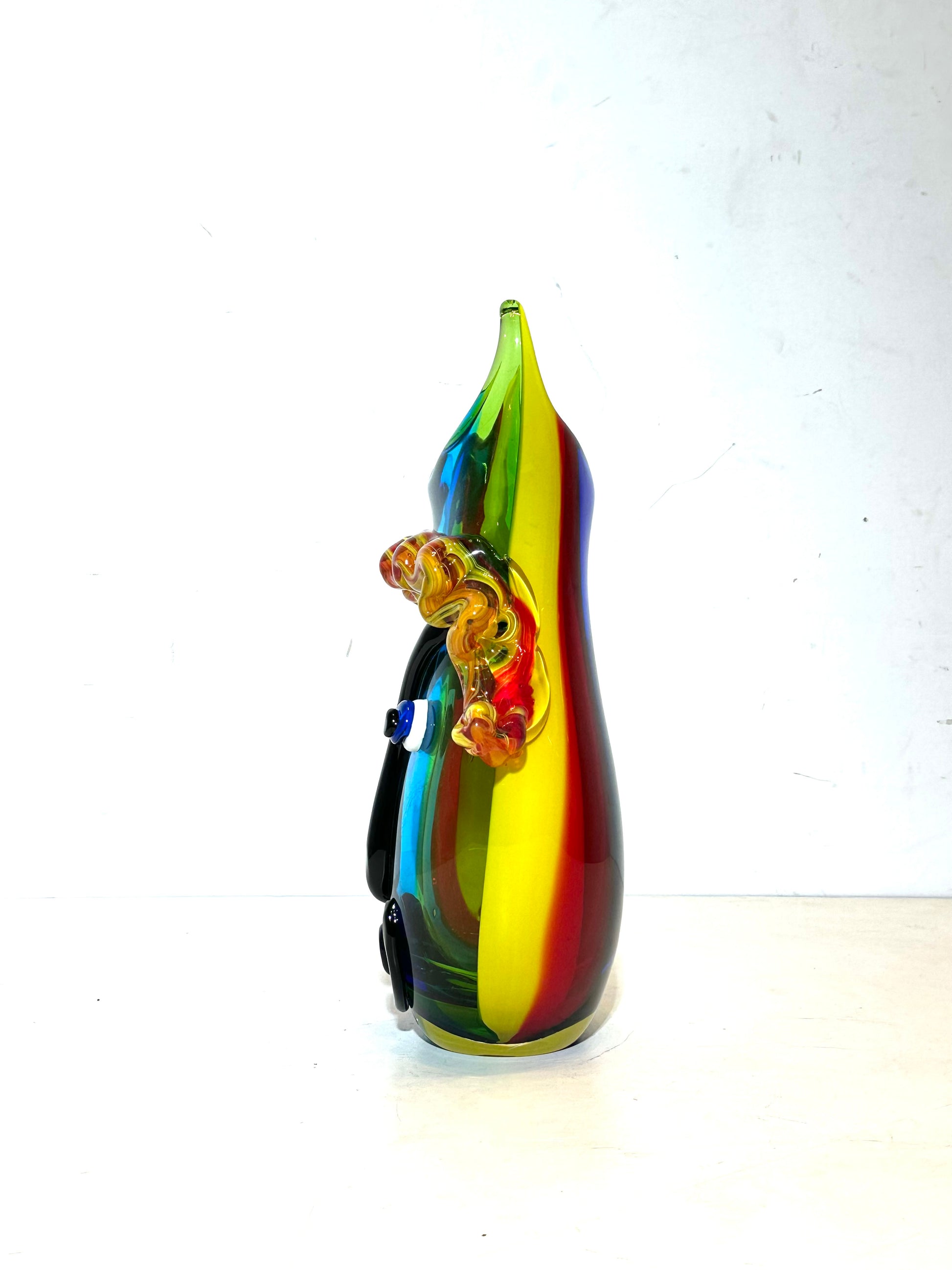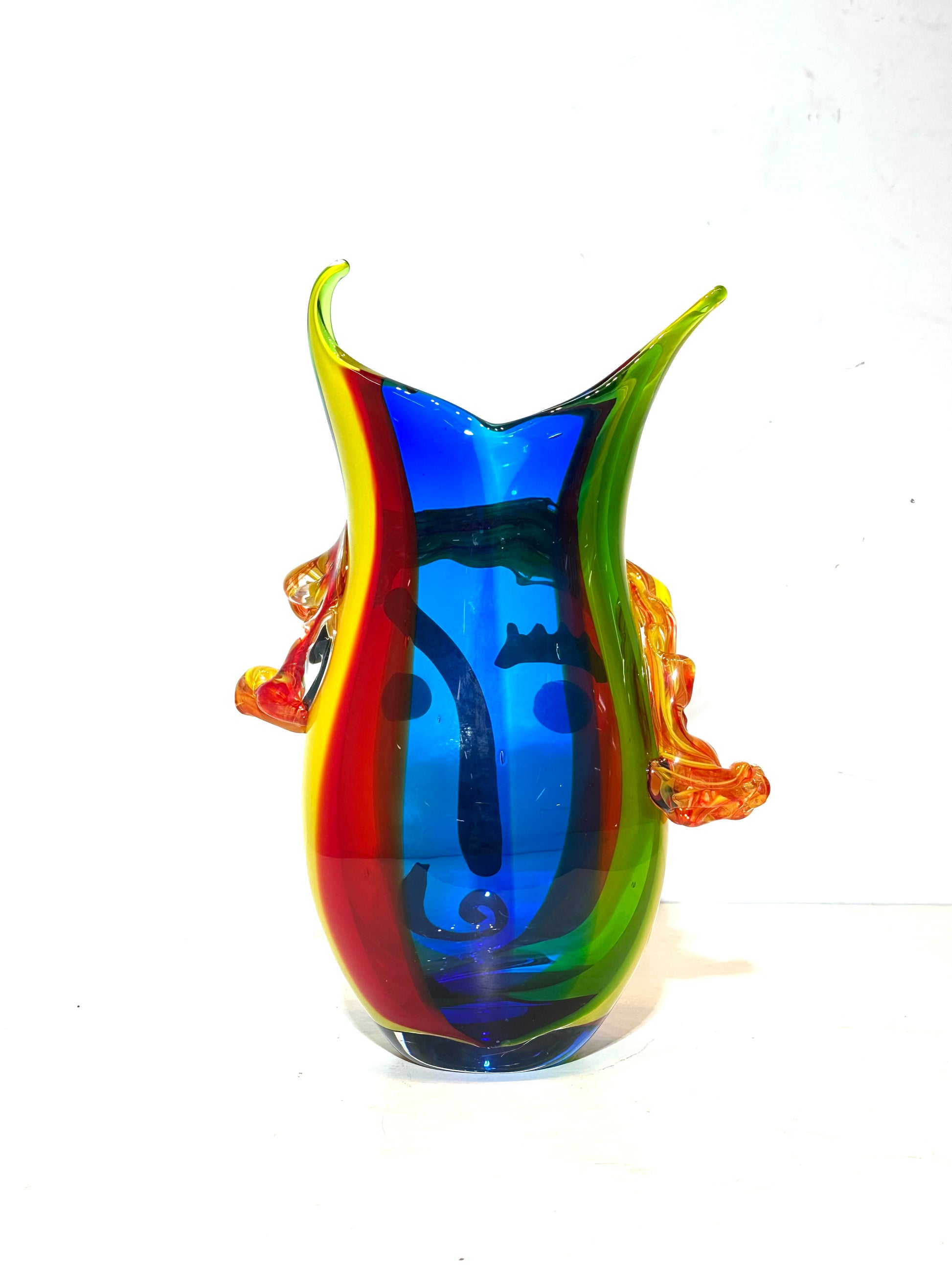 Een opvallende glazen vaas, vervaardigd in levendige, veelkleurige tinten. Dit handgeblazen stuk is voorzien van een sculpturaal gezichtsmotief, waarin speelse, surrealistische details zijn verwerkt. De levendige kleurgadiënten van blauw, rood, groen en geel vloeien harmonieus in elkaar over, terwijl de expressieve krullen en gezichtselementen een unieke artistieke uitstraling geven.