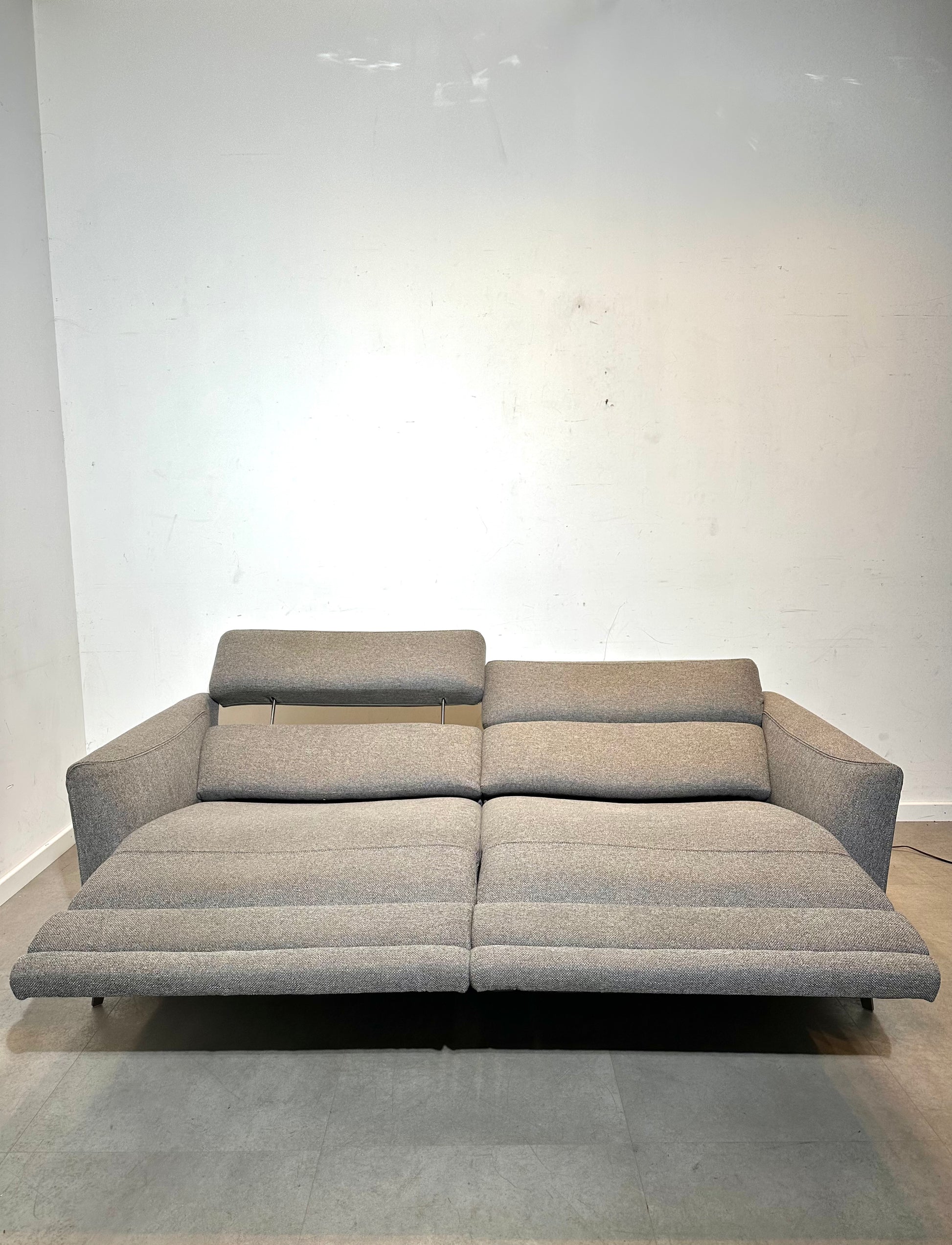 Deze bank is voorzien van twee elektrische relaxfauteuils waarmee beide zitvlakken afzonderlijk kunnen worden versteld, voor een ontspannen loungehouding. De verstelbare hoofdsteunen zorgen voor optimale ergonomische ondersteuning, terwijl de zachte grijze geweven bekleding een eigentijdse en tijdloze uitstraling geeft.