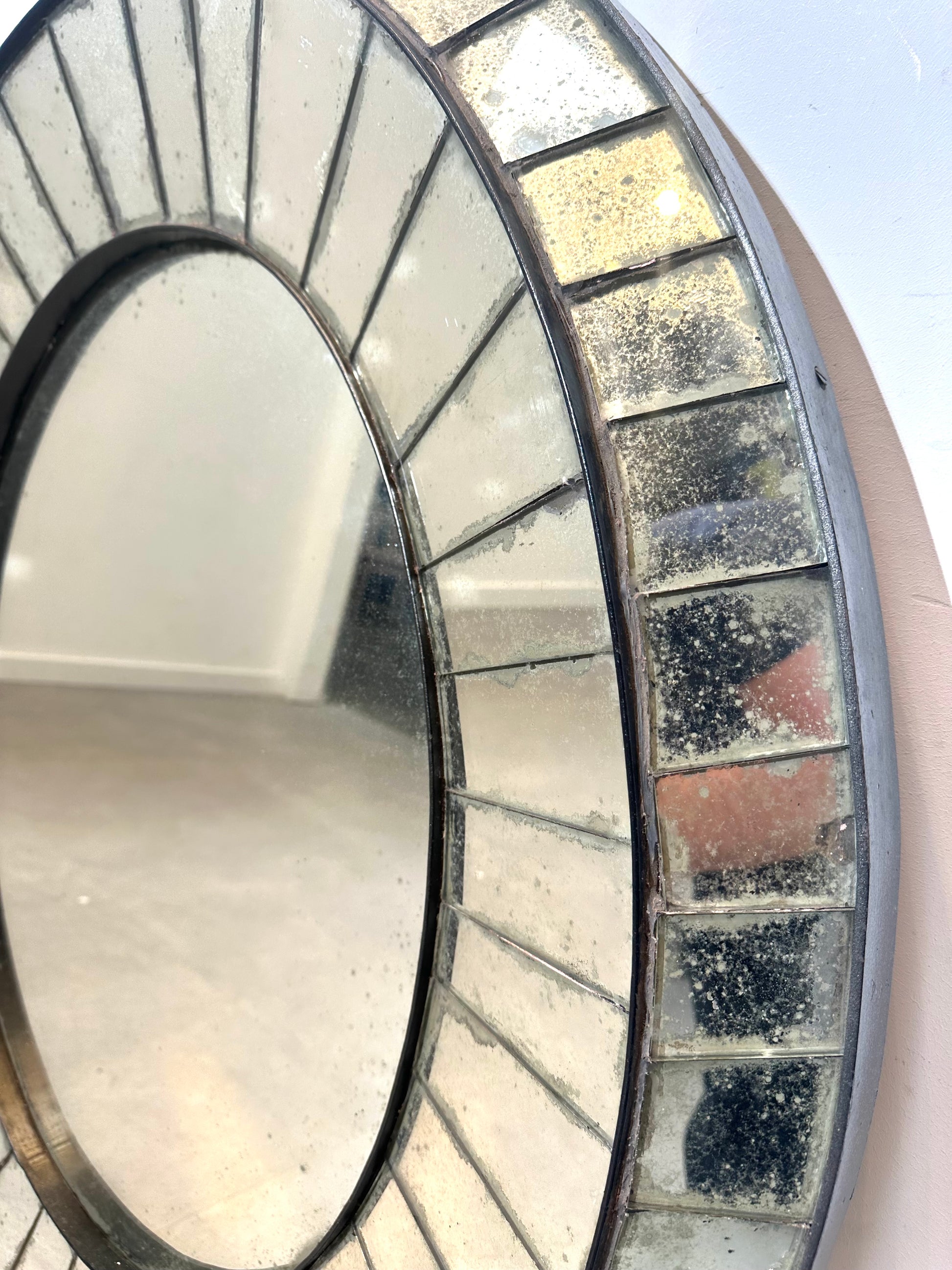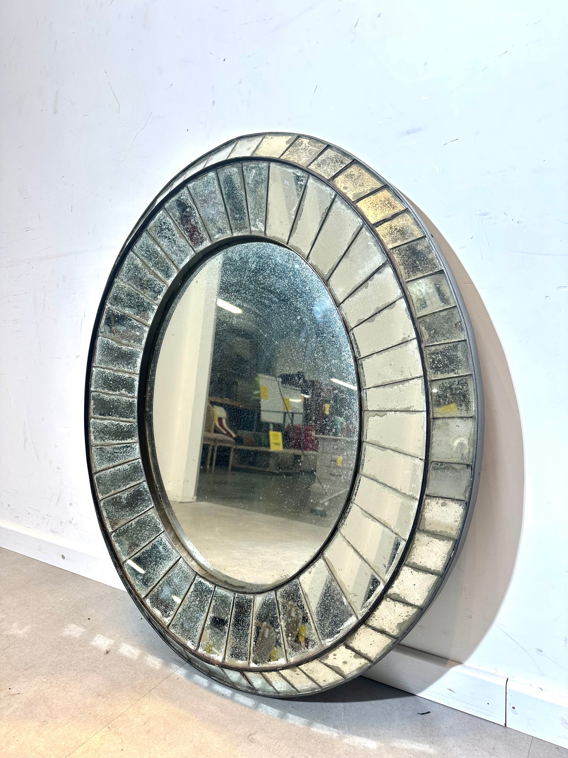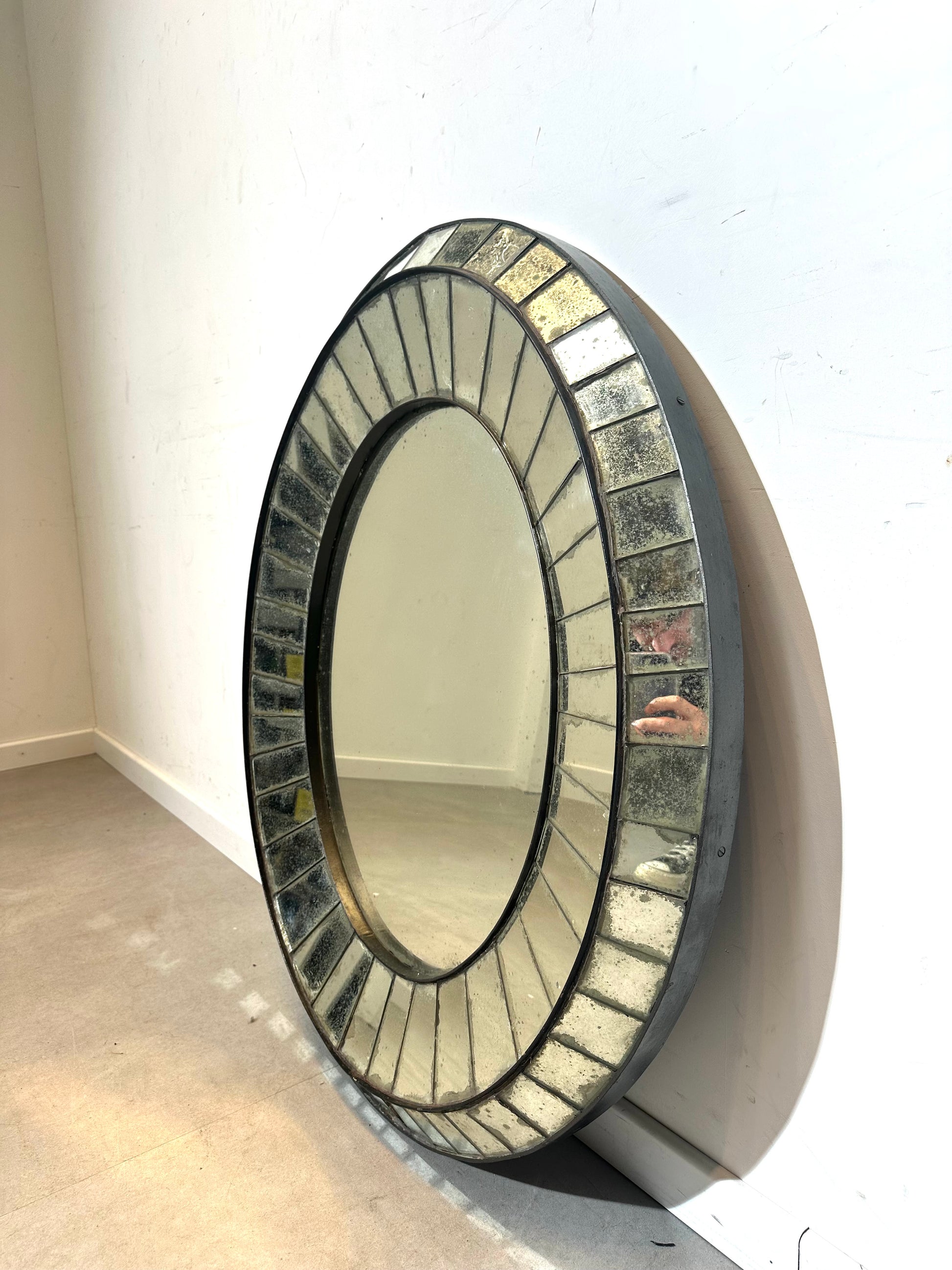 Deze prachtige ronde spiegel voegt tijdloze elegantie en charme toe aan elk interieur. Met een fraai gesegmenteerd frame van facetgeslepen spiegelglas straalt hij een rijke, Venetiaanse esthetiek uit. Het oppervlak vertoont een subtiele antieke patina, wat de spiegel een authentieke, verouderde uitstraling geeft en zijn vintage karakter versterkt.