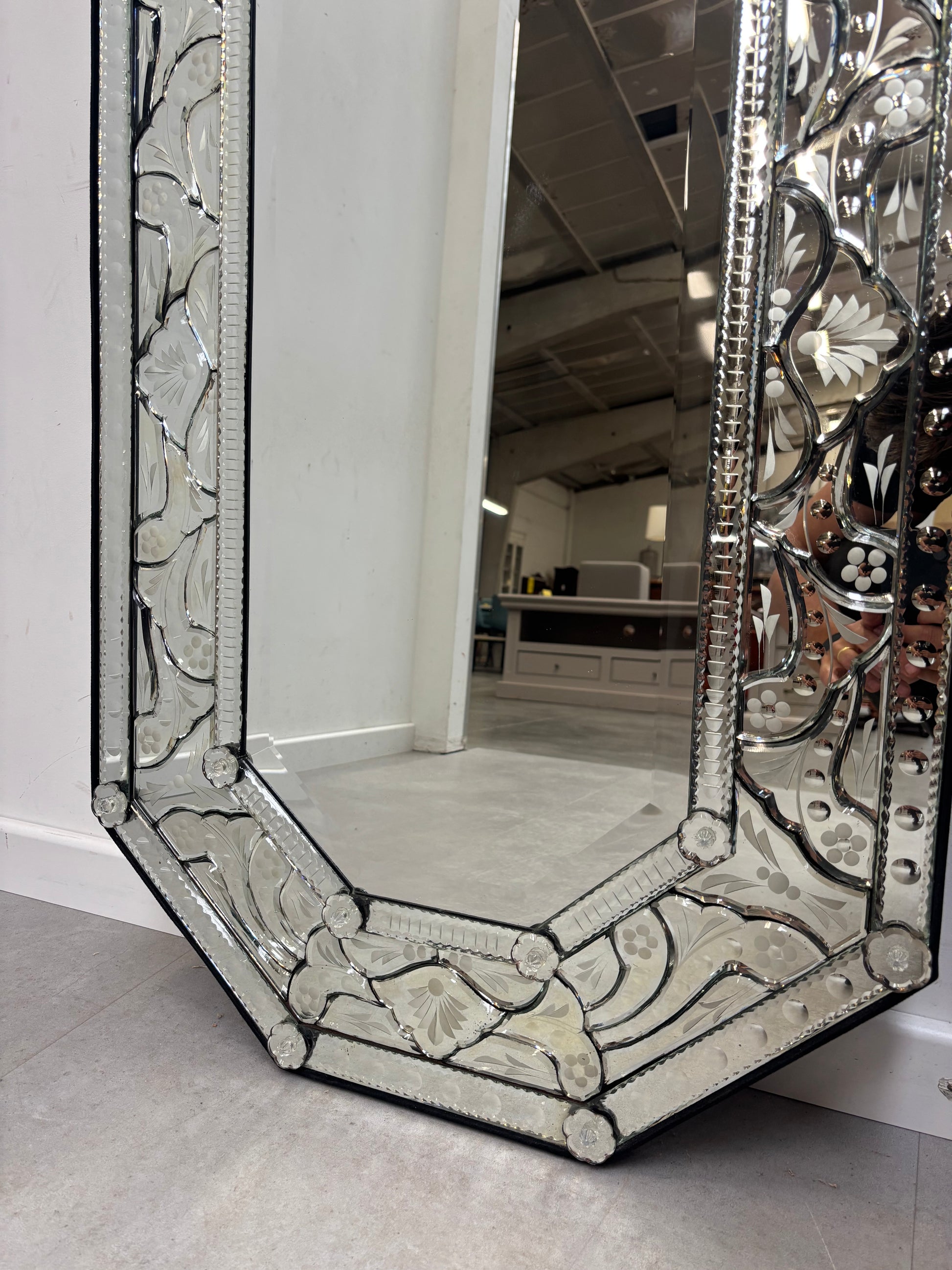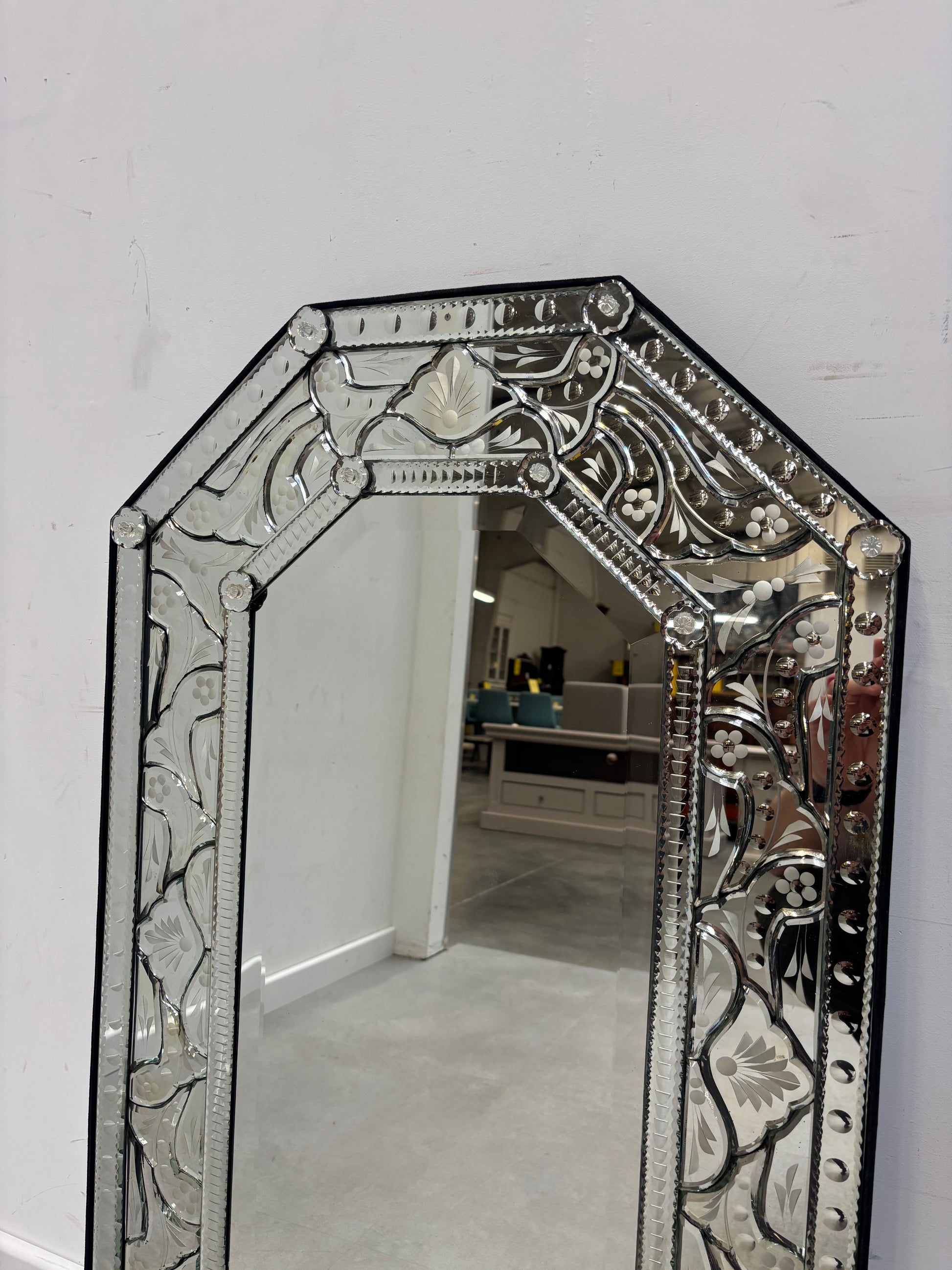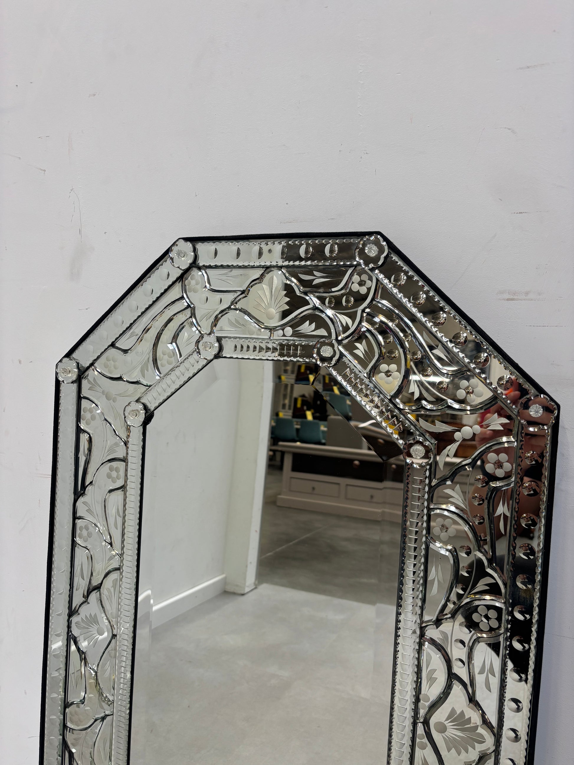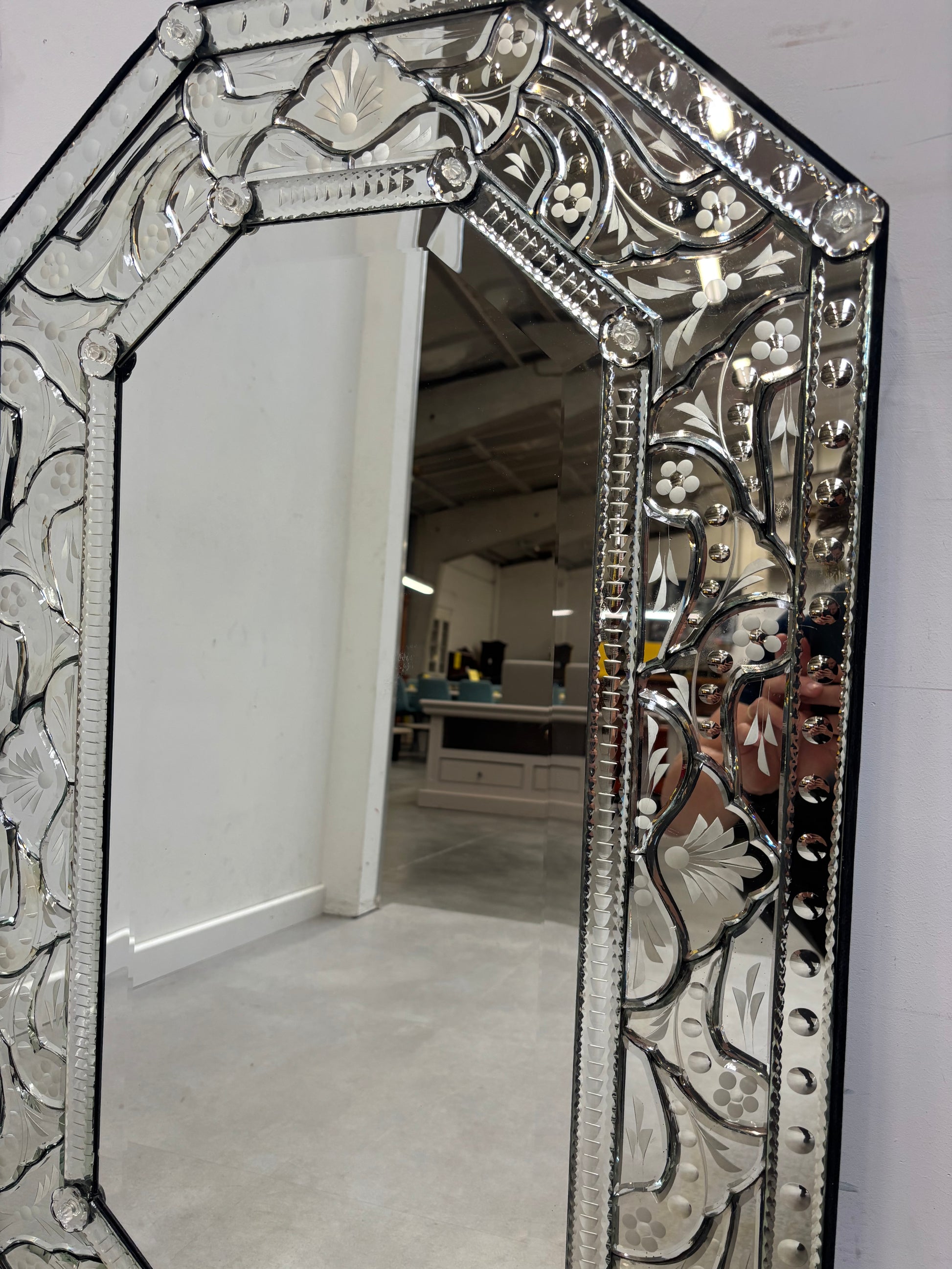Deze spiegel, vervaardigd met facetgeslepen glas en fijn gegraveerde bloem- en bladmotieven, belichaamt het verfijnde vakmanschap waar Venetiaanse spiegels om bekend staan. De achthoekige vorm voegt een opvallend decoratief element toe, waardoor het een blikvanger is in zowel klassieke als moderne interieurs.