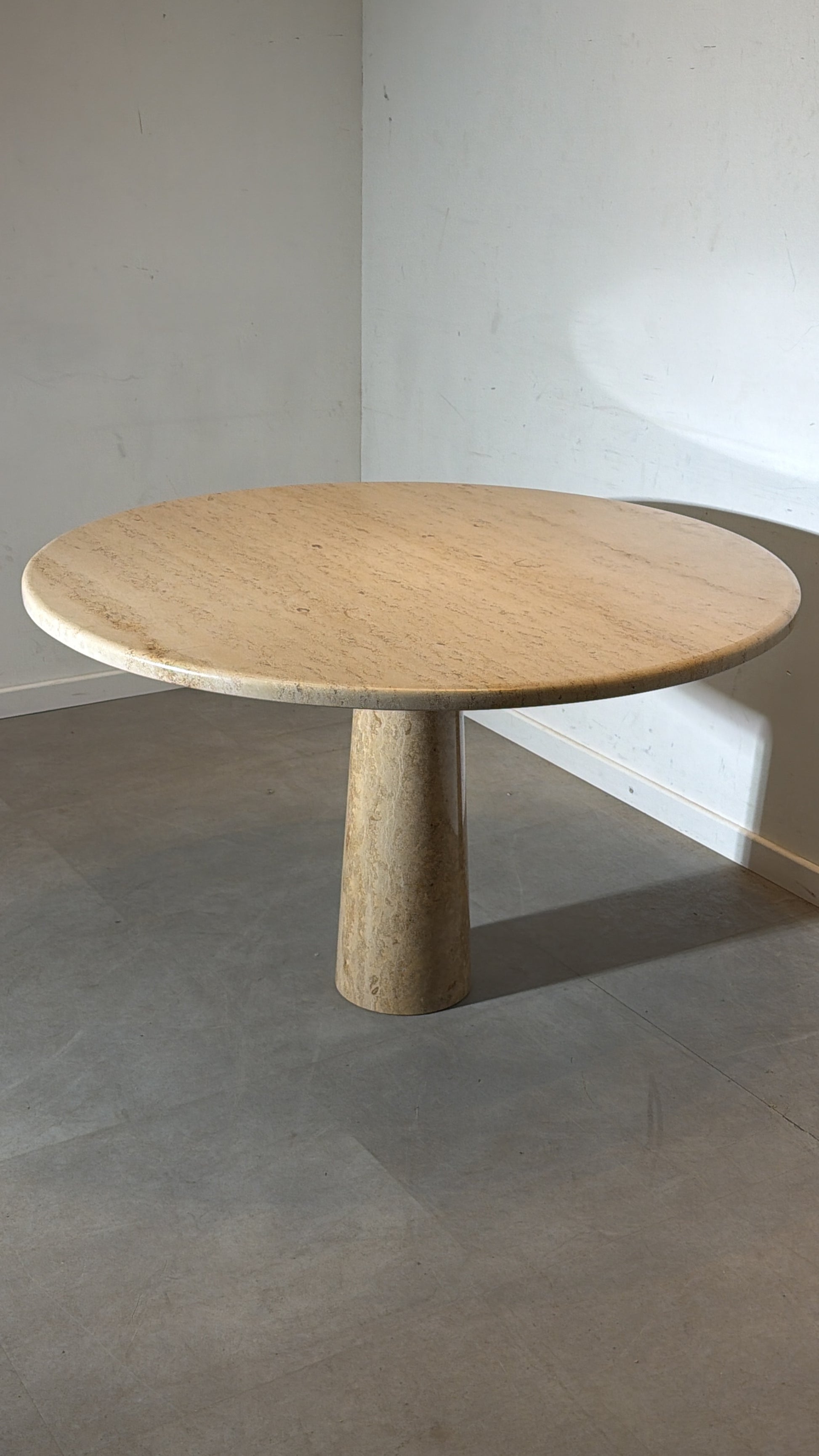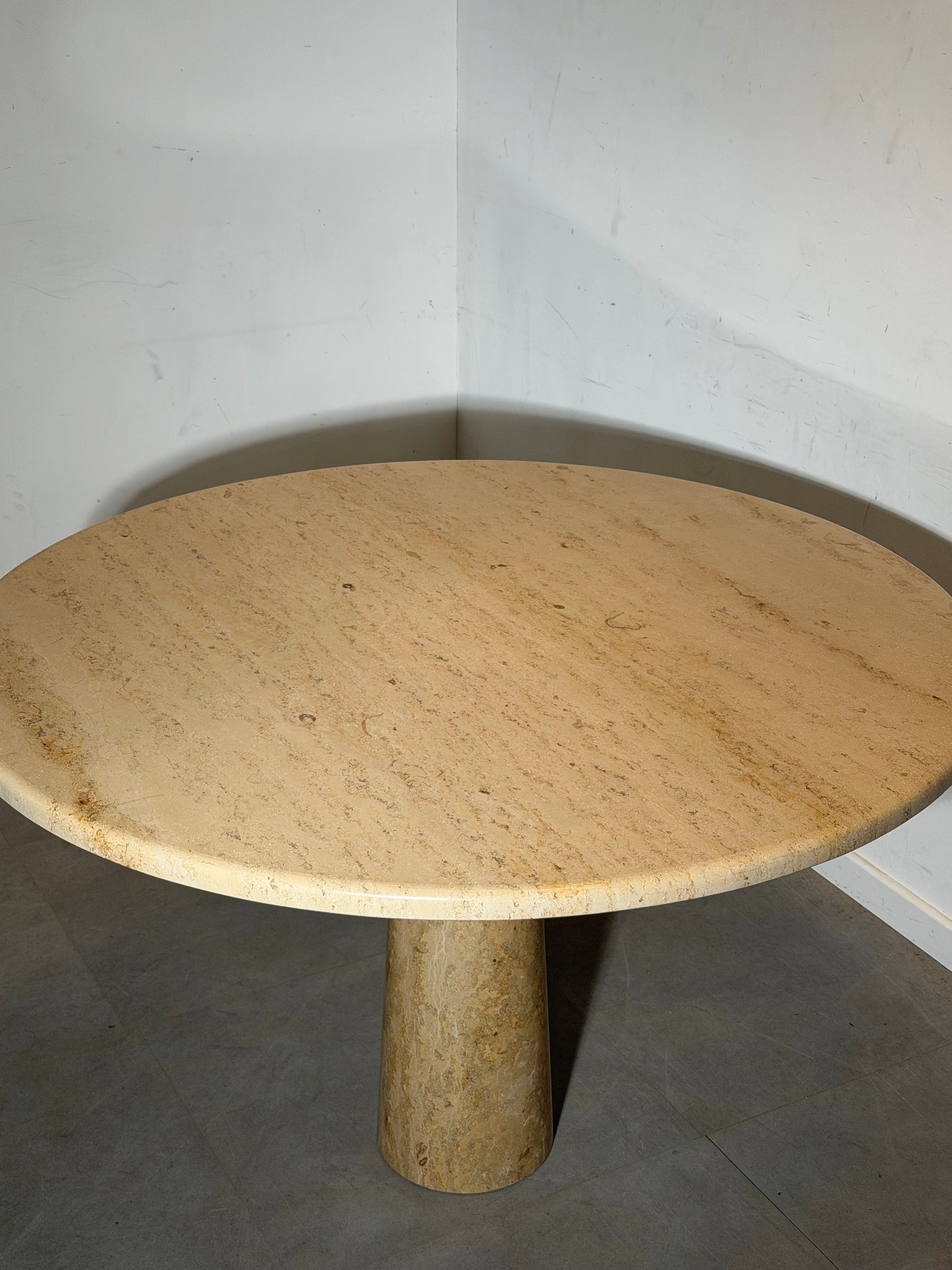Beautiful vintage design dining table executed entirely in solid Jura limestone. The table features a thick round top resting on a conical monolithic base (cone foot), giving it a sculptural and architectural presence. The clean geometry combined with the organic texture of the stone creates a perfect balance between minimalism and natural material warmth.