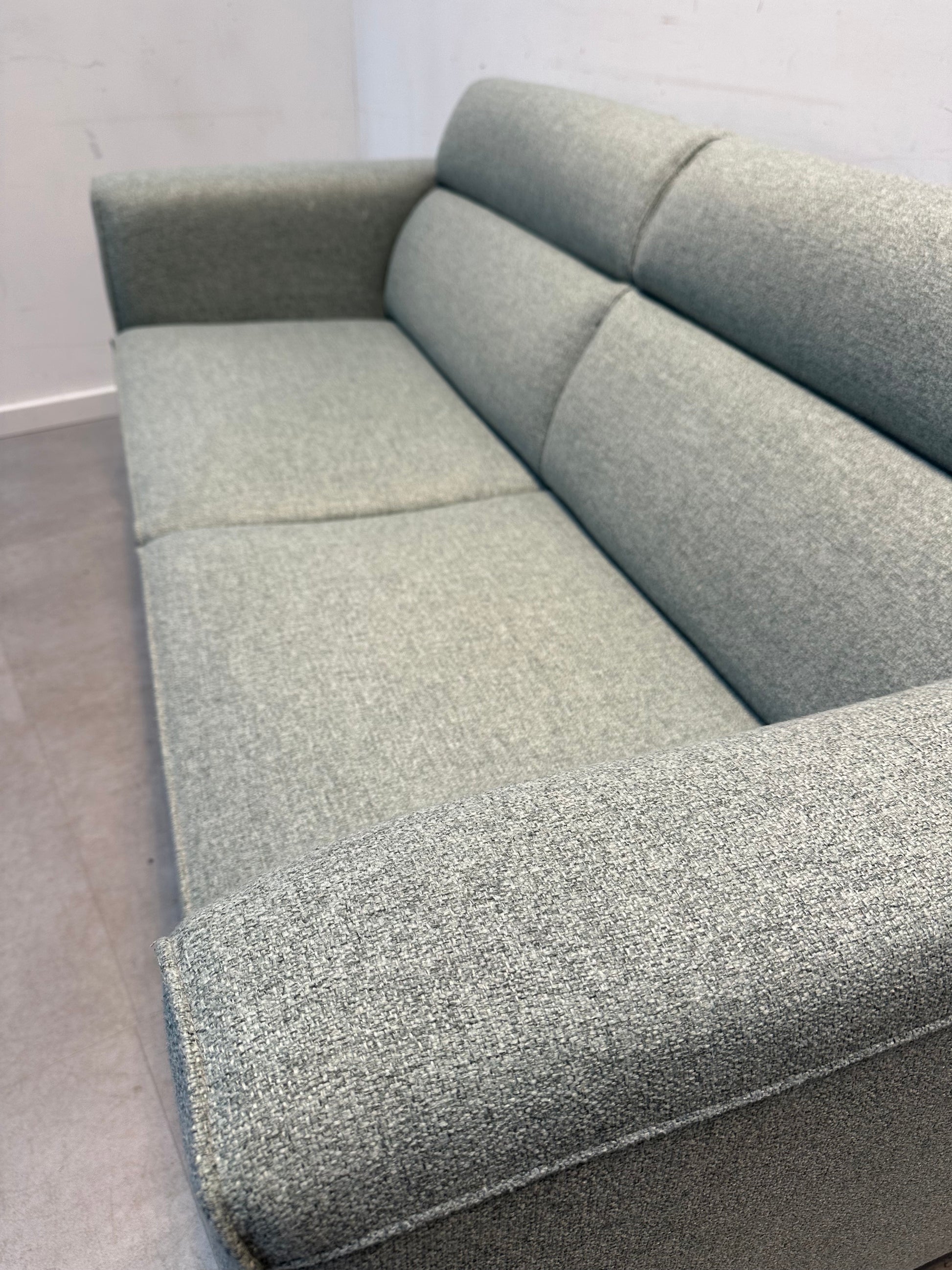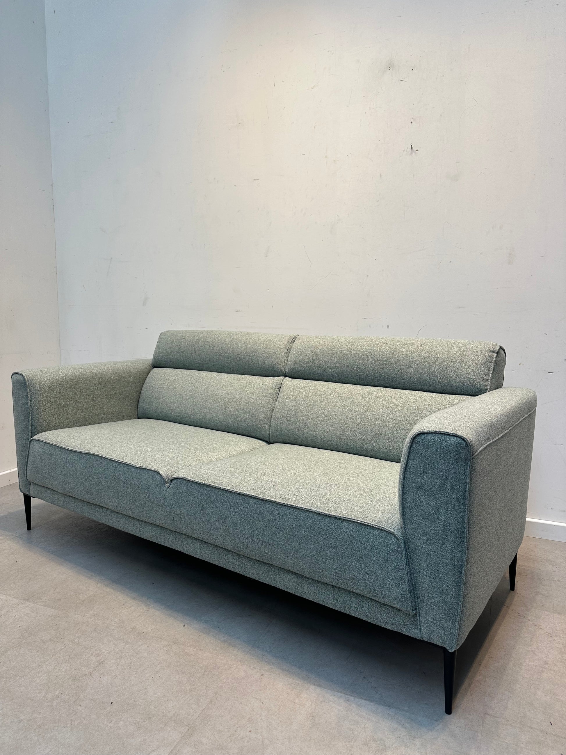 Compacte, moderne 2-zitsbank van XOOON in een zachte saliegroene gemêleerde stof. De slanke armleuningen en dunne zwarte metalen poten geven de bank een lichte, eigentijdse uitstraling die perfect past in minimalistische tot Scandinavische interieurs. Comfortabele, ondersteunende zitplaatsen met een strak silhouet – ideaal voor woonkamers, kantoren of gastenkamers.