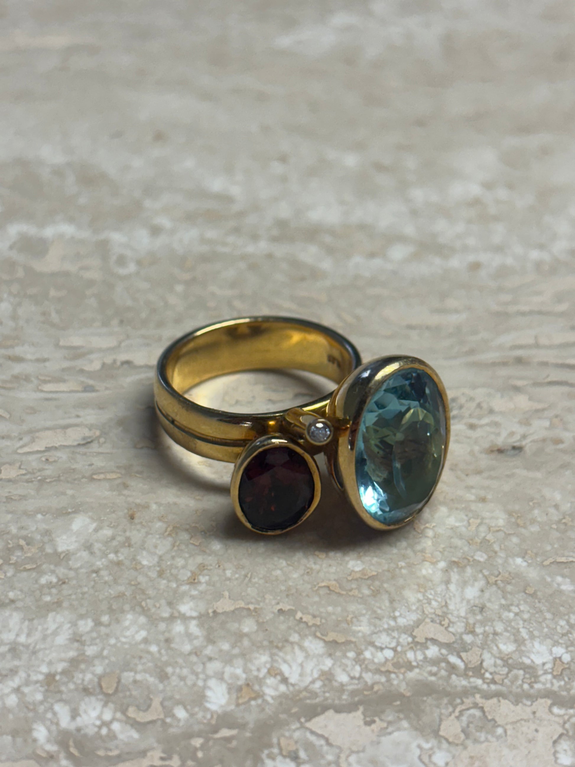 This striking 18 kt yellow gold ring combines vibrant colors and refined elegance in a modern, asymmetric design. A large, faceted oval blue topaz shimmers with ocean-blue tones, contrasted by a deep-red oval garnet. Between them, a small brilliant-cut diamond adds a subtle sparkle, tying the composition together beautifully.